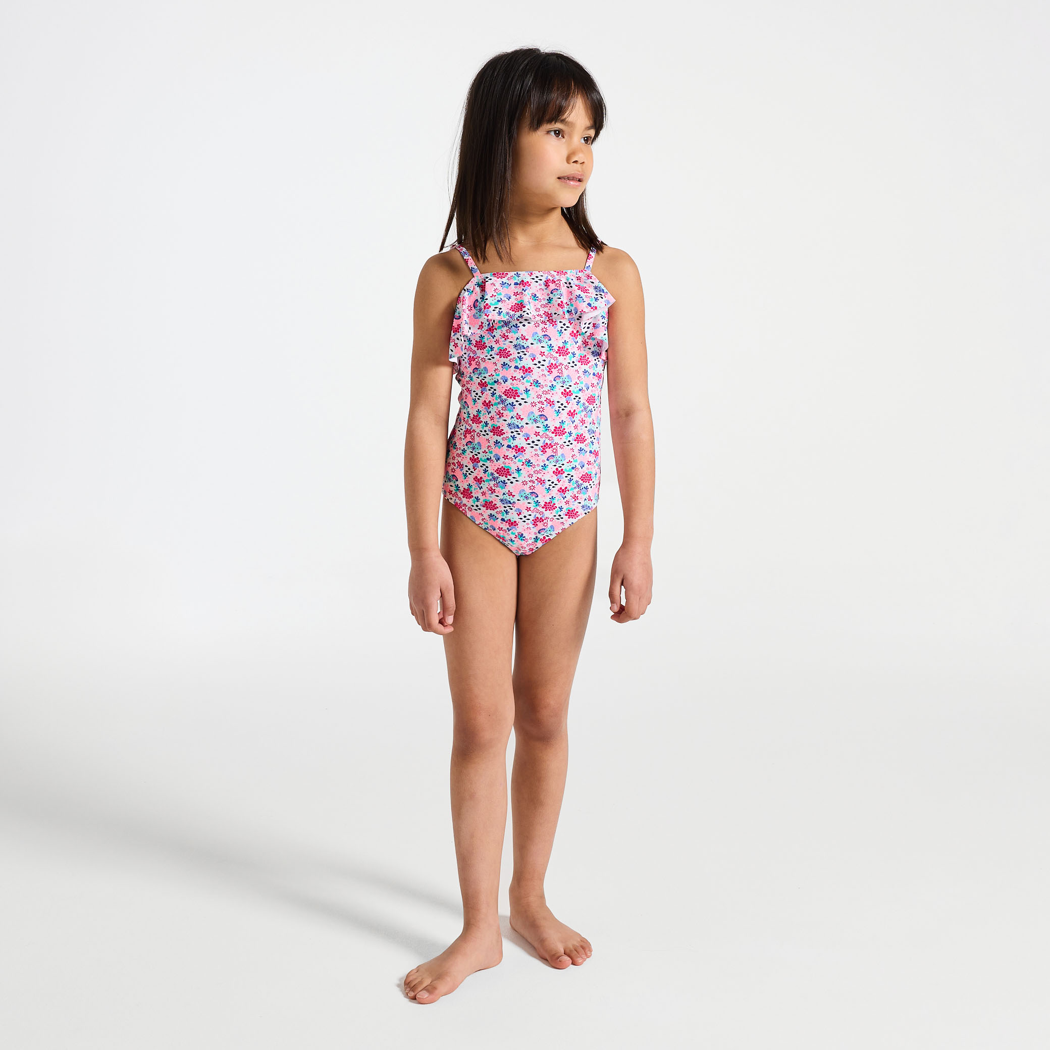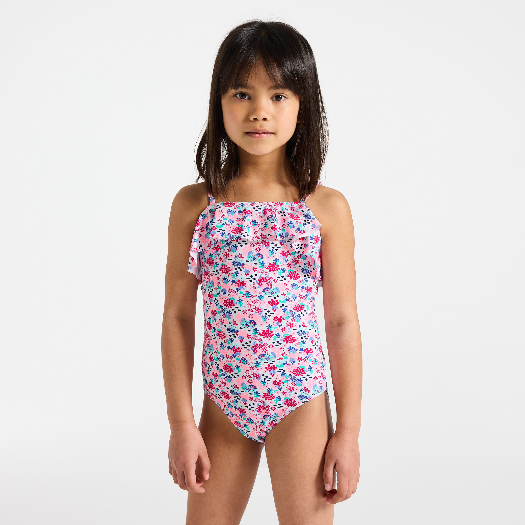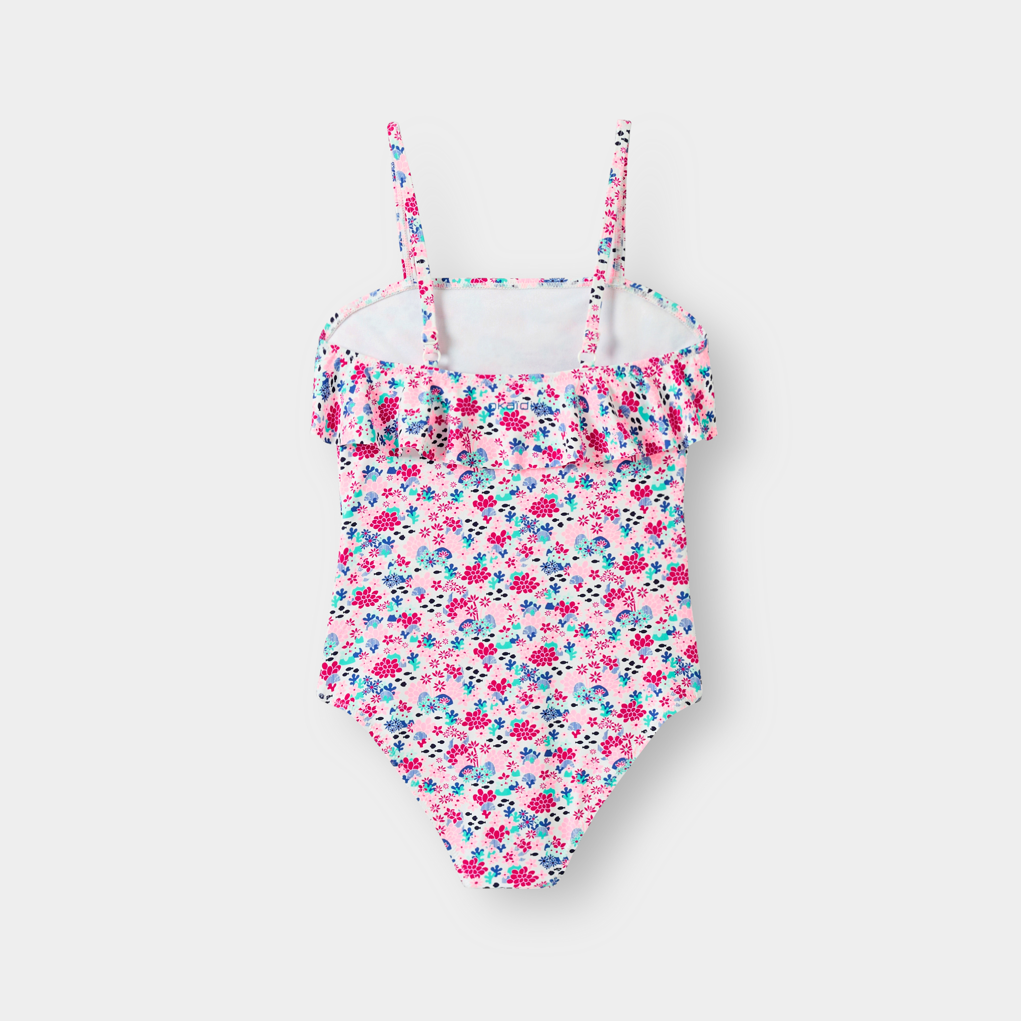 Розов бански с флорален принт за момичета, идеален за летните дни на плажа. Тънките презрамки и вталената кройка осигуряват комфорт и свобода на движение. Мека еластична материя за бързо съхнене. Елегантна волан отпред. Идеален за водни приключения и игри в басейна.