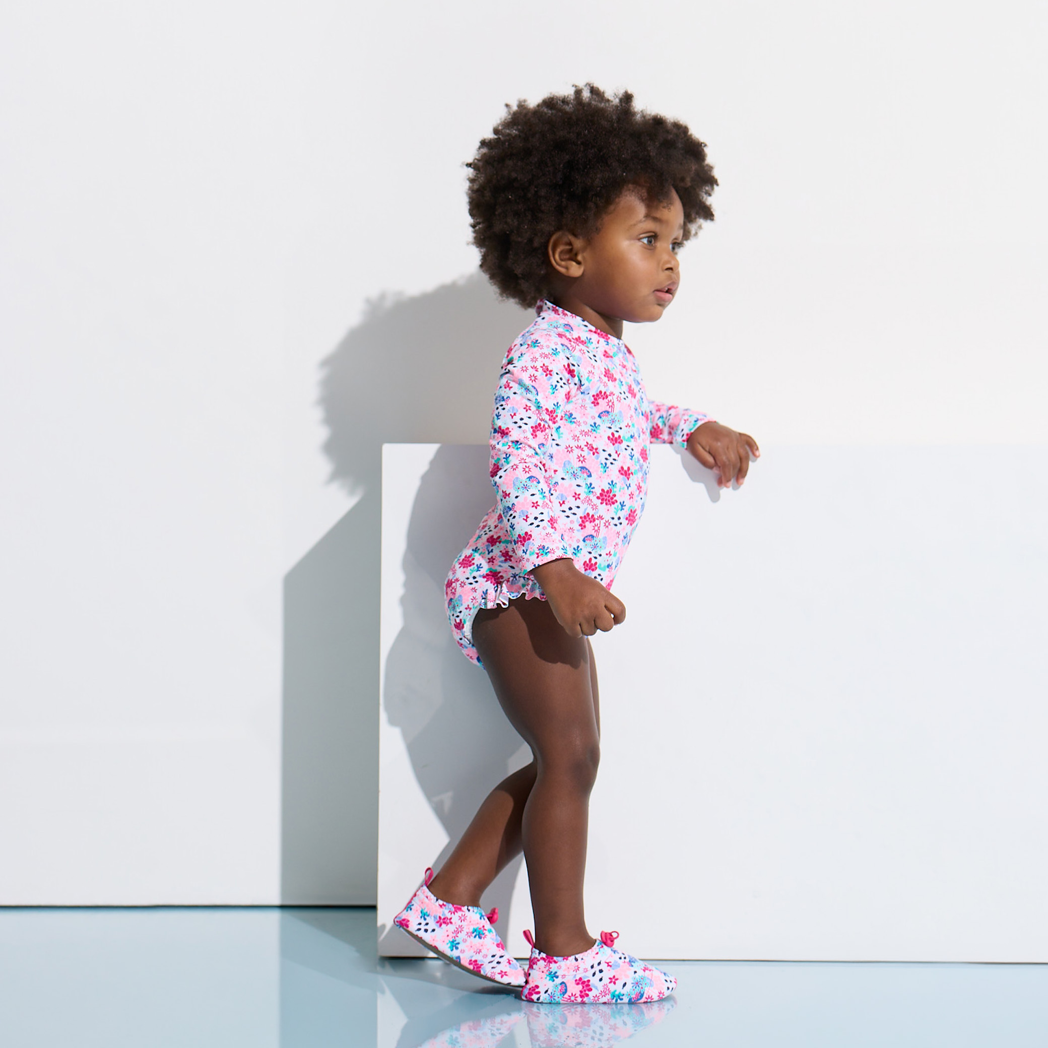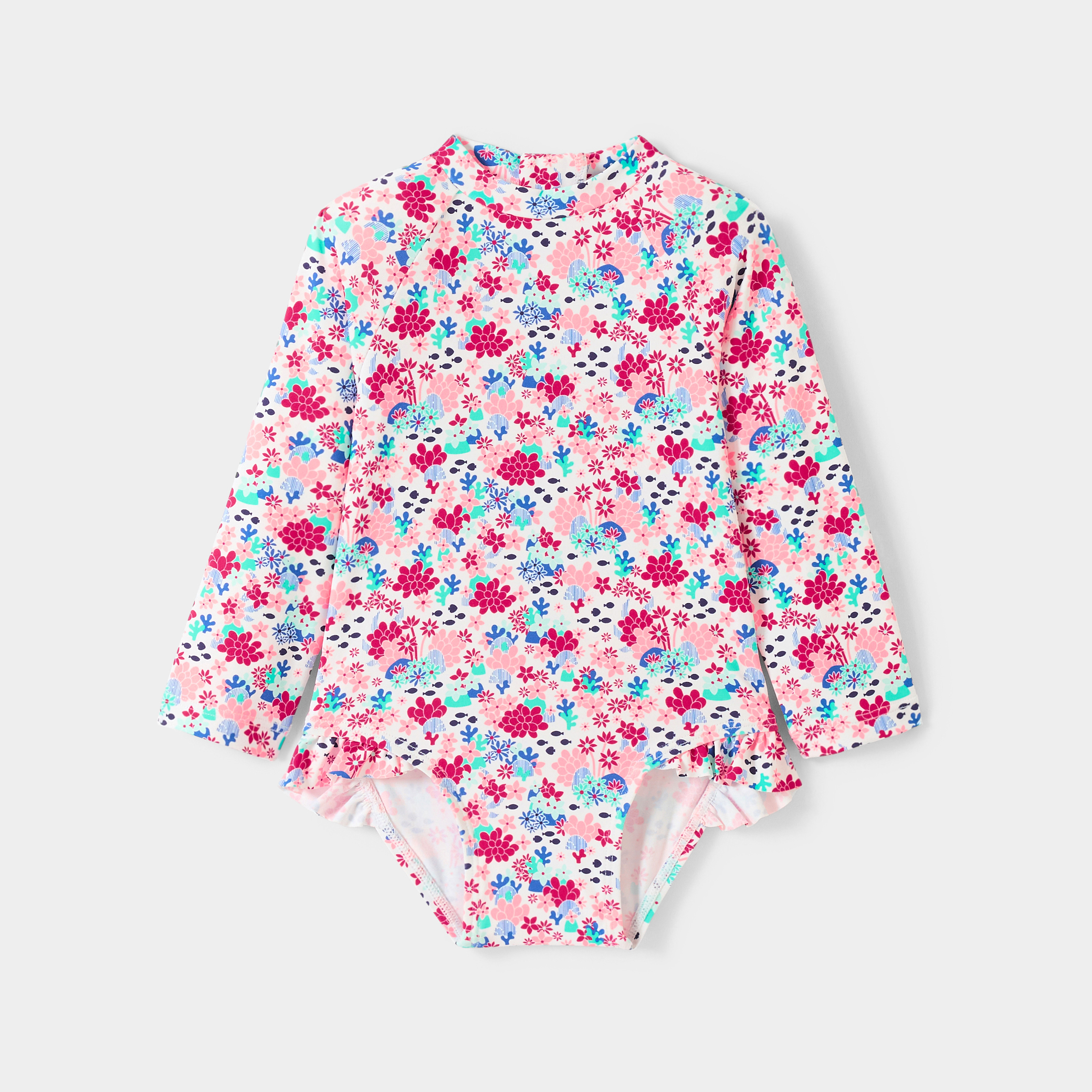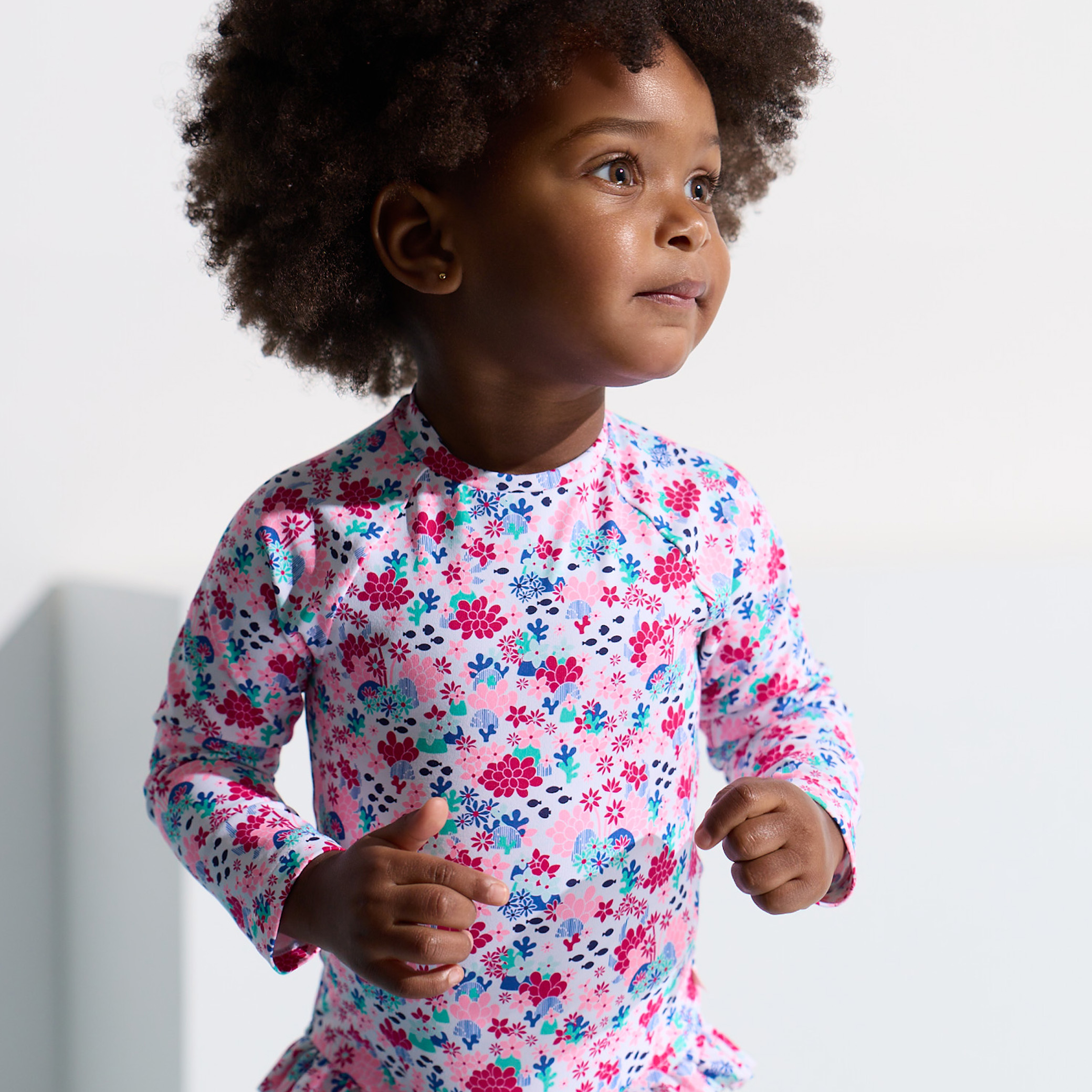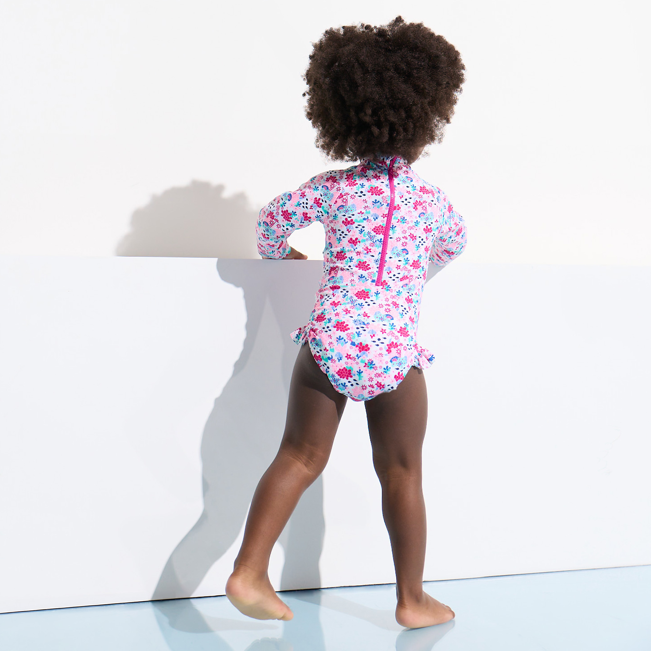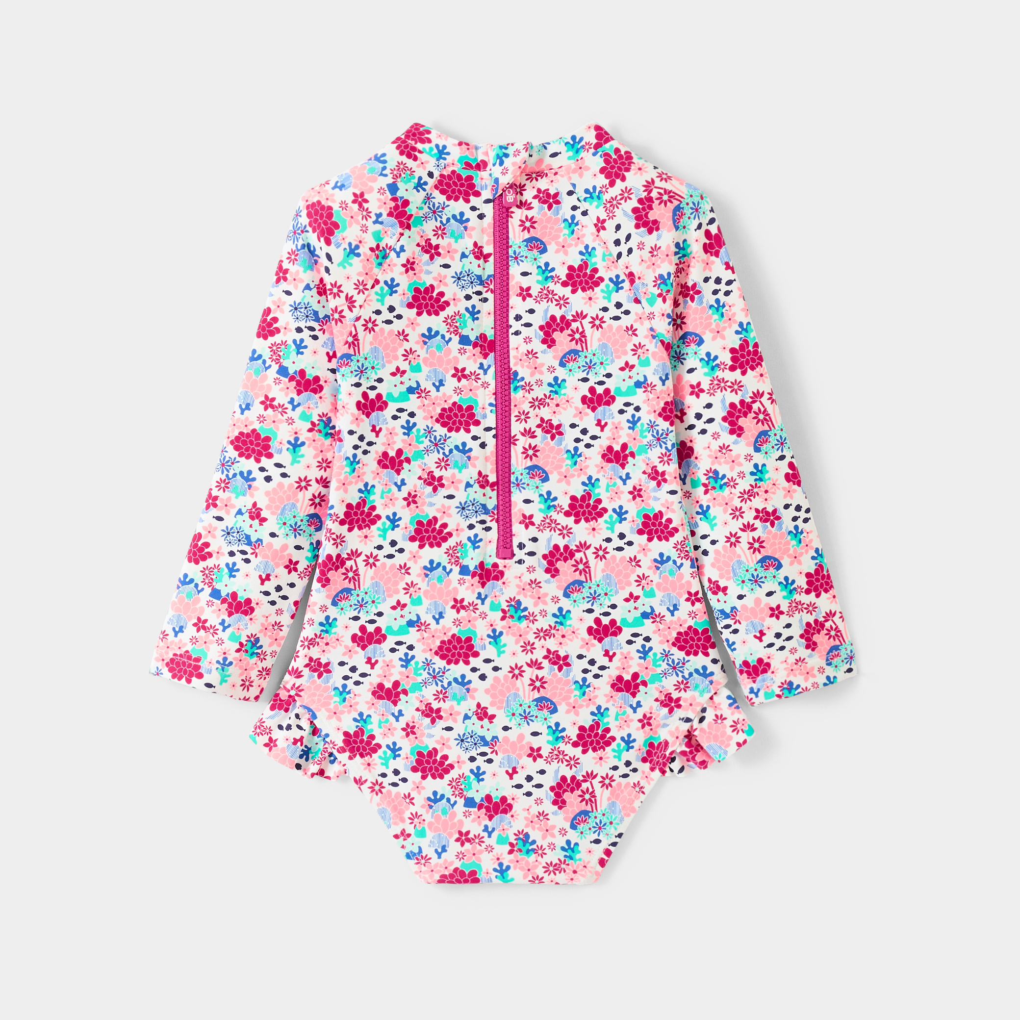 Задължителен артикул за водни забавления: този очарователен бански с дълъг ръкав и многоцветен флорален принт е перфектно допълнение към вашия куфар за почивка. Изработен от мека, еластична материя за максимален комфорт, той е идеален за игра на плажа. Перфектен за малки водни изследователи. Лесен за обличане благодарение на ципа на гърба.