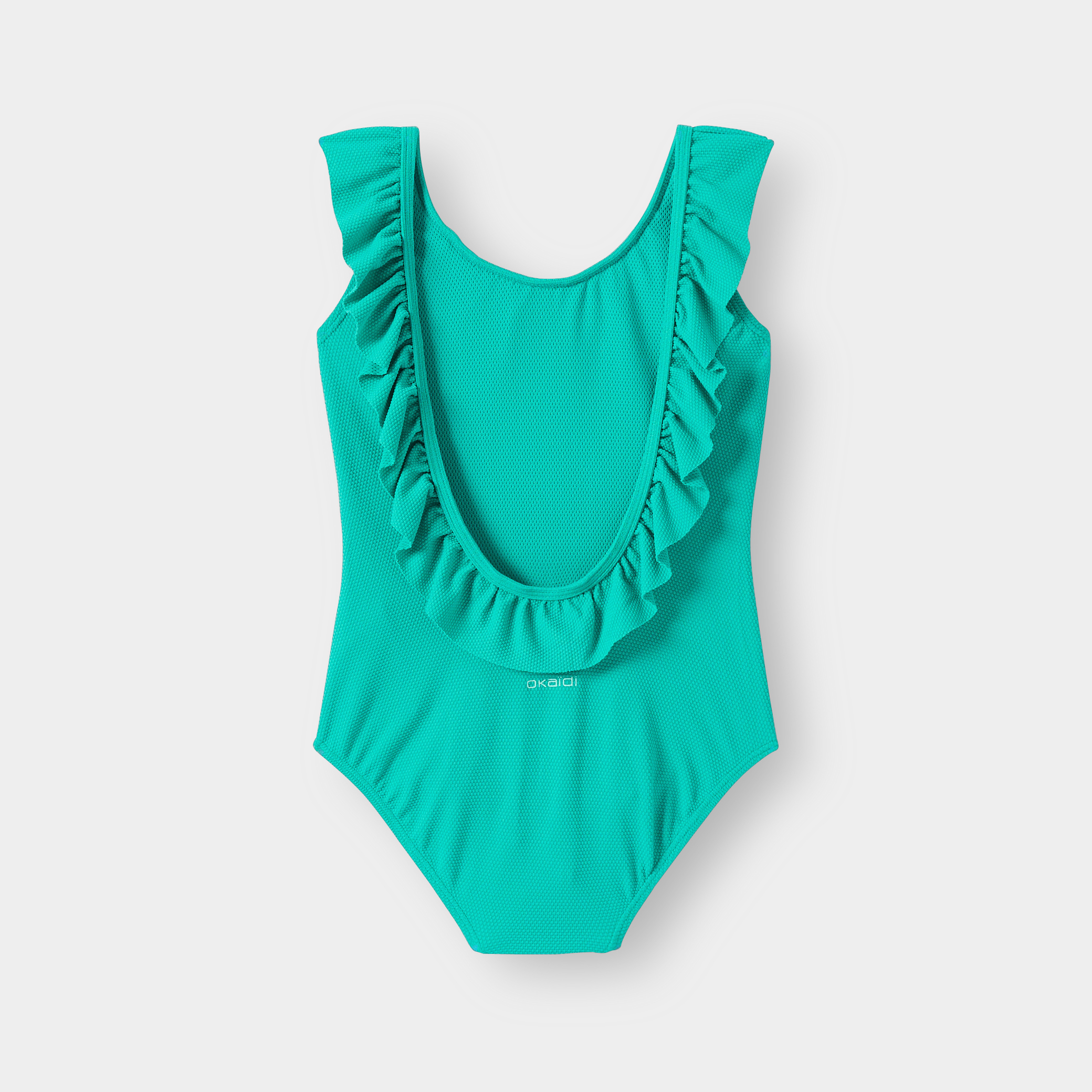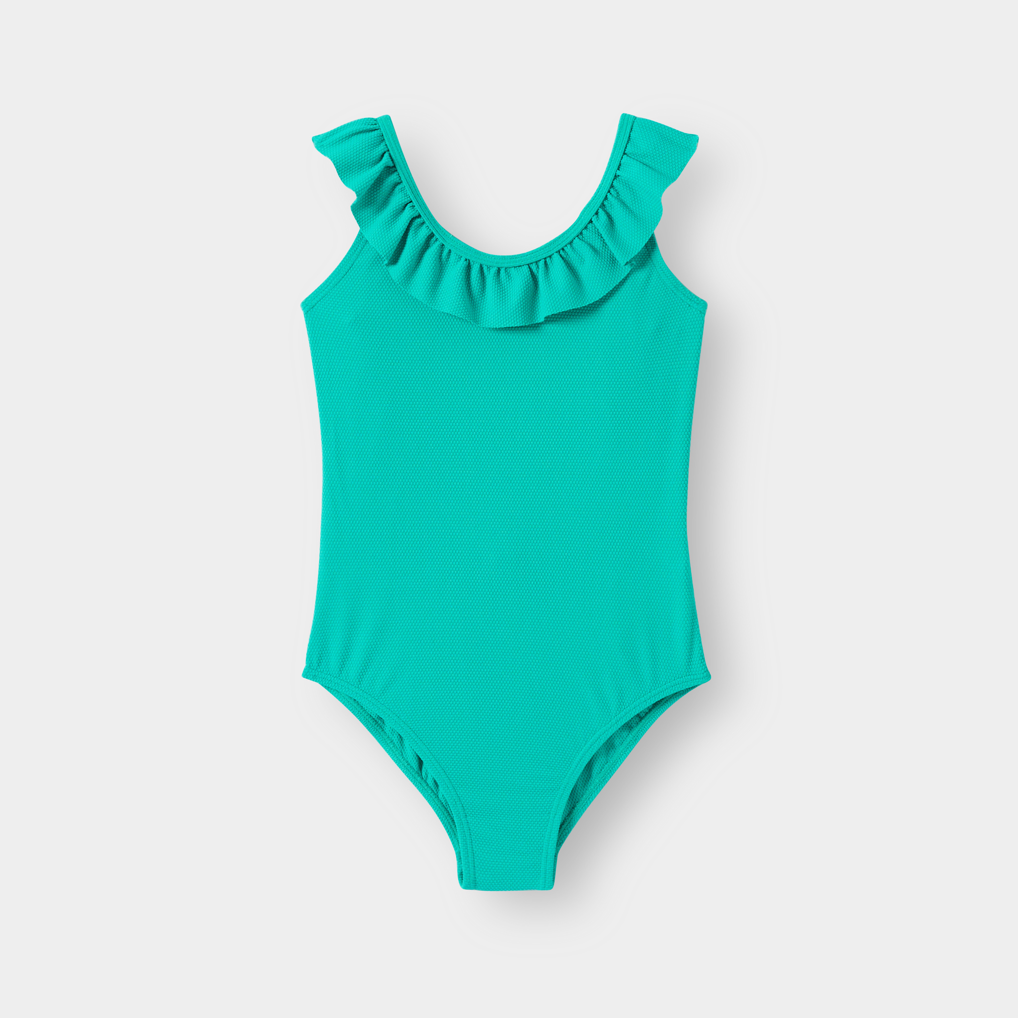 Тюркоазен бански костюм с деколте с волани за повече фантазия. Изработен е от издръжлива еластична материя, идеална за забавление във водата. Идеален за слънчевите дни на плажа или басейна. Лесен за обличане за оптимален комфорт и пълна свобода на движенията.Състав