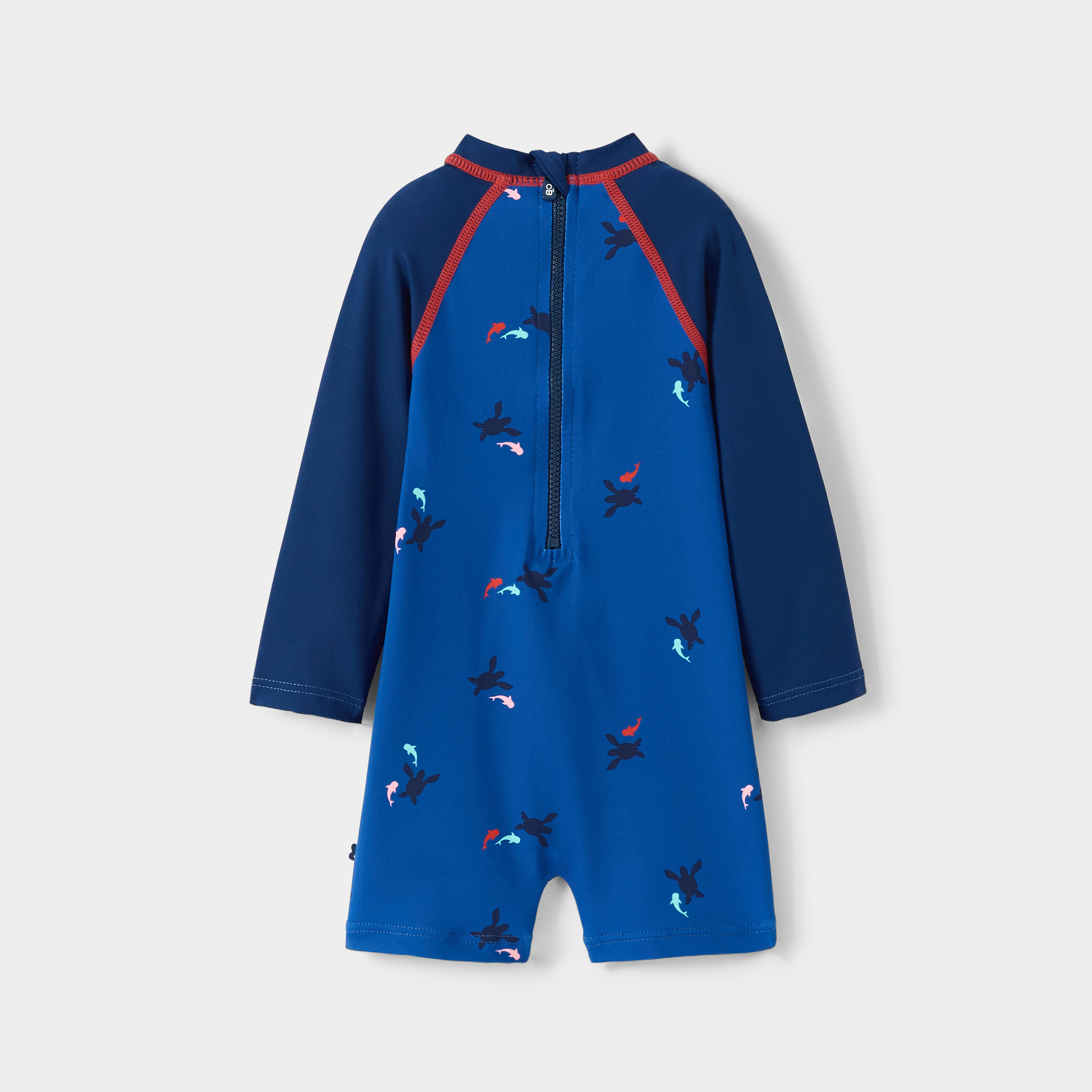 Този син бански костюм с UV защита е идеален за безопасността на децата в слънчеви дни. Вталената му кройка, дългите ръкави и подплатата осигуряват пълно покритие. Изработен от еластична и издръжлива материя, той е с игрив мотив с цветни рибки. Идеален за плажа или басейна, той осигурява комфорт и свобода на движение благодарение на удобния си цип на гърба.Състав