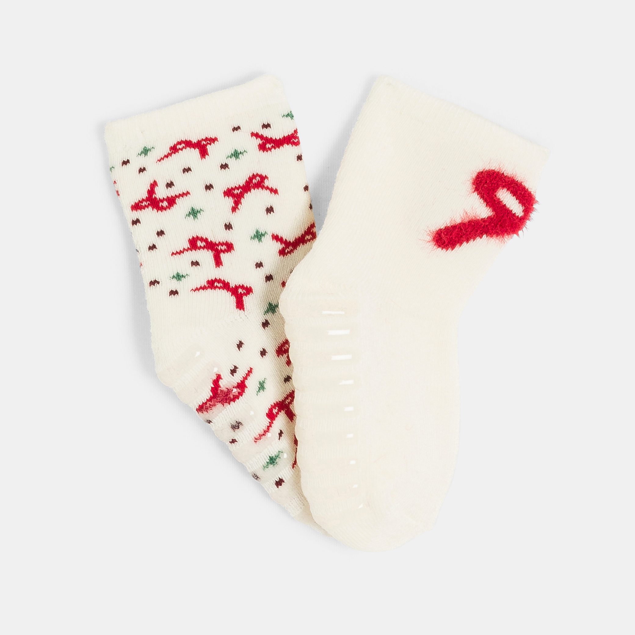 Тези бели детски чорапи придават празничен вид с червените си панделки и цветни детайли. Изработени от мека плетка, те осигуряват комфорт и топлина за ежедневно носене. Неплъзгаща се подметка за безопасни първи стъпки. Идеални за празничния сезон.Състав