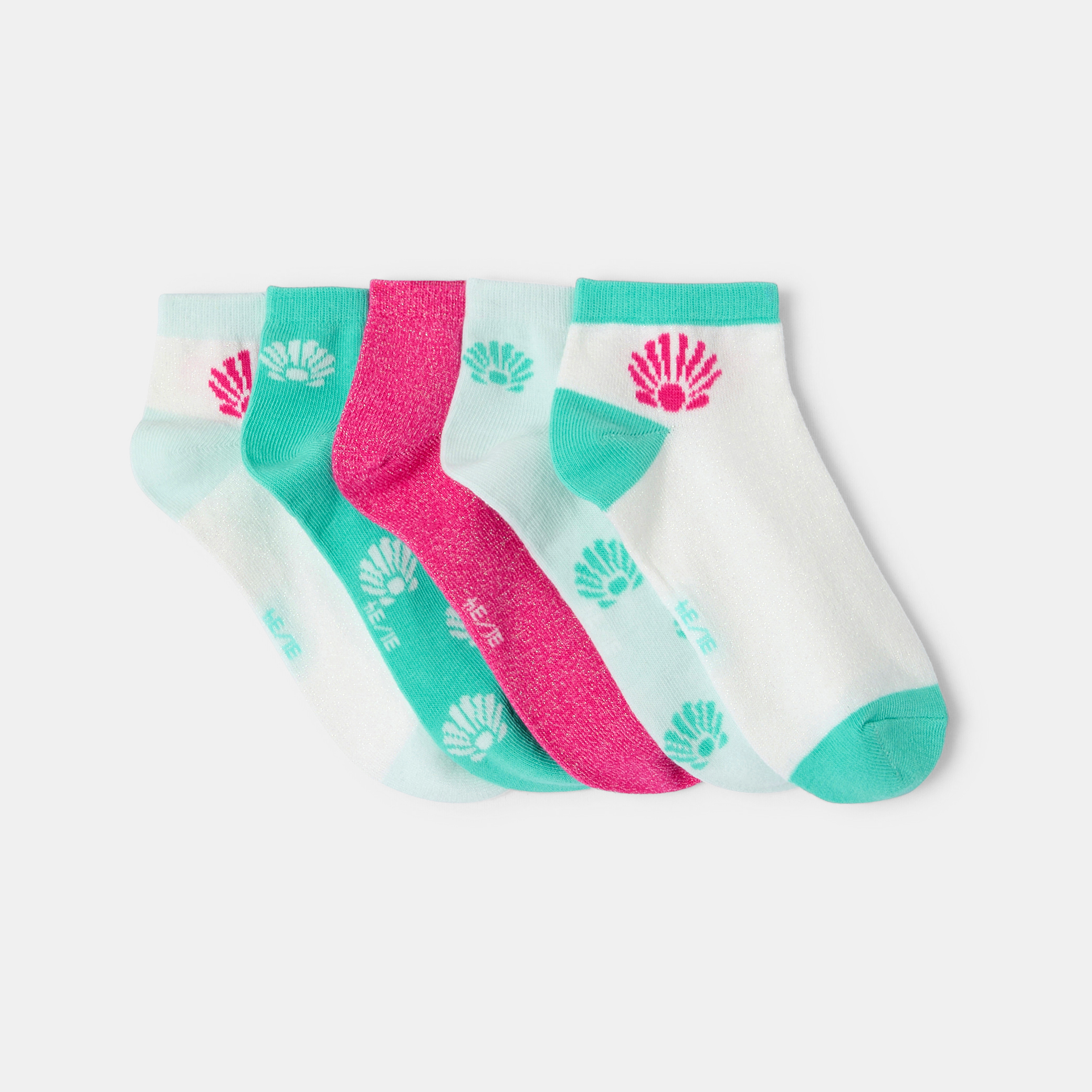 Идеални за добавяне на нотка забавление към момичешките тоалети, тези меки памучни чорапи до глезена са с очарователен мотив от раковина. Идеални за ежедневно носене, с еластичен маншет за сигурно прилягане. Гарантиран комфорт през целия ден. Размерът е маркиран с жакард на подметката. Опаковка от 5 чифта.Състав