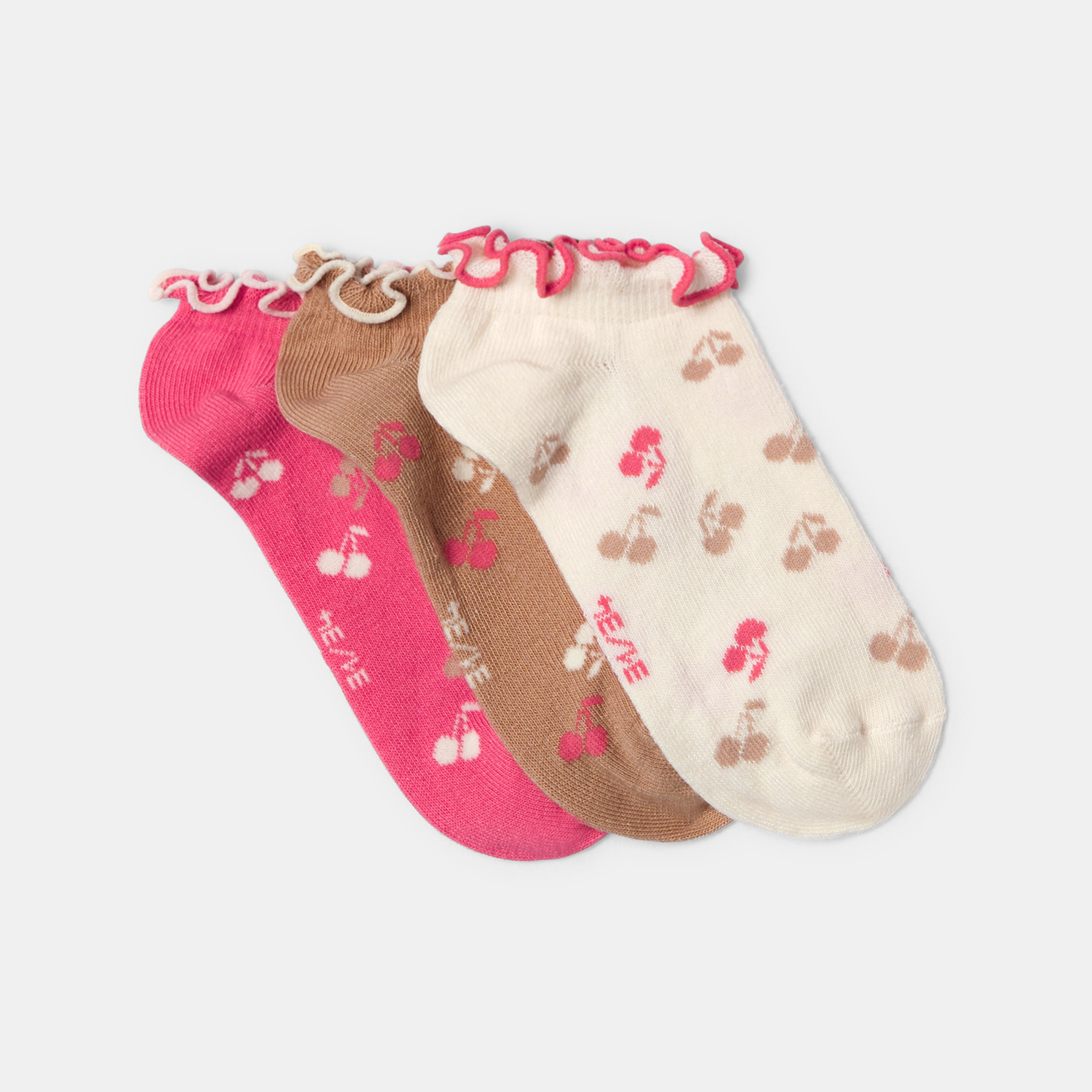 Комплект от 3 многоцветни чорапи с черешов шарен мотив за момичета. Изработени от памук за оптимален комфорт, те се отличават със забавни фестонени краища. Идеални за ежедневно носене, лесни са за обуване и поддържат краката топли. Закачлив и практичен избор!