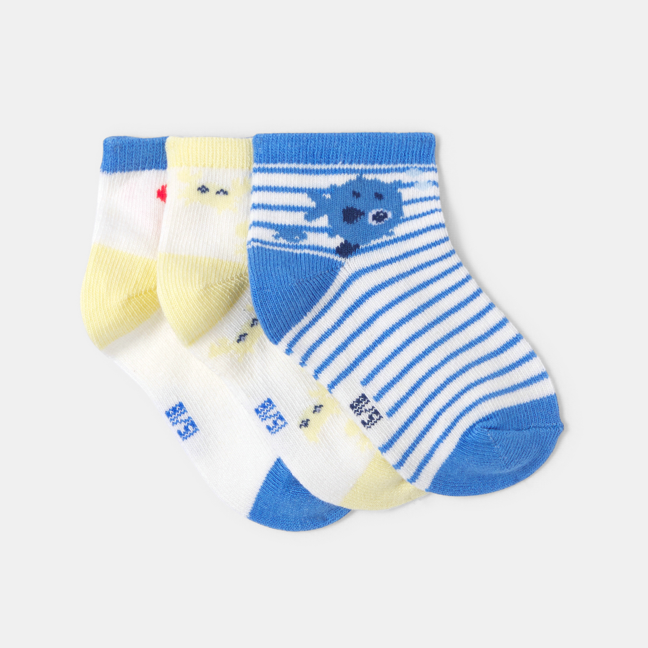 Комплект от 3 сини бебешки чорапки за момче, изработени от памук за оптимален комфорт. С раиран дизайн и игриви животински мотиви, тези чорапи са идеални за ежедневно носене. Височина до глезена с еластични оребрени маншети за плътно прилягане. Лесни за обличане и съчетаване, те добавят нотка веселие към тоалетите на малчуганите. Идеални за гардероба на начинаещите авантюристи!
