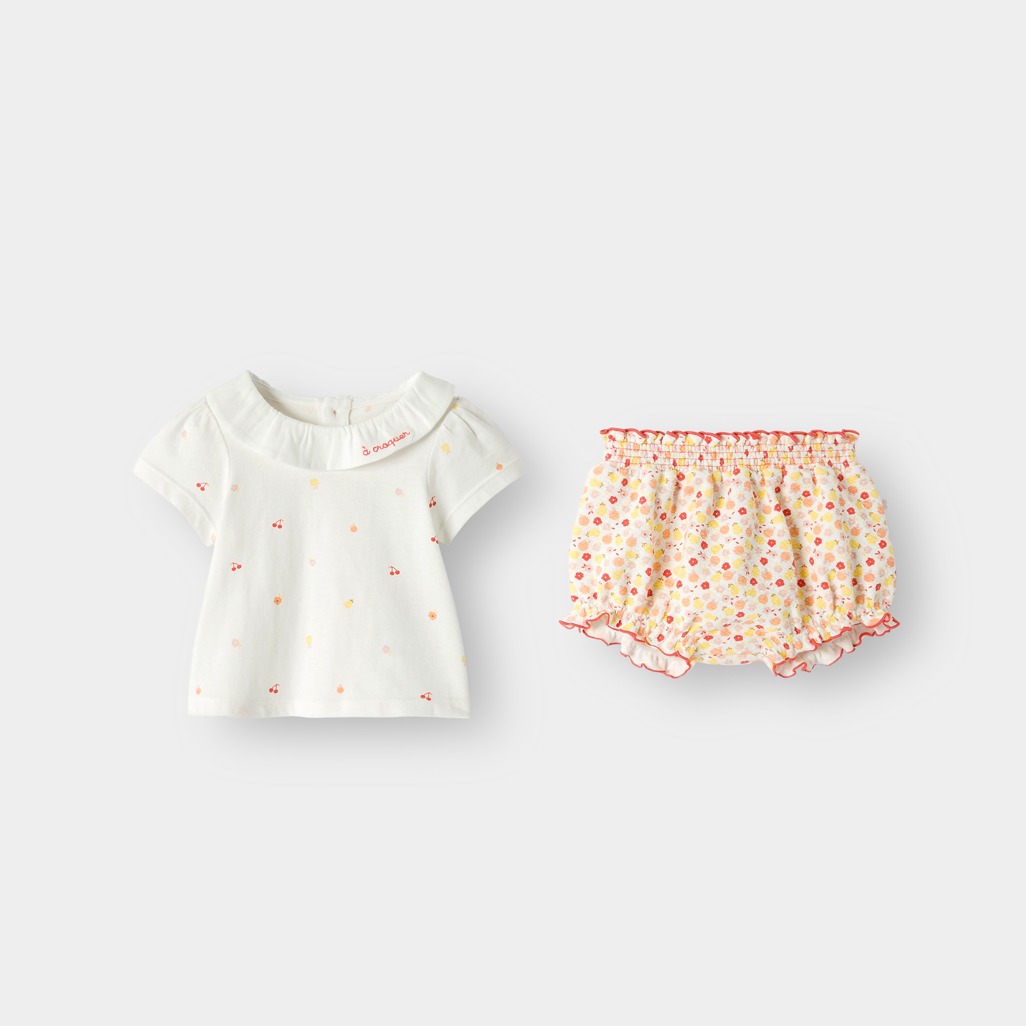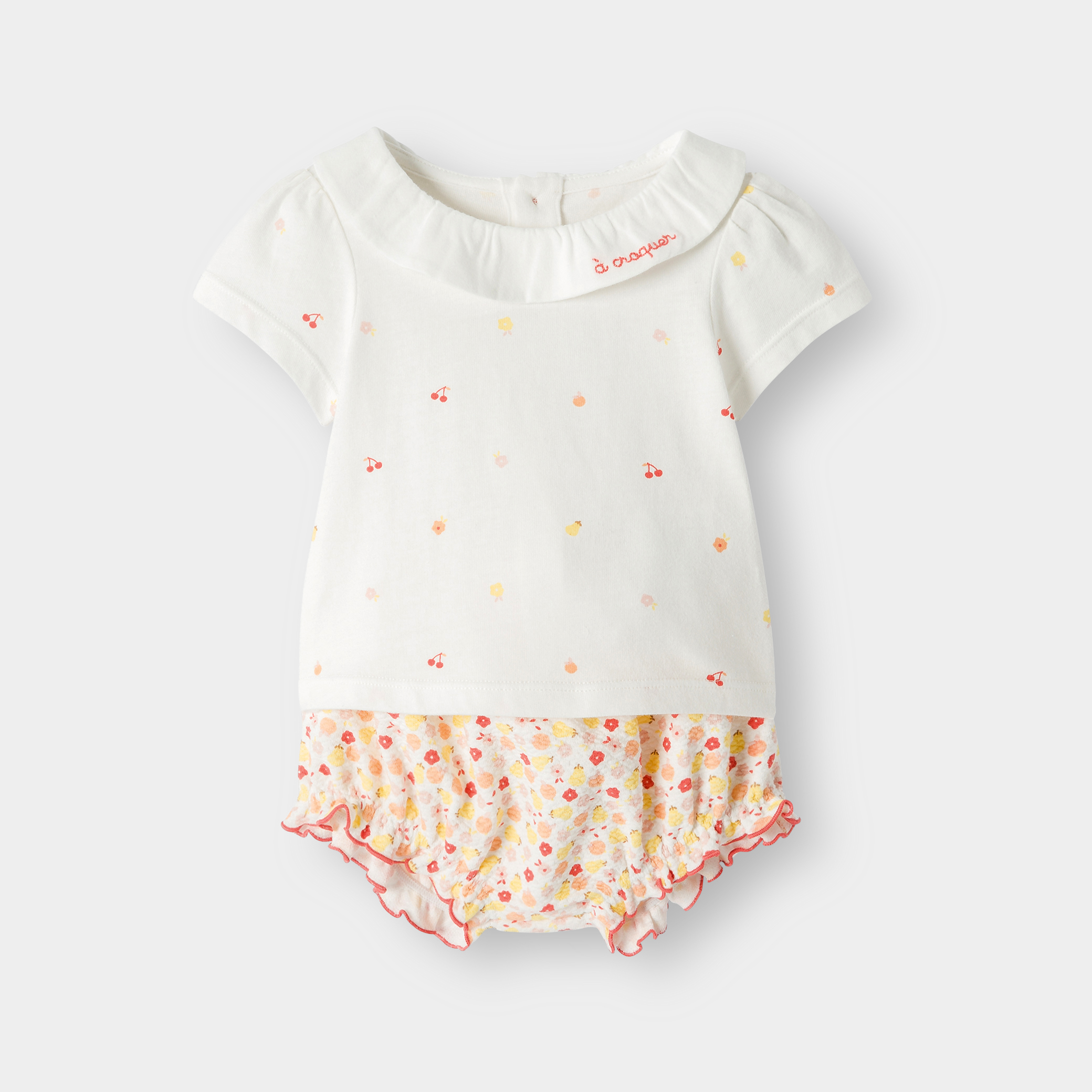 Тениска с плодове и оранжеви къси панталони