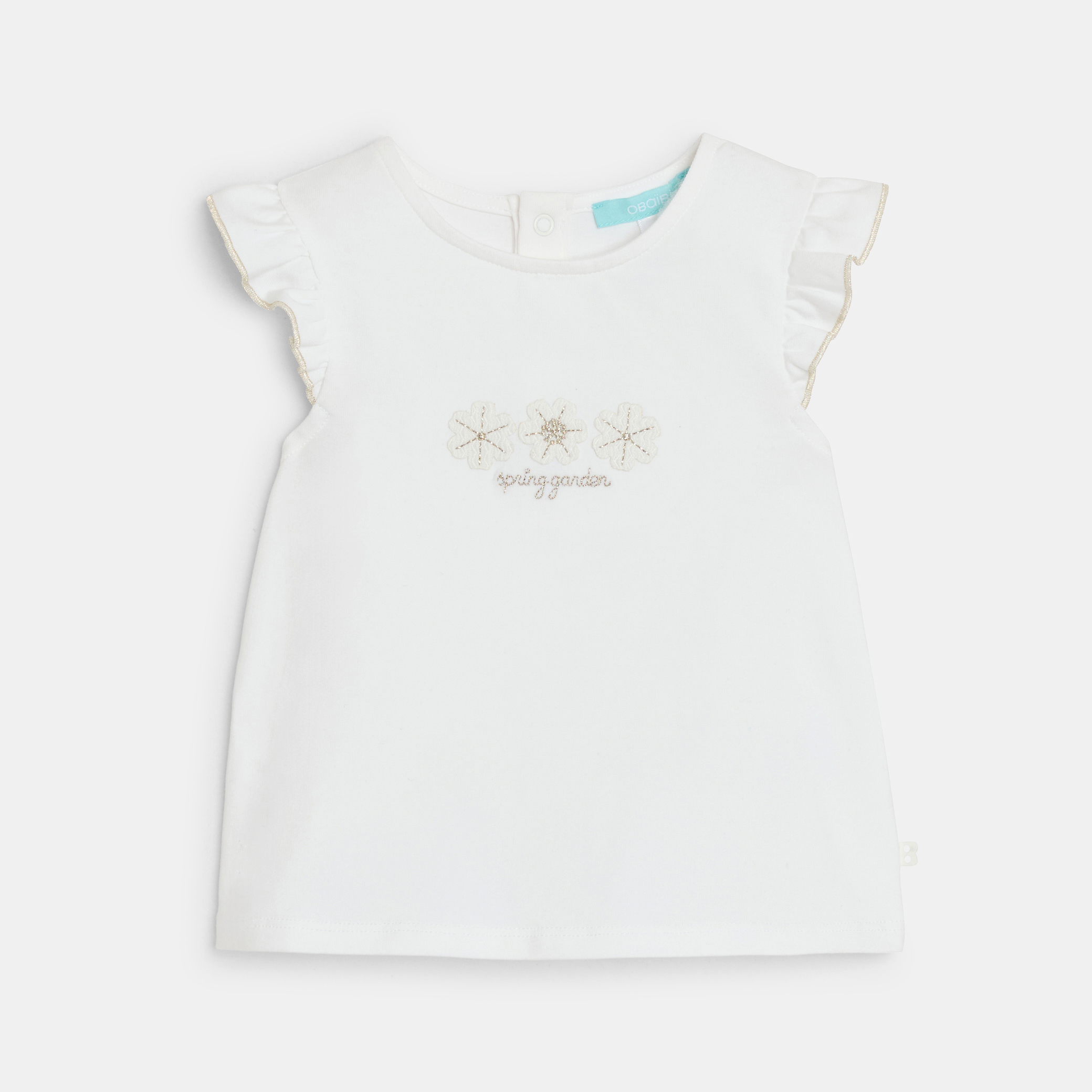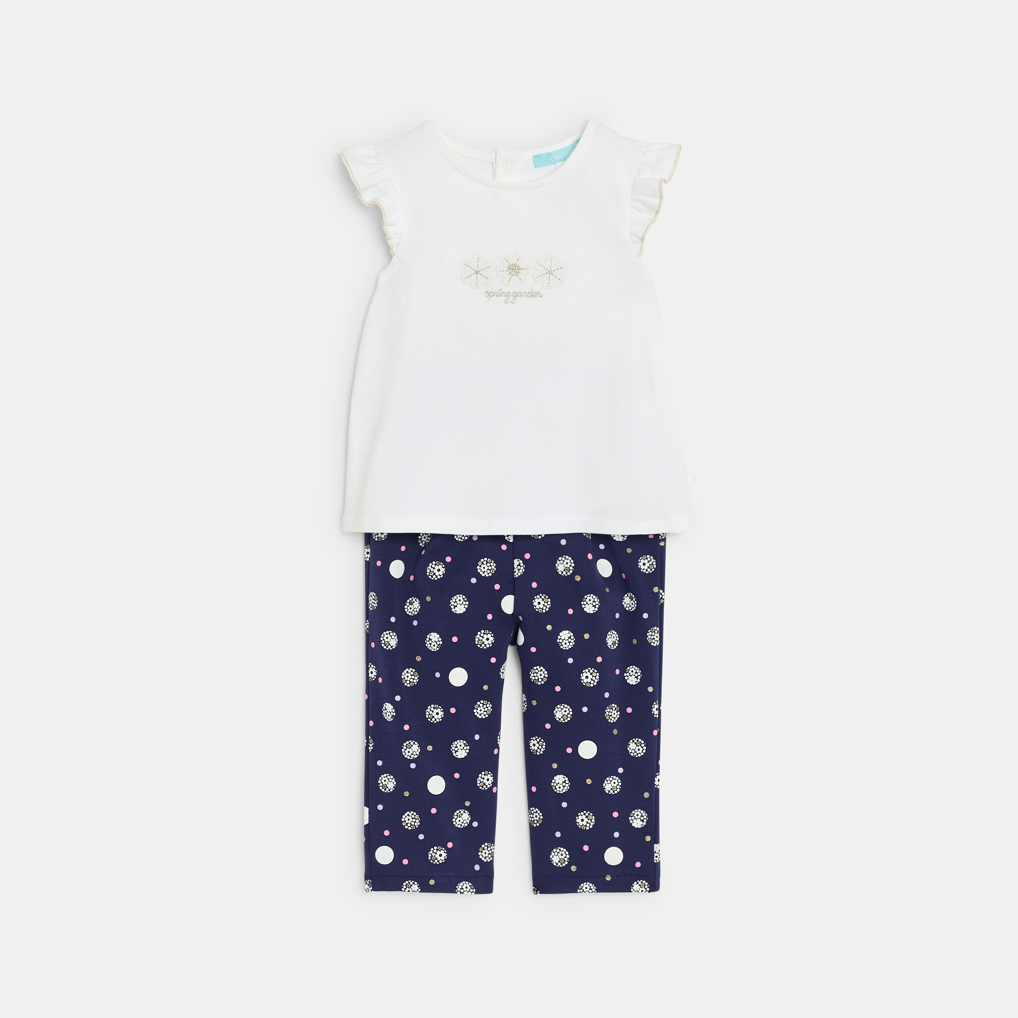 Детски комплект, състоящ се от бяла тениска и тъмносин клин с флорален принт. Меката трикотажна тениска е с къси, волани и красив дизайн отпред. Клин с ластик на талията за оптимален комфорт. Идеален за ежедневно носене или летни излизания, този комплект съчетава стил и свобода на движение.Състав