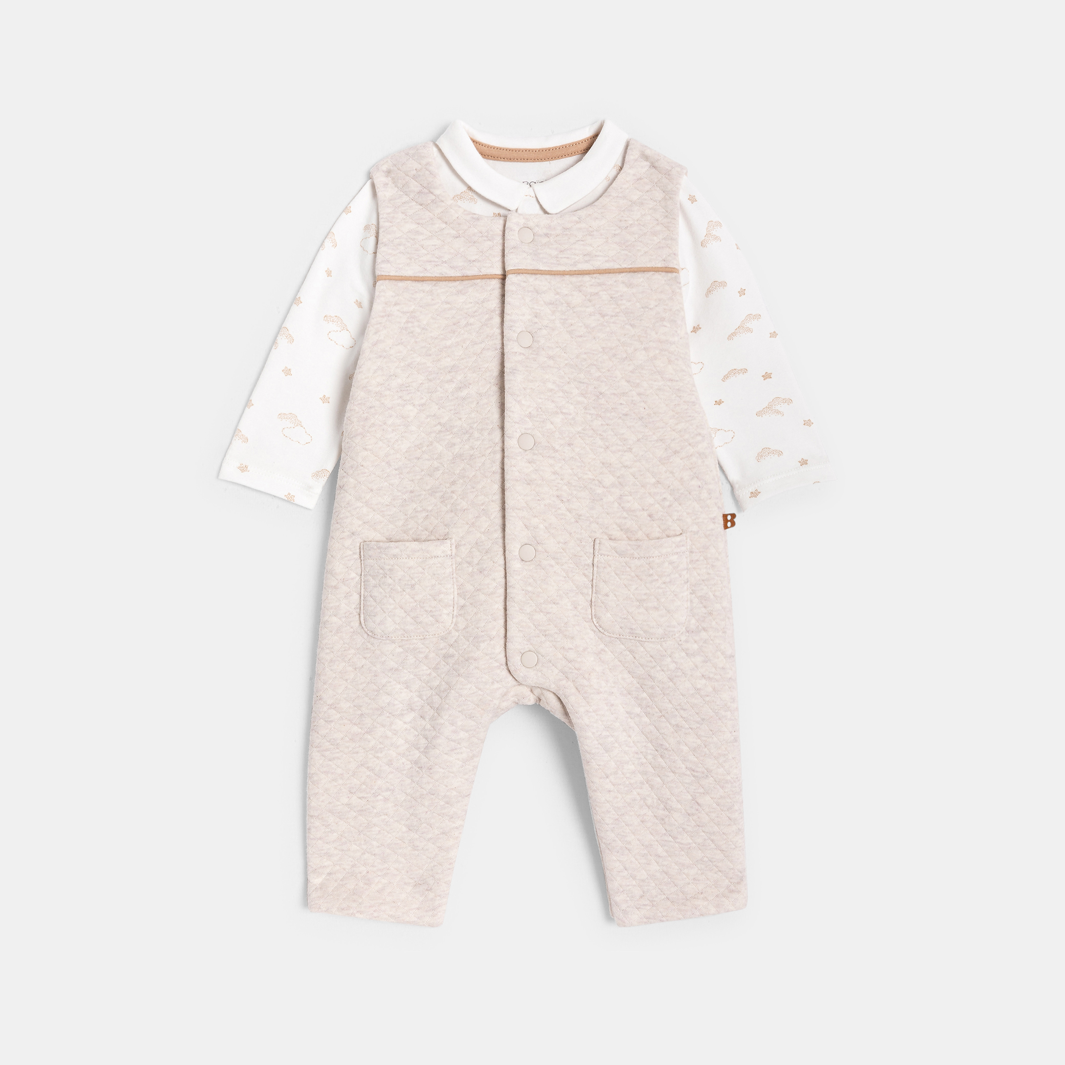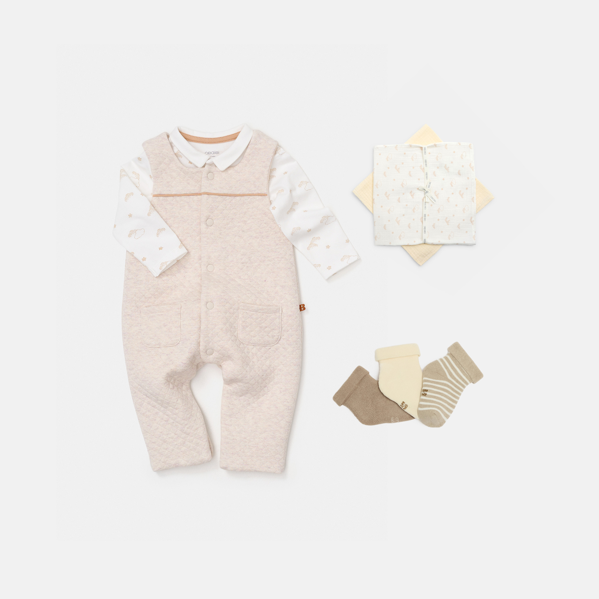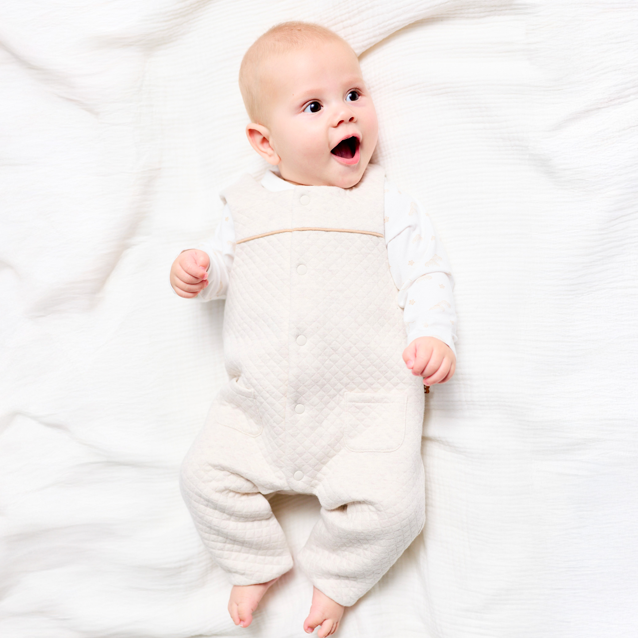 Влюбете се в този очарователен, уютен комплект гащеризони! Изработени от ватирана плетка, те са уютни и топли през целия ден. Яката на ризата и дългите ръкави с красиви мотиви добавят нотка стил. Предно закопчаване с копче за бързо и лесно обличане.Състав