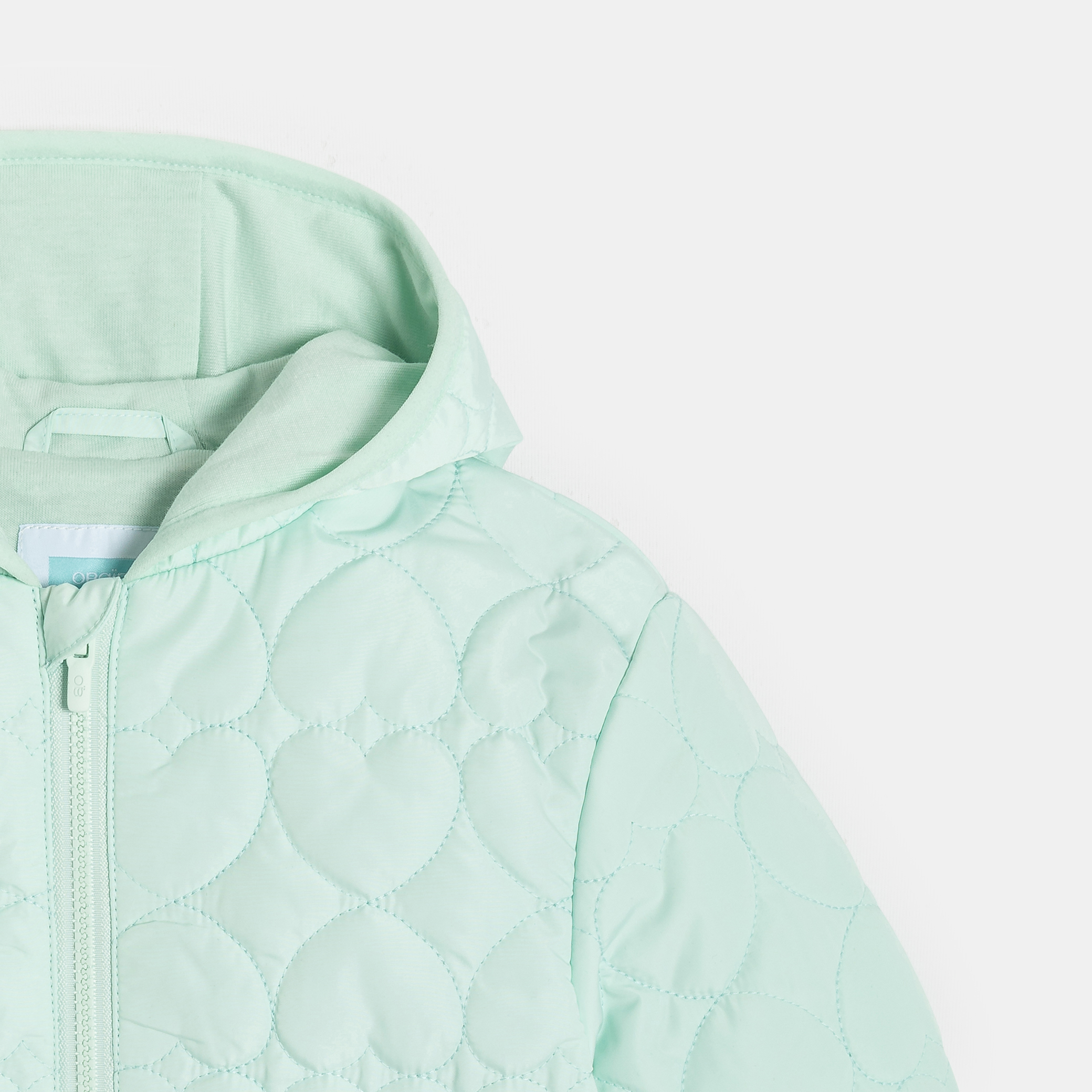 Трудно е да устоите на това зелено ватирано пухено яке! Качулката и предният цип предлагат комфорт и практичност. Дългите ръкави с еластични маншети и два джоба с нашивки добавят функционален щрих. Идеално за ежедневно носене, това яке с шарка на сърце внася топлина и веселие във всяко излизане.Състав