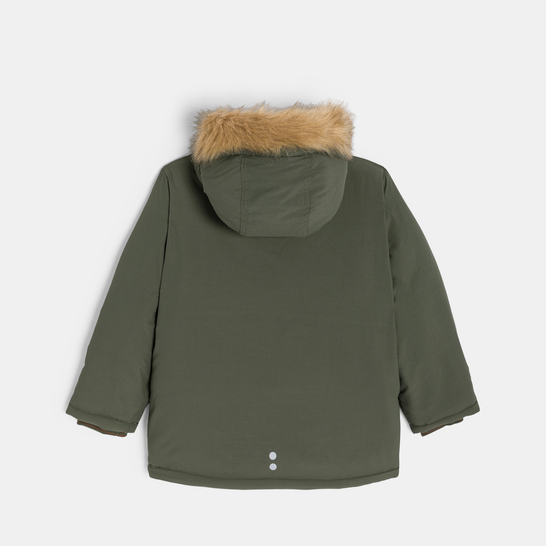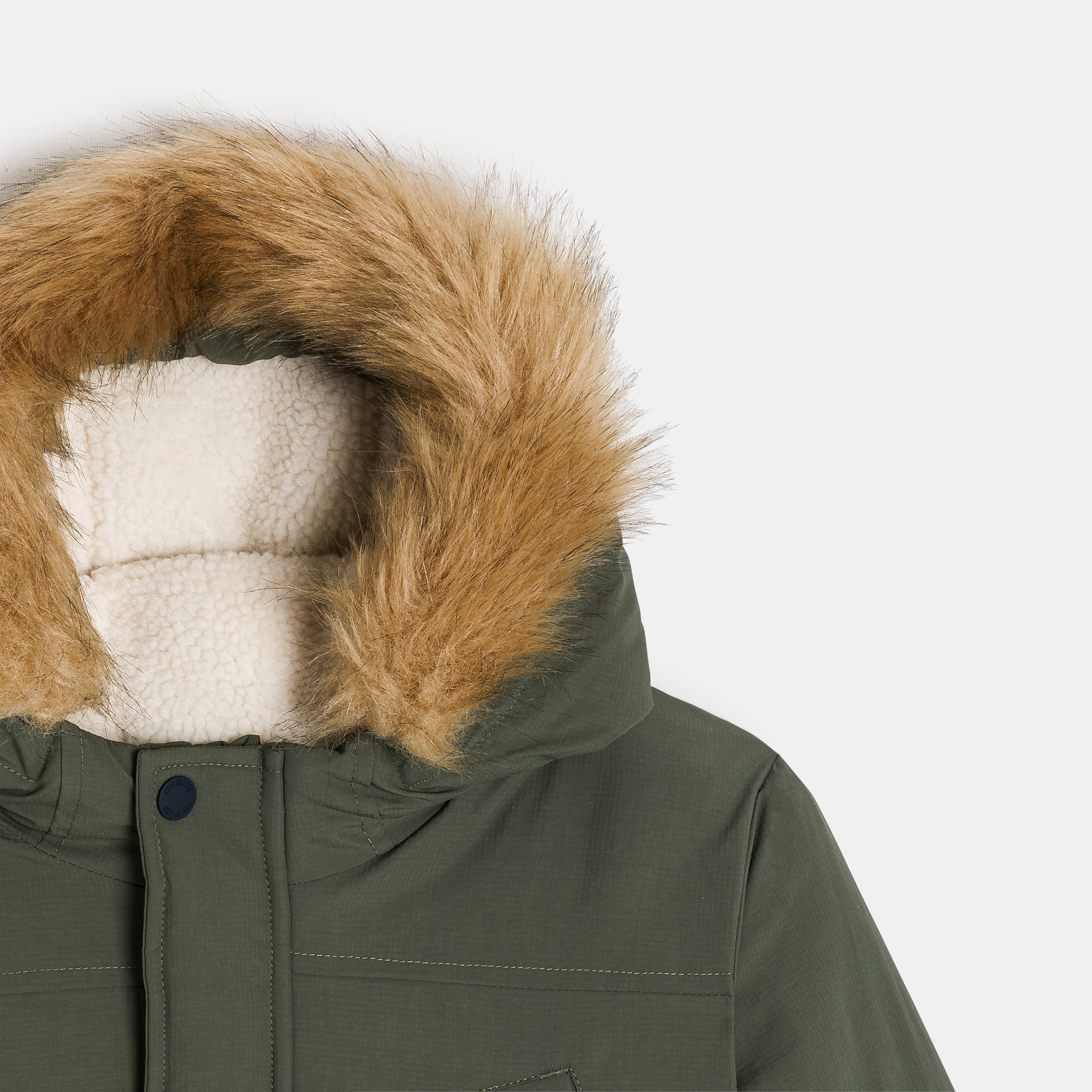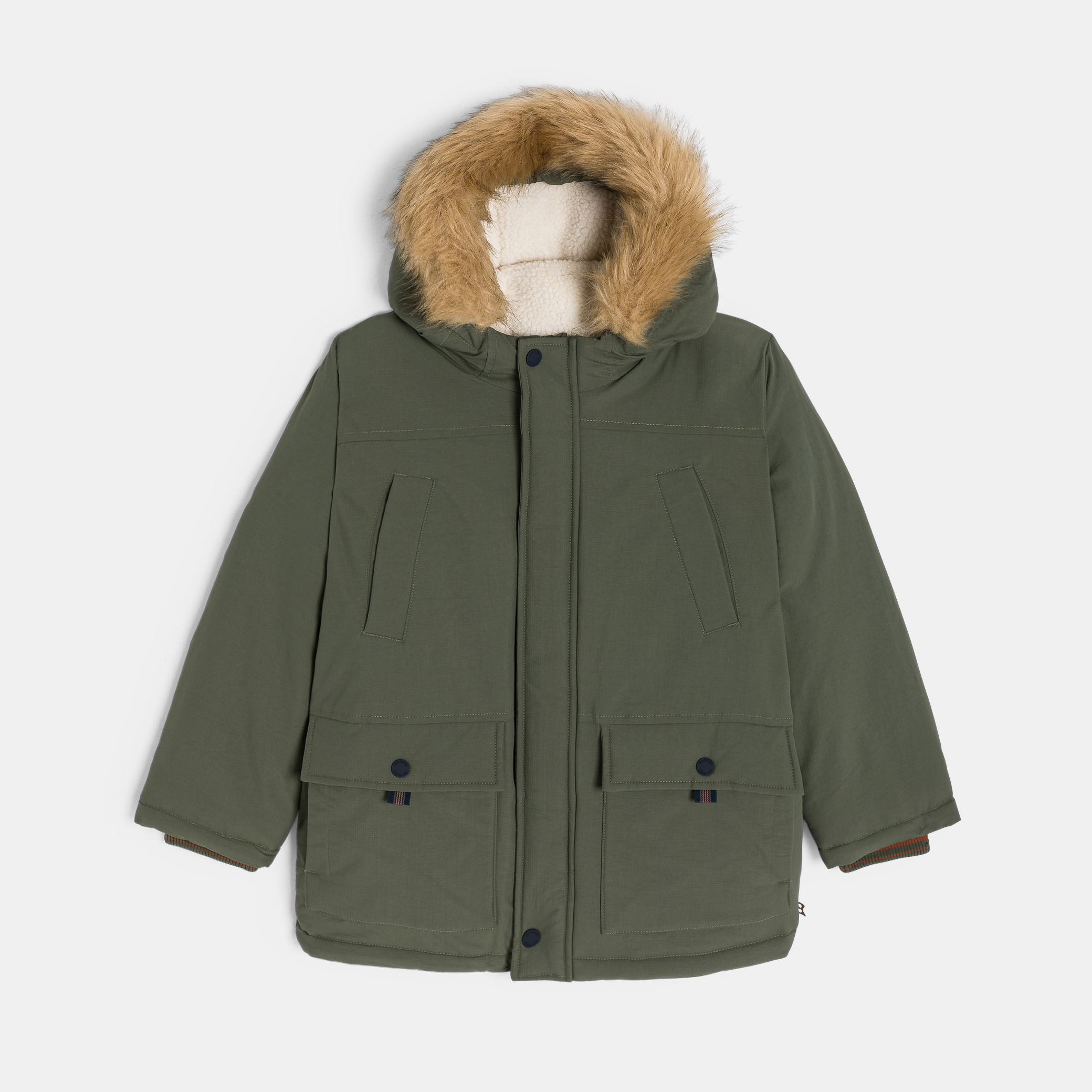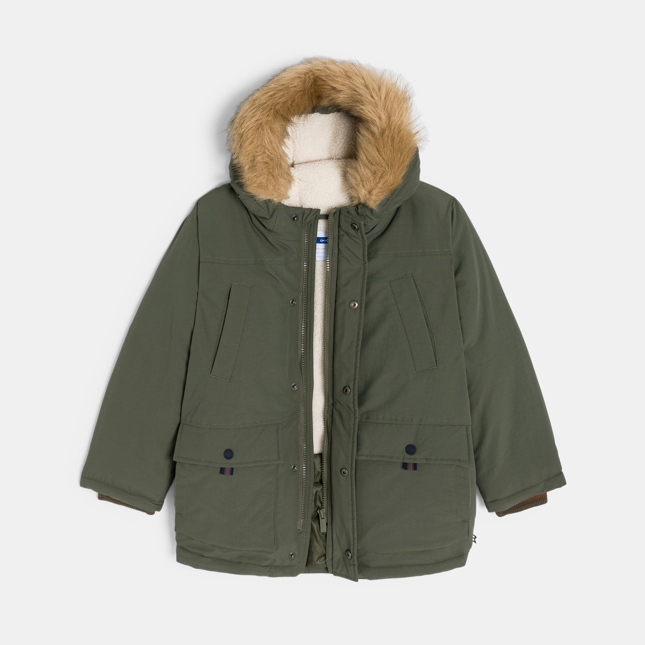 Топлата, водоотблъскваща парка е практична и абсолютно необходима, за да преминете през есенно-зимния сезон без студ! Момчетата обожават шерпа подплата, 4-те предни джоба (с поларена вътрешна част) и подвижната качулката с изкуствена кожа. Скрит цип под тик-так копче. Оребрени маншети под дългите ръкави.Състав