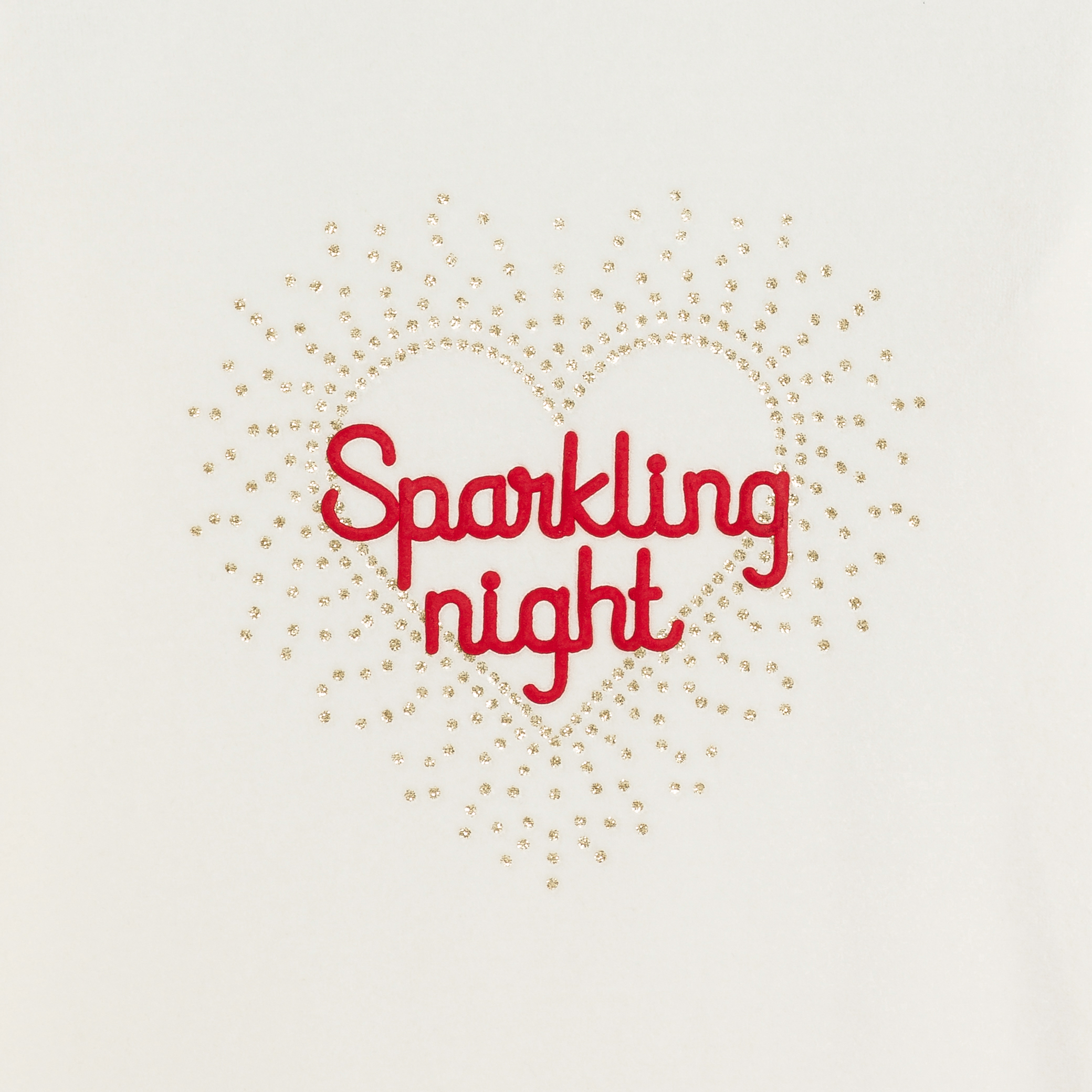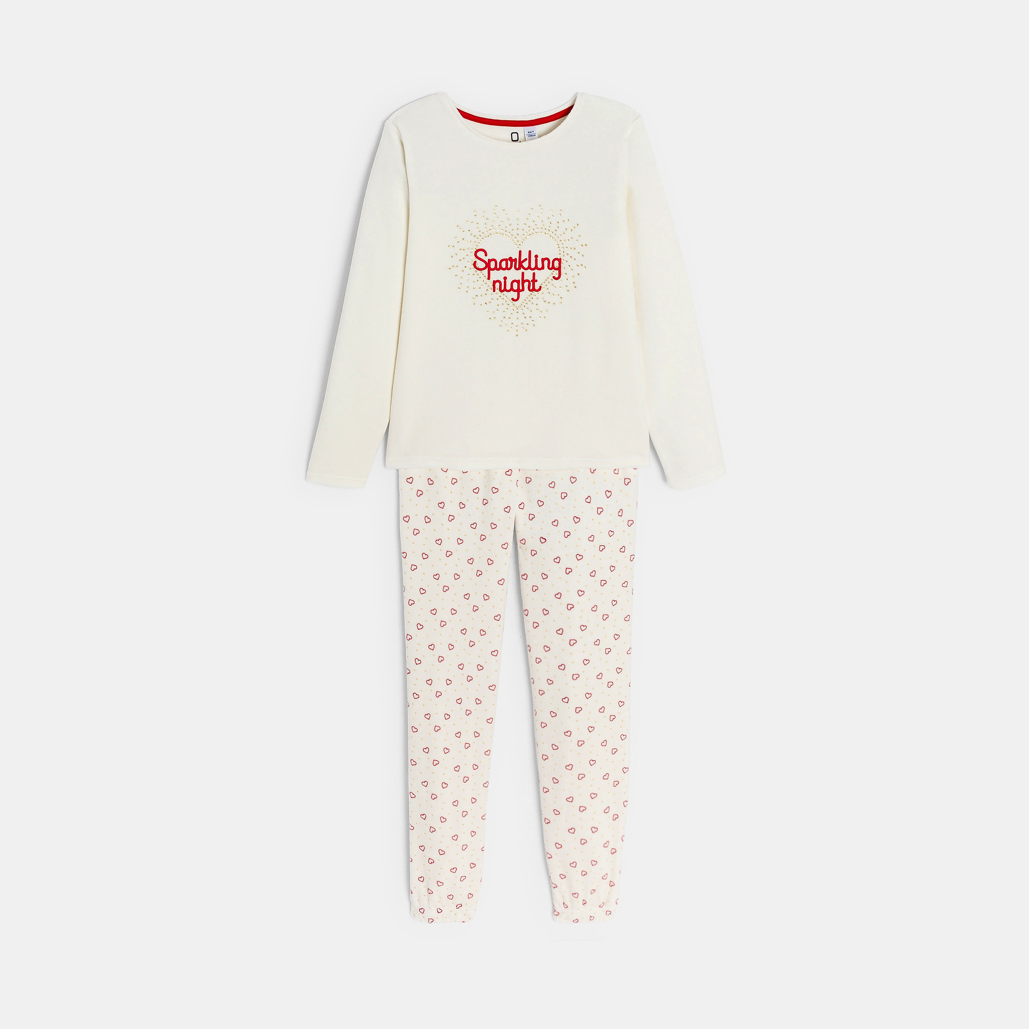 Момичетата могат да се състезават със звездите в тази кадифена пижама с блестящи детайли! Тази супер мека пижама се състои от две части: горнище с надпис (деколте и дълги ръкави),съчетано с подходящи долнища с щампи (кройка тип "джогер", еластична талия и маншети).Състав