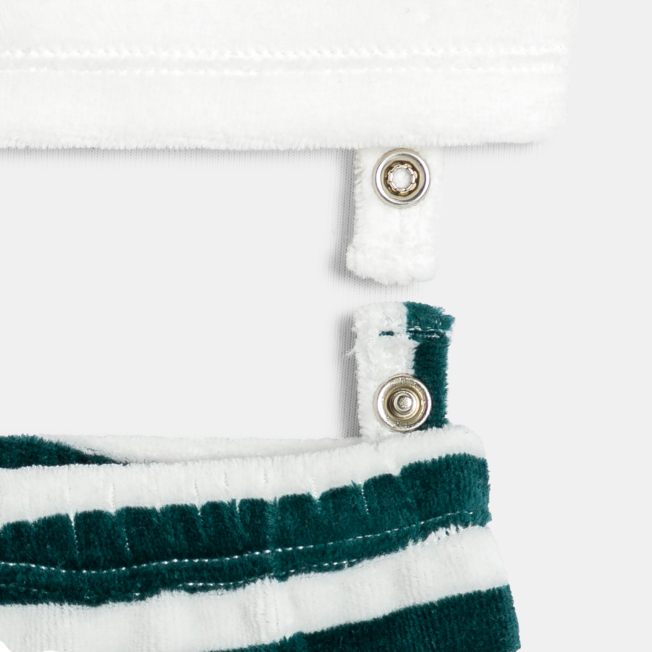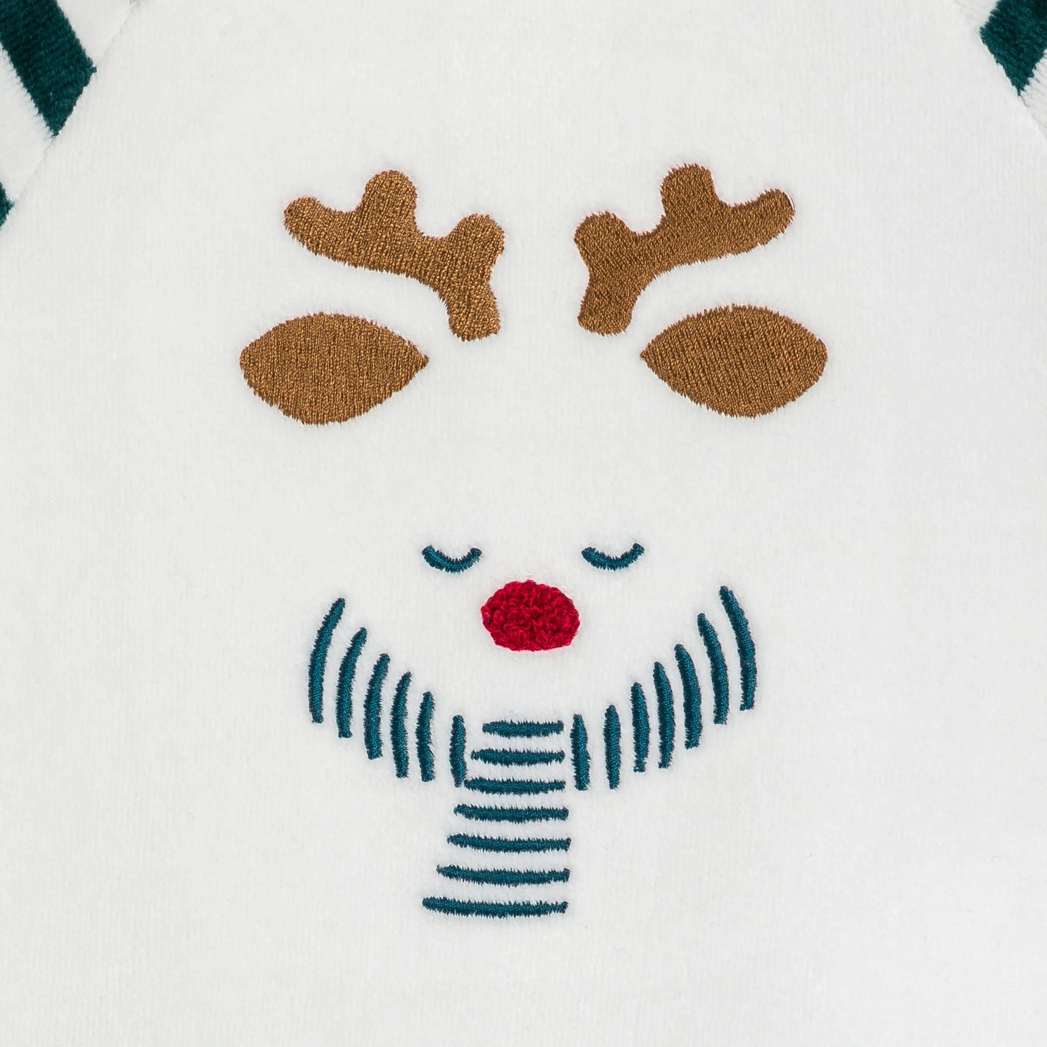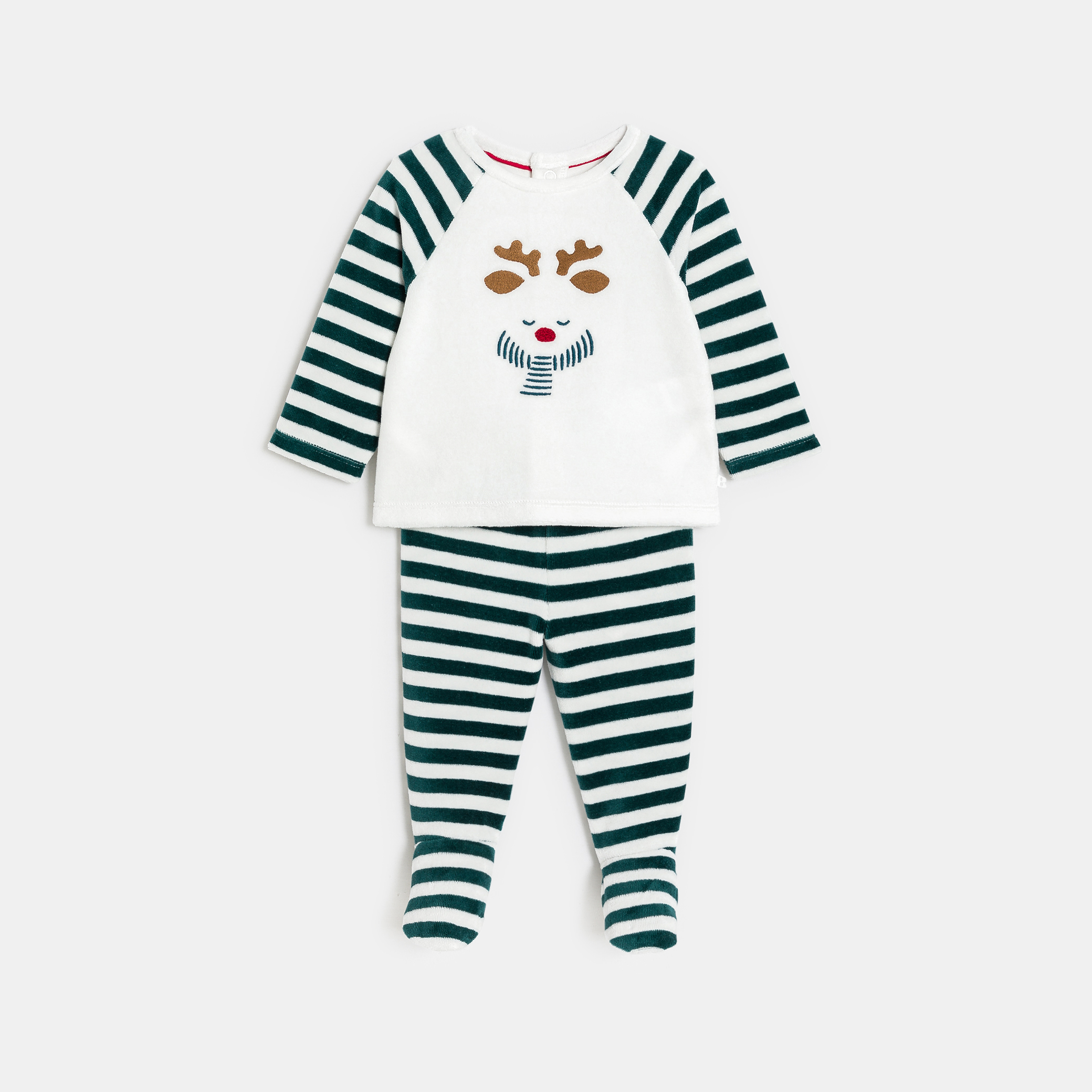 Неустоима пижама на зелени райета от меко кадифе. Горна част с деколте с дълъг ръкав и мотив на елен. Долнище с крачоли за оптимален комфорт през цялата нощ. Идеален за лягане и уютни сутрини. Практичен и топъл, идеален за зимата.Състав