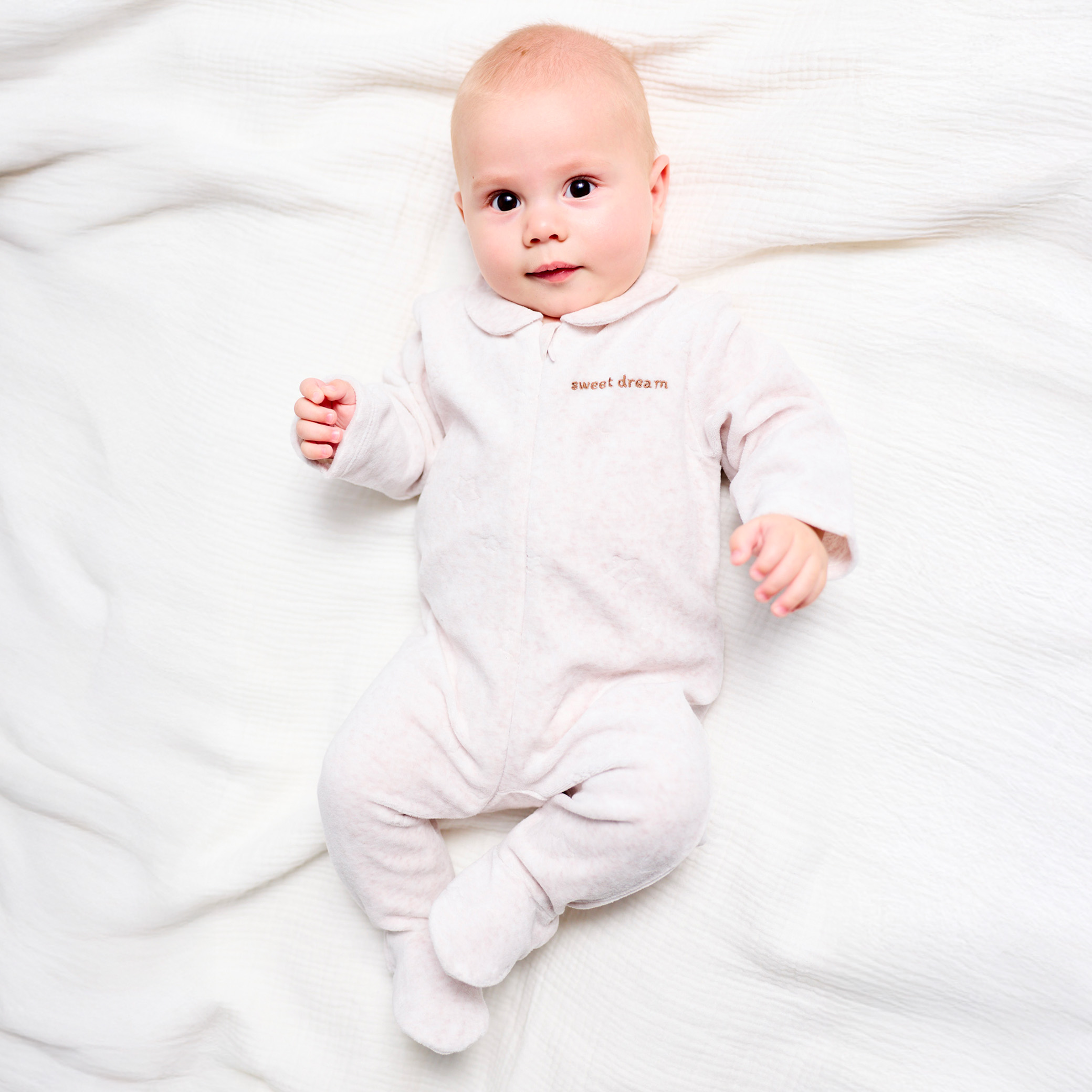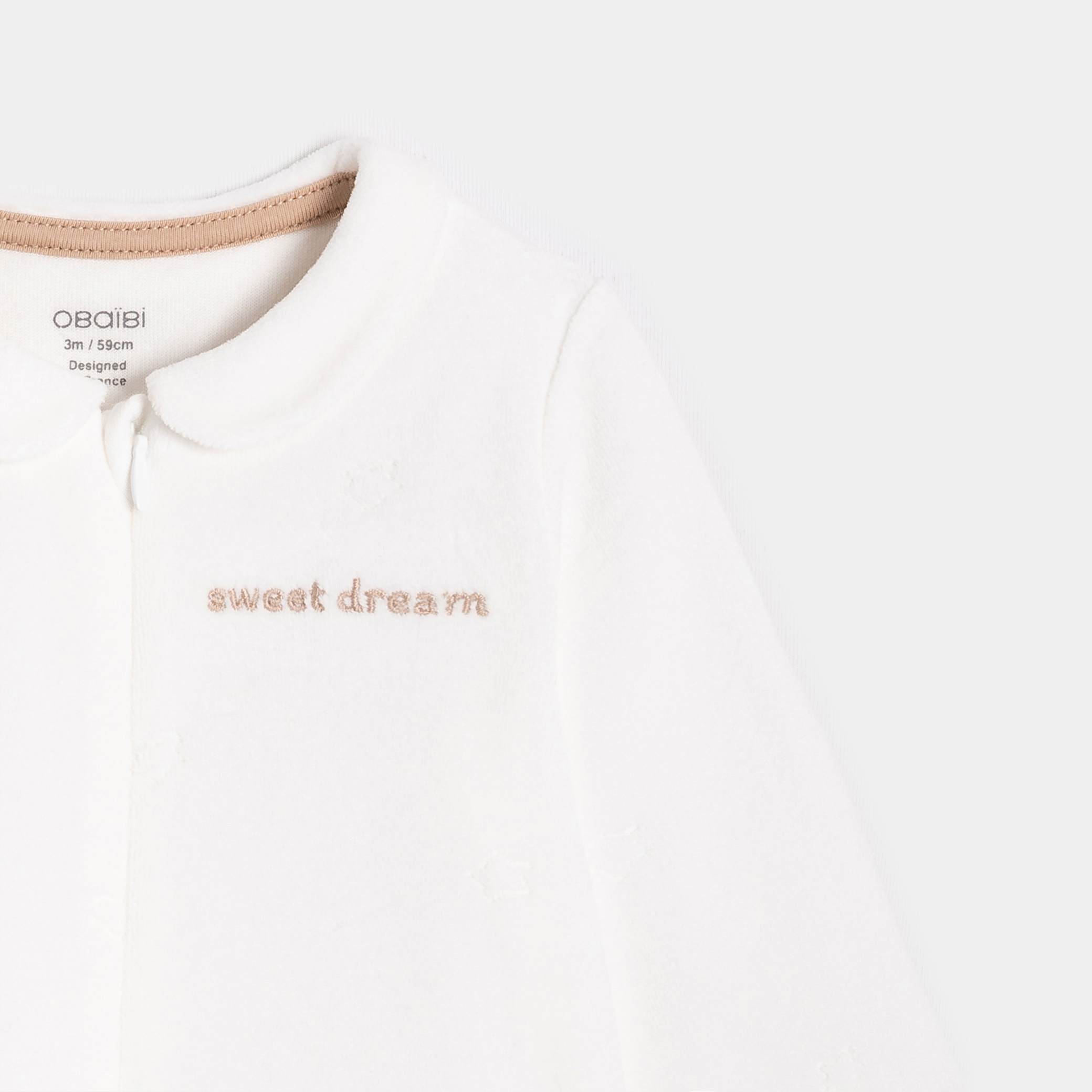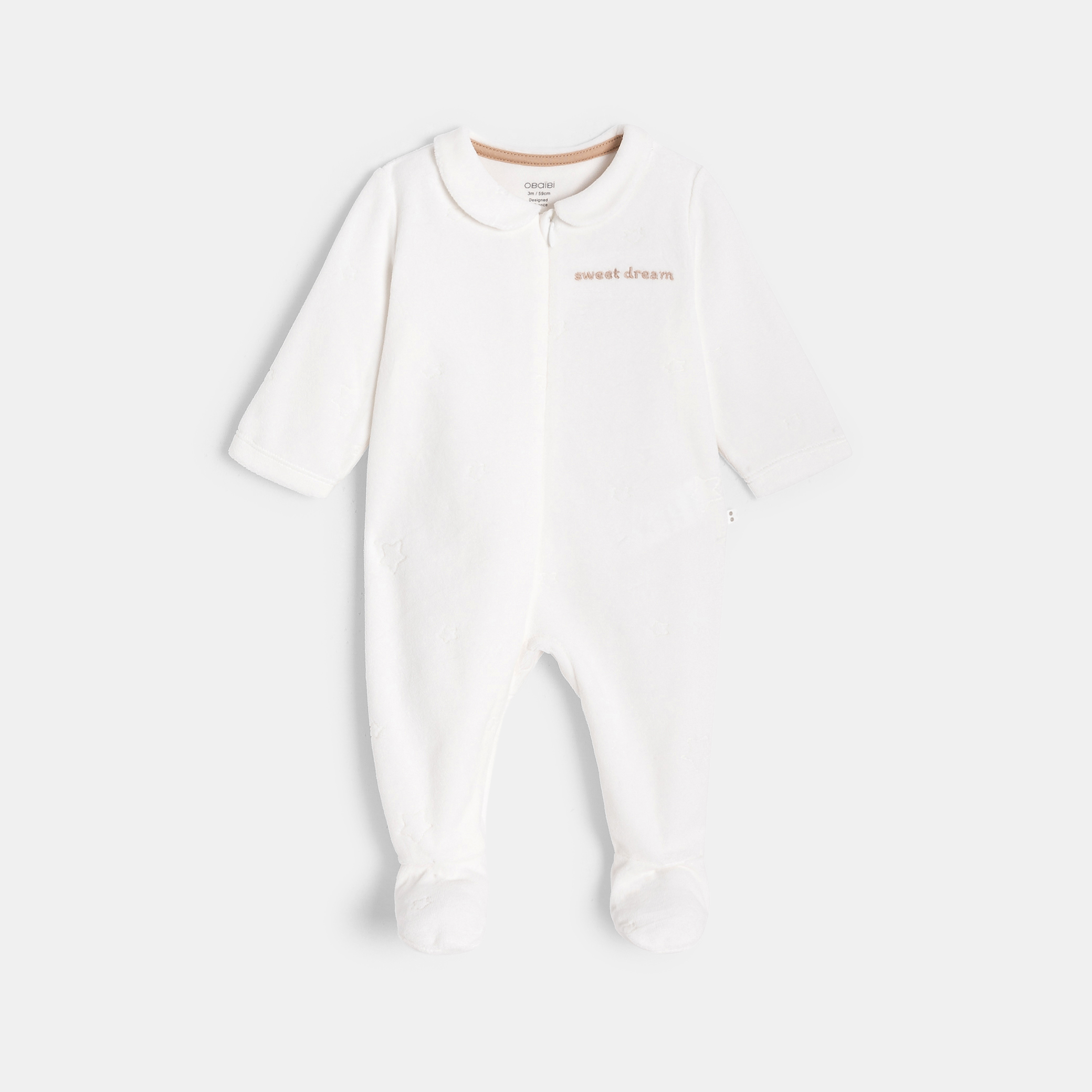 Този мек, бял велурен пижамен гащеризон е идеален за спокойни нощи за вашето бебе. С кръгло деколте и удобен цип, той е лесен за обличане. Бродиран с дизайн "сладък сън". Дългите му ръкави и вградените крачета осигуряват комфорт и топлина.Състав