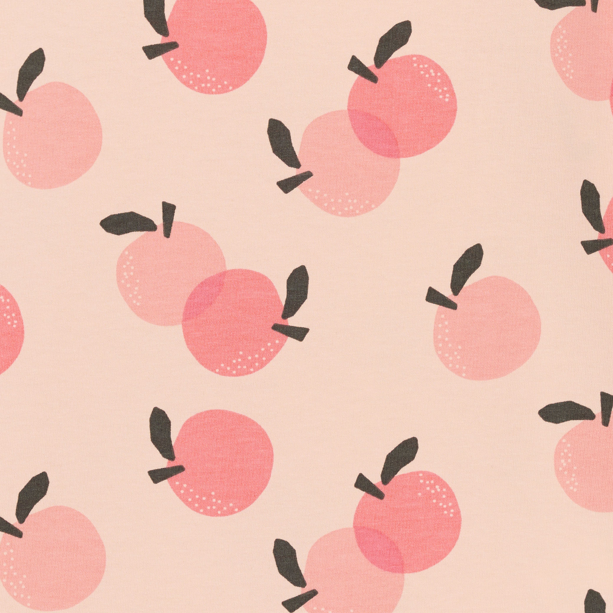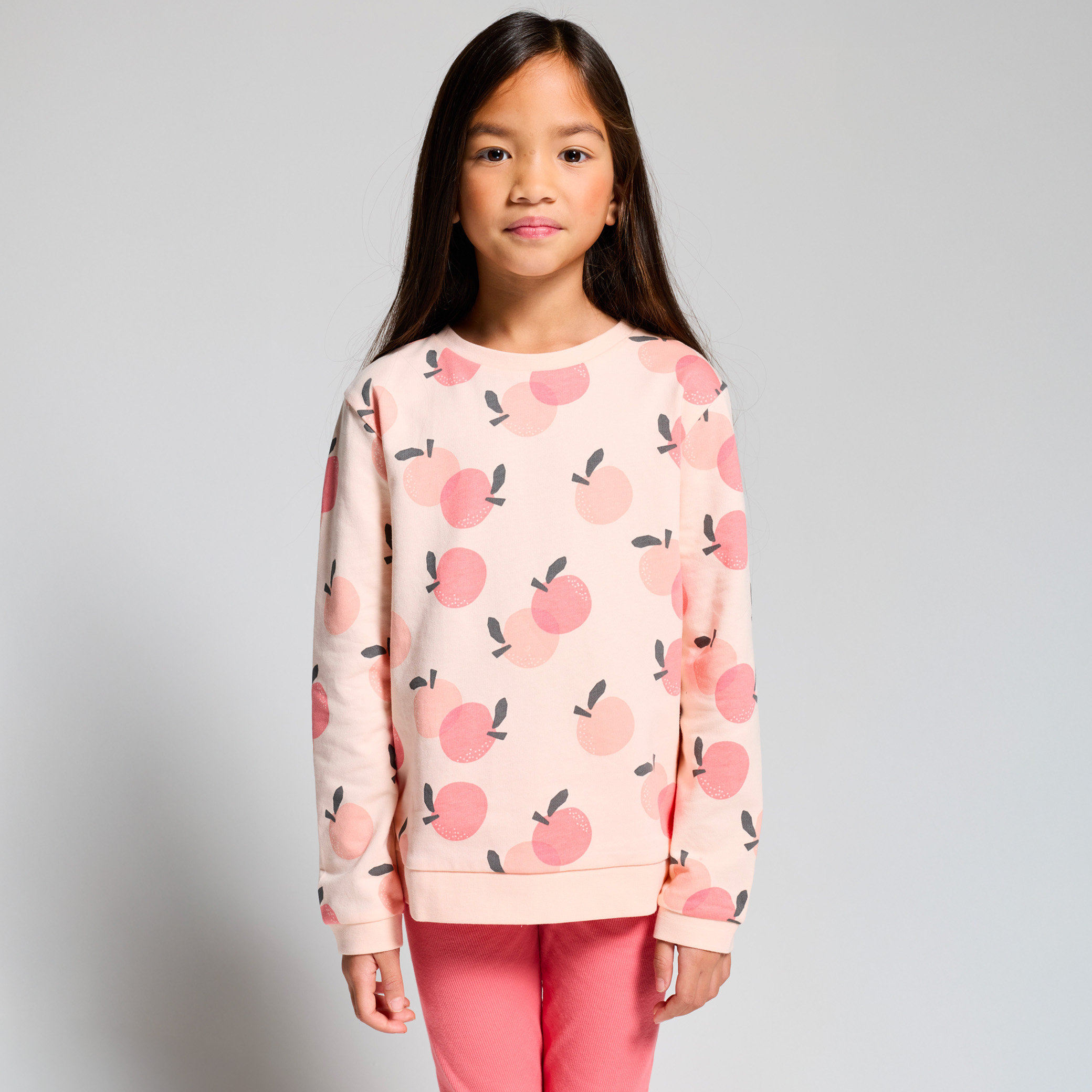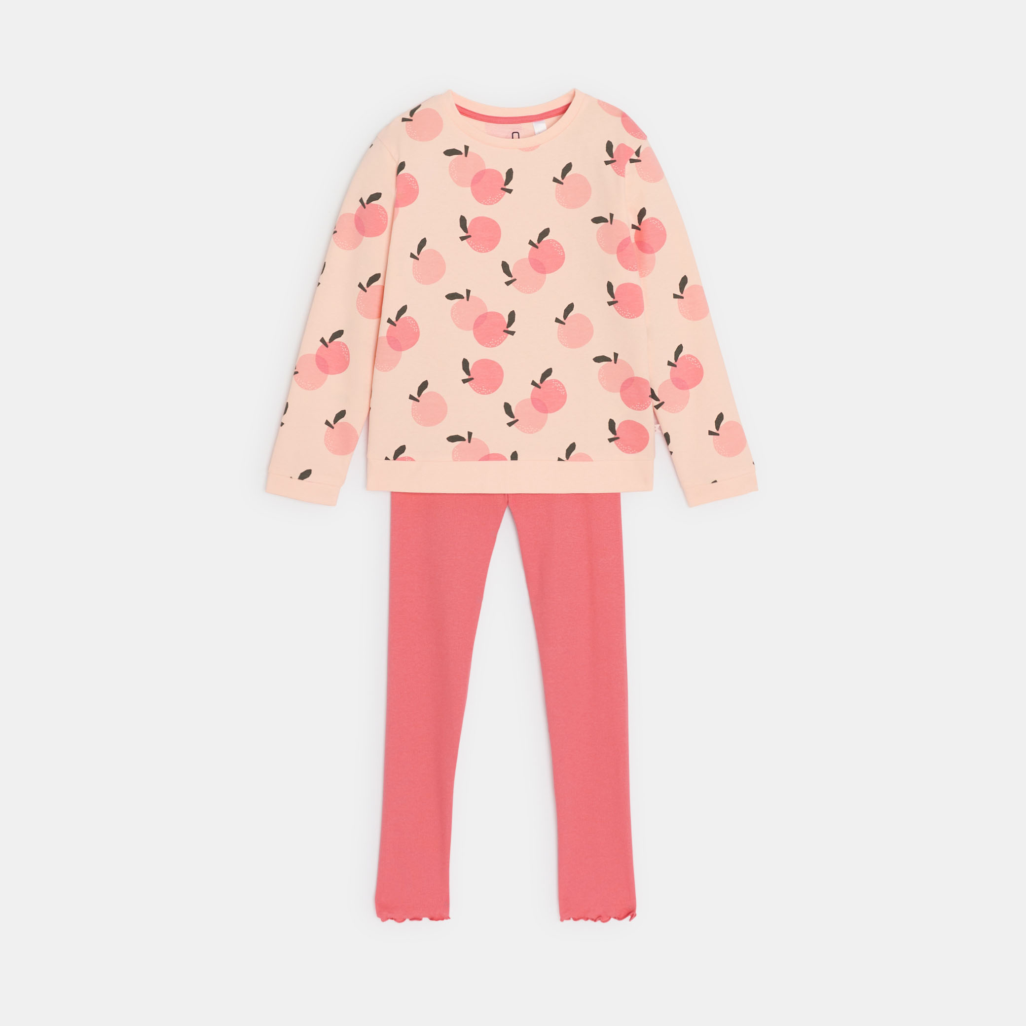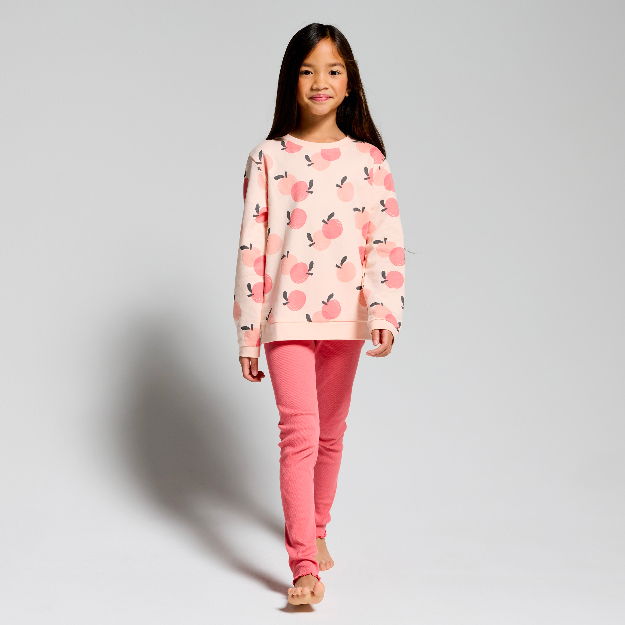 Сладки плодове за комфортен нощен сън! Обожаваме тези меки, пухкави пижами! Горна част с щампа на плодове и оребрени кантове. Дълго долнище с декоративен завършек.Състав