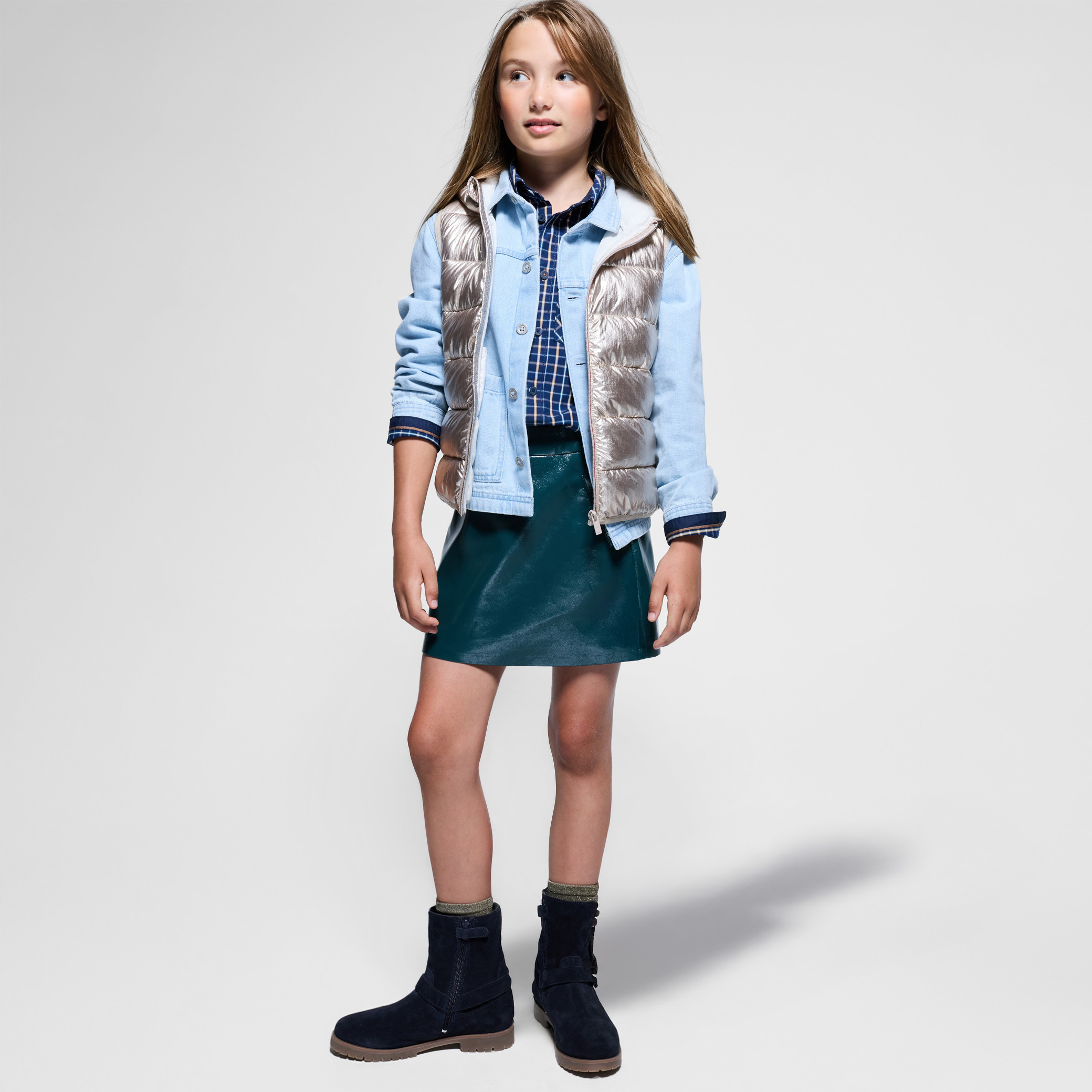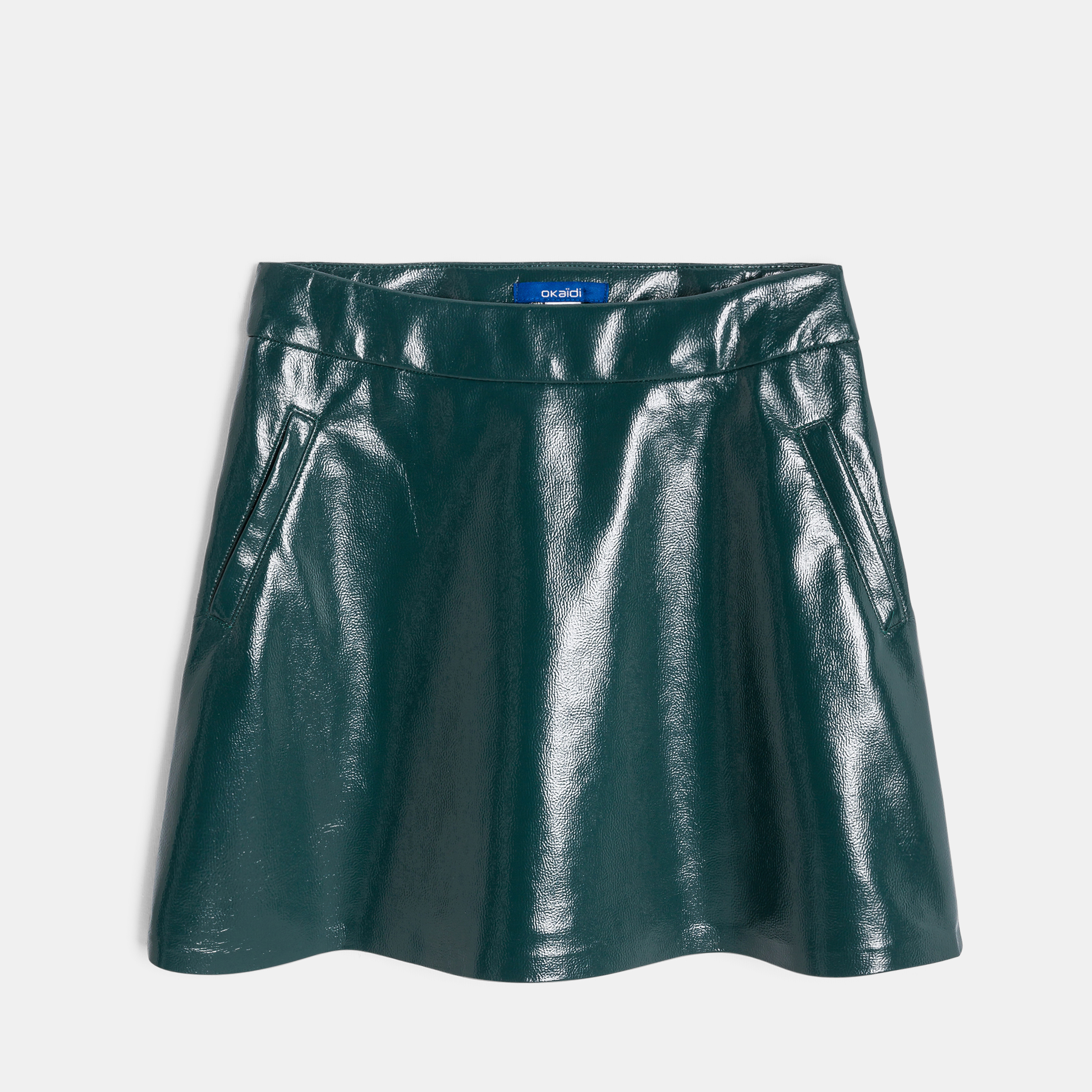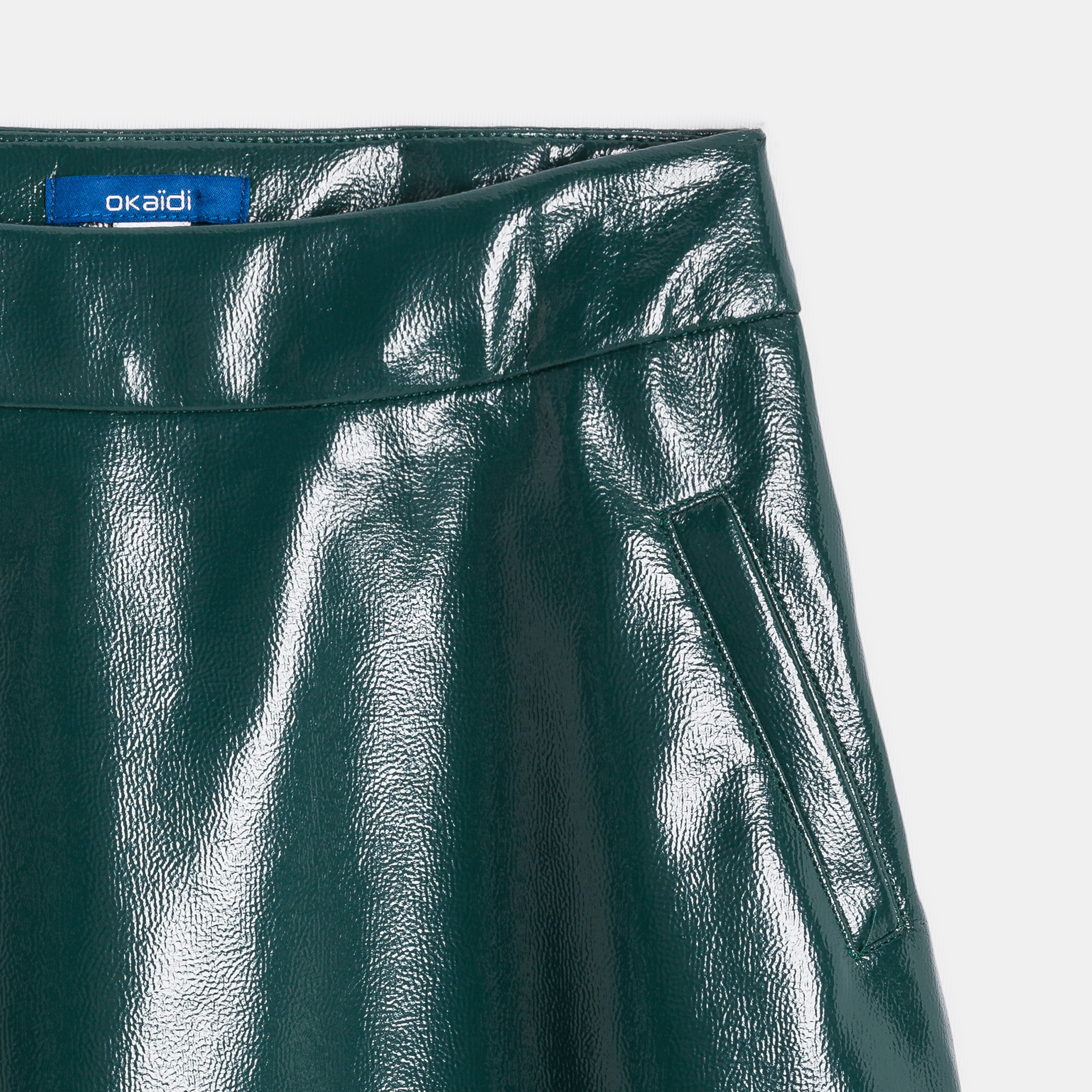 Тази пола с А-образна линия от лъскава зелена изкуствена кожа е напълно в крак с модата. Дискретно закопчаване с цип отзад. Идеална за дни в града или за специални поводи. Гарантирано удобство с меката си, еластична текстура.Състав