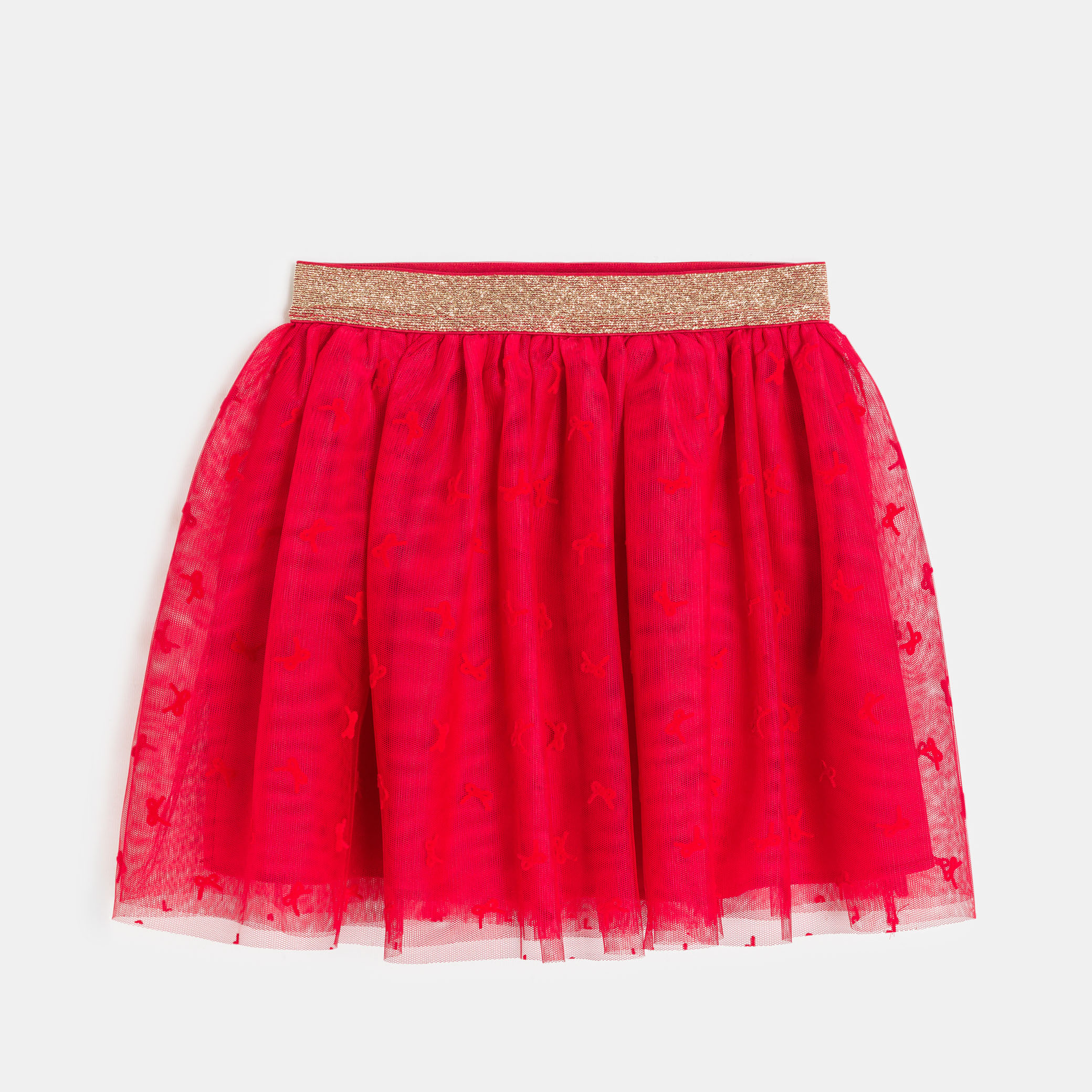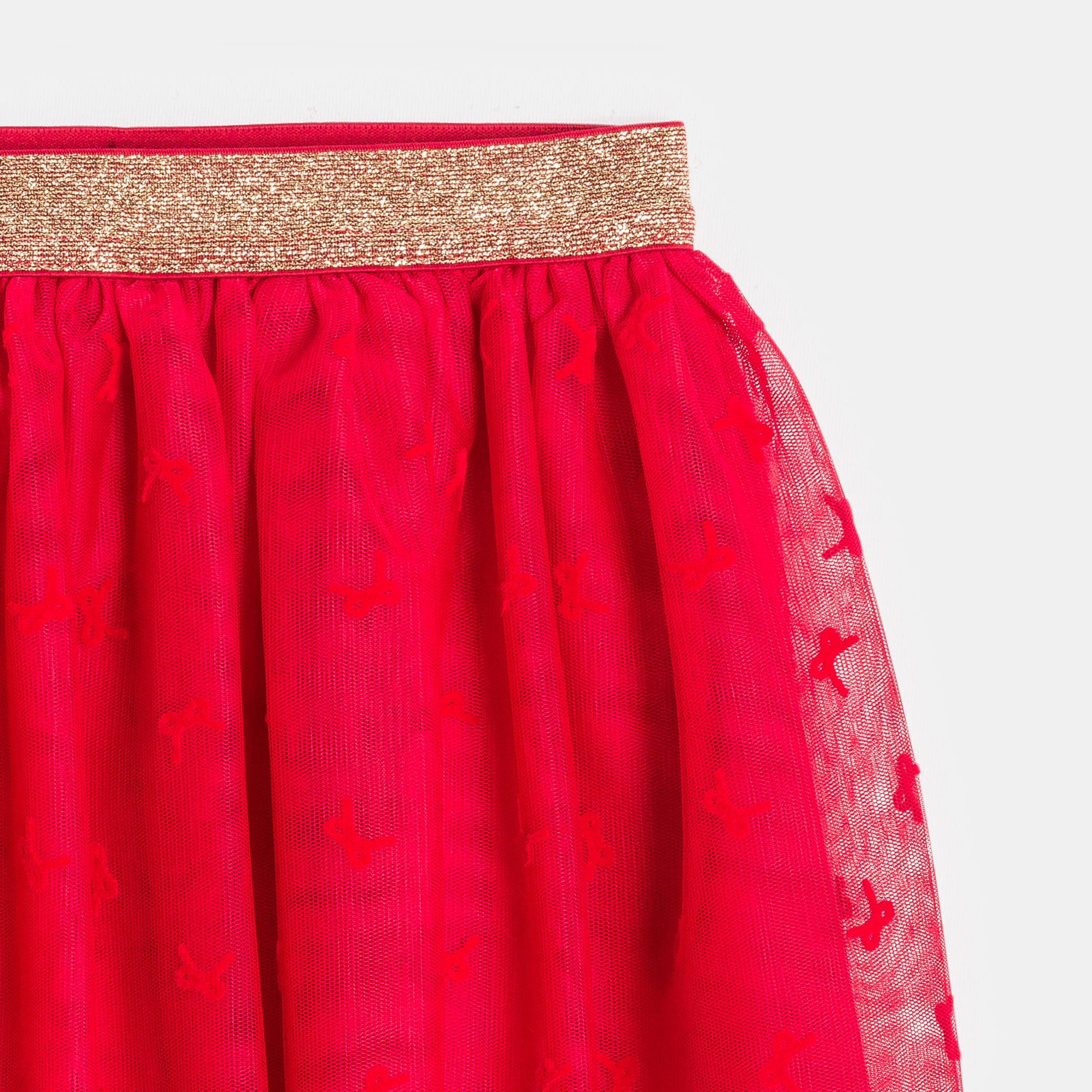 Превърнете всеки повод в ослепително тържество с тази ефирна червена тюлена пола, украсена с нежни шарки. Приляга удобно благодарение на блестящия златист ластик на талията. Идеална за специални поводи или дни, когато искате да блеснете. Лесна за обличане за максимален комфорт.Състав