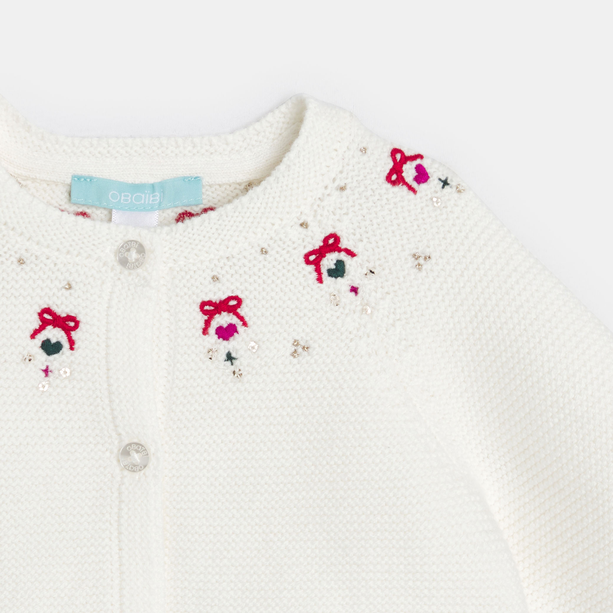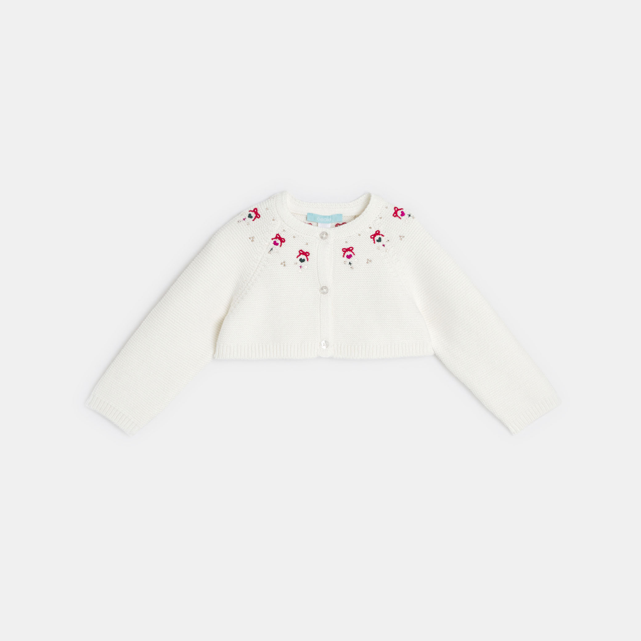 Добавете нотка мекота към всеки тоалет с това бяло болеро от мека, удобна плетка. Късата му кройка е идеална за обличане върху рокля или топ, а деликатната бродерия на раменете добавя изискан и цветен щрих. Перфектно както за специални поводи, така и за ежедневно носене, закопчава се лесно с красиви седефени копчета. Топло и шикозно допълнение към гардероба на всяко бебе.Състав