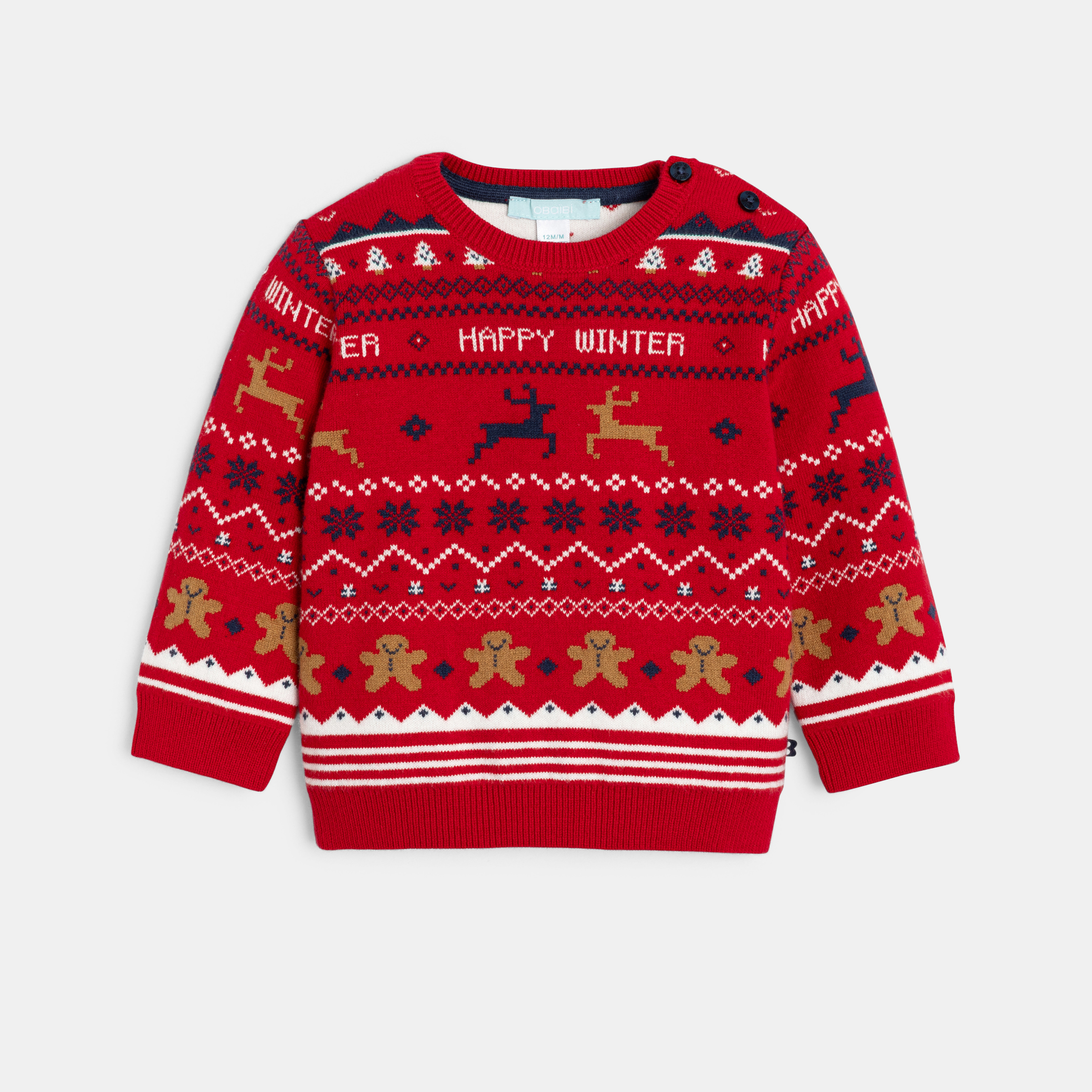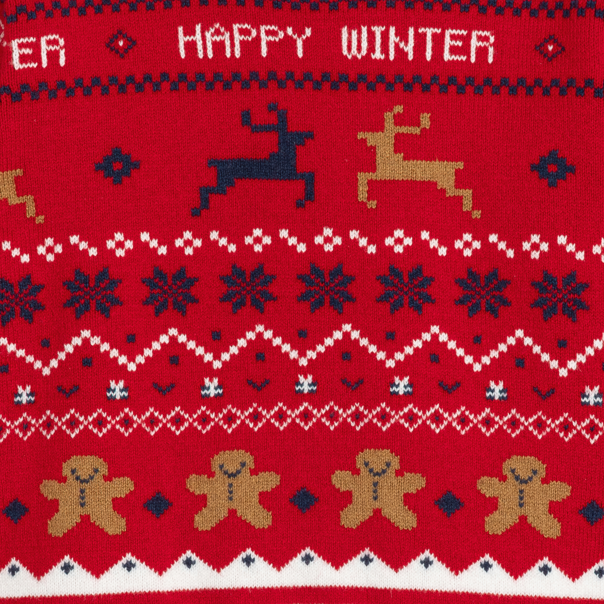 Този жакардов пуловер е идеален за празничния сезон. Декориран с празнични мотиви, включително елени и меденки, той обещава комфорт и стил. Извивка и дълги ръкави, идеални за по-хладните дни. Мека плетка за удобно носене през целия ден.Състав