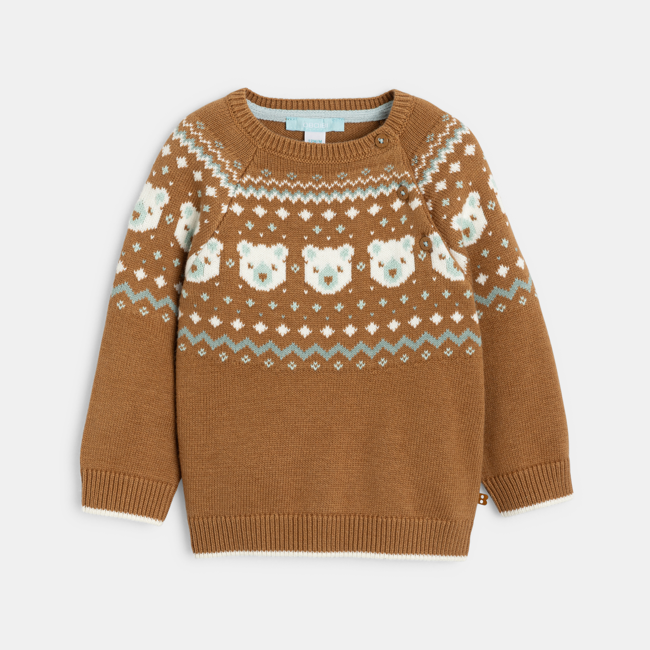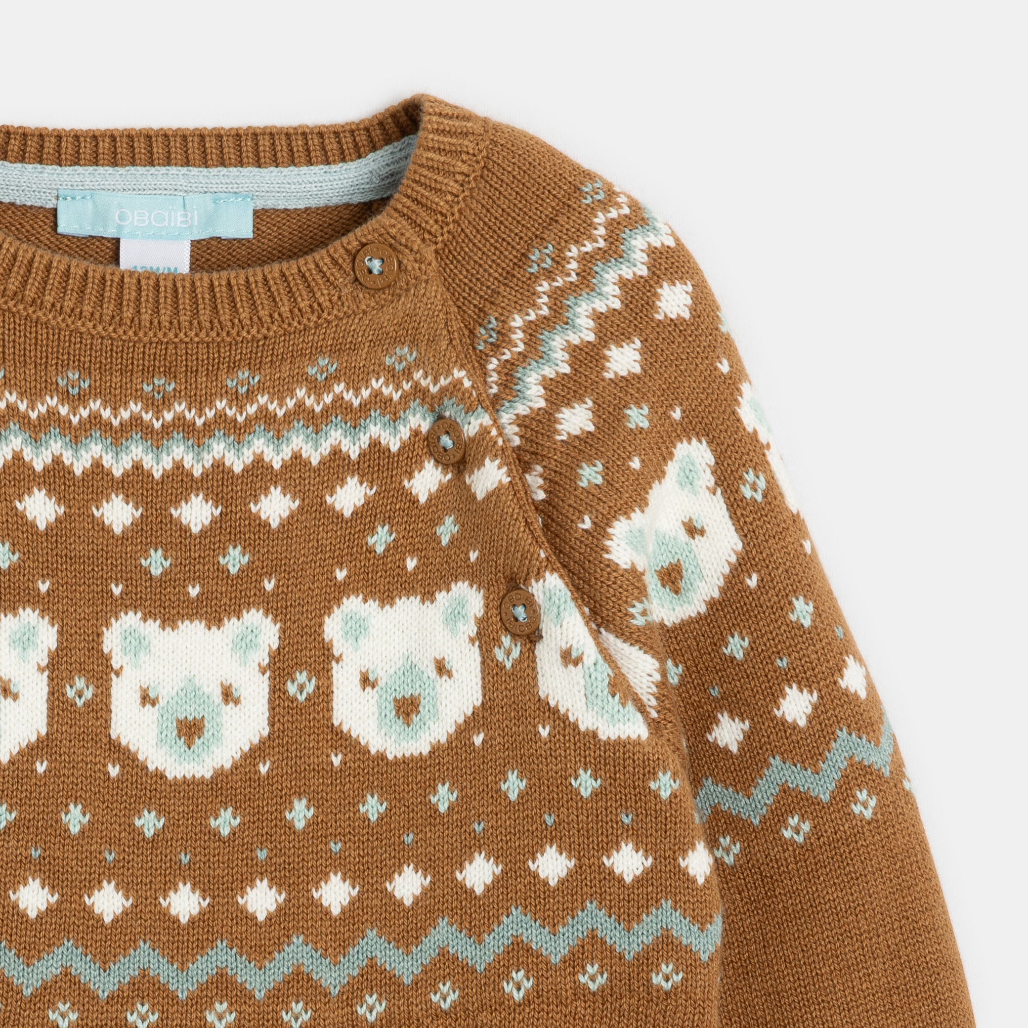 Очарователен кафяв пуловер от мека плетка, идеален за зимата! Дизайнът е с мотиви на мечета и кръгла яка. Копчета на рамото за лесно обличане. Перфектен за ежедневно носене, той предлага комфорт и стил. Дълги ръкави и оребрени маншети и подгъв.Състав