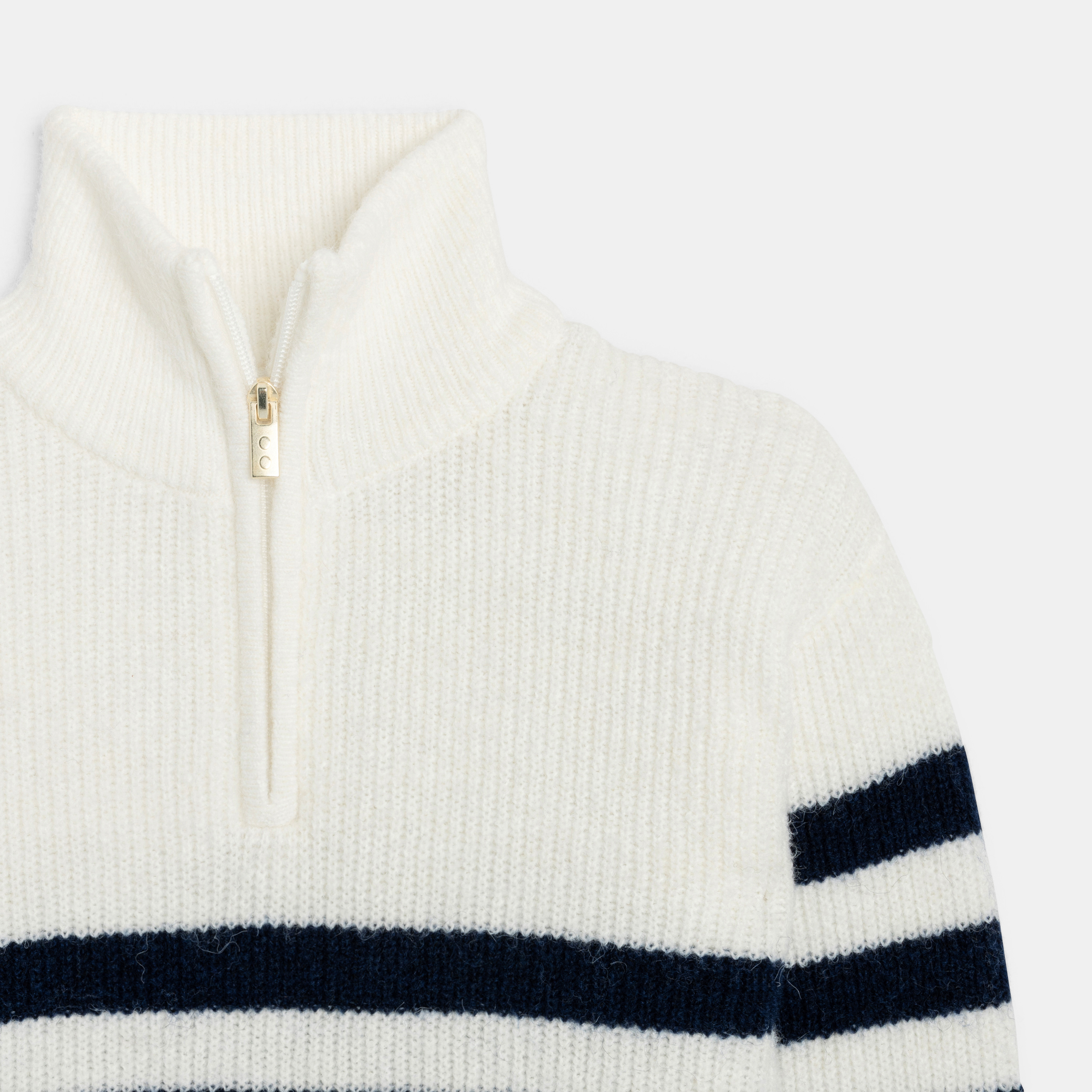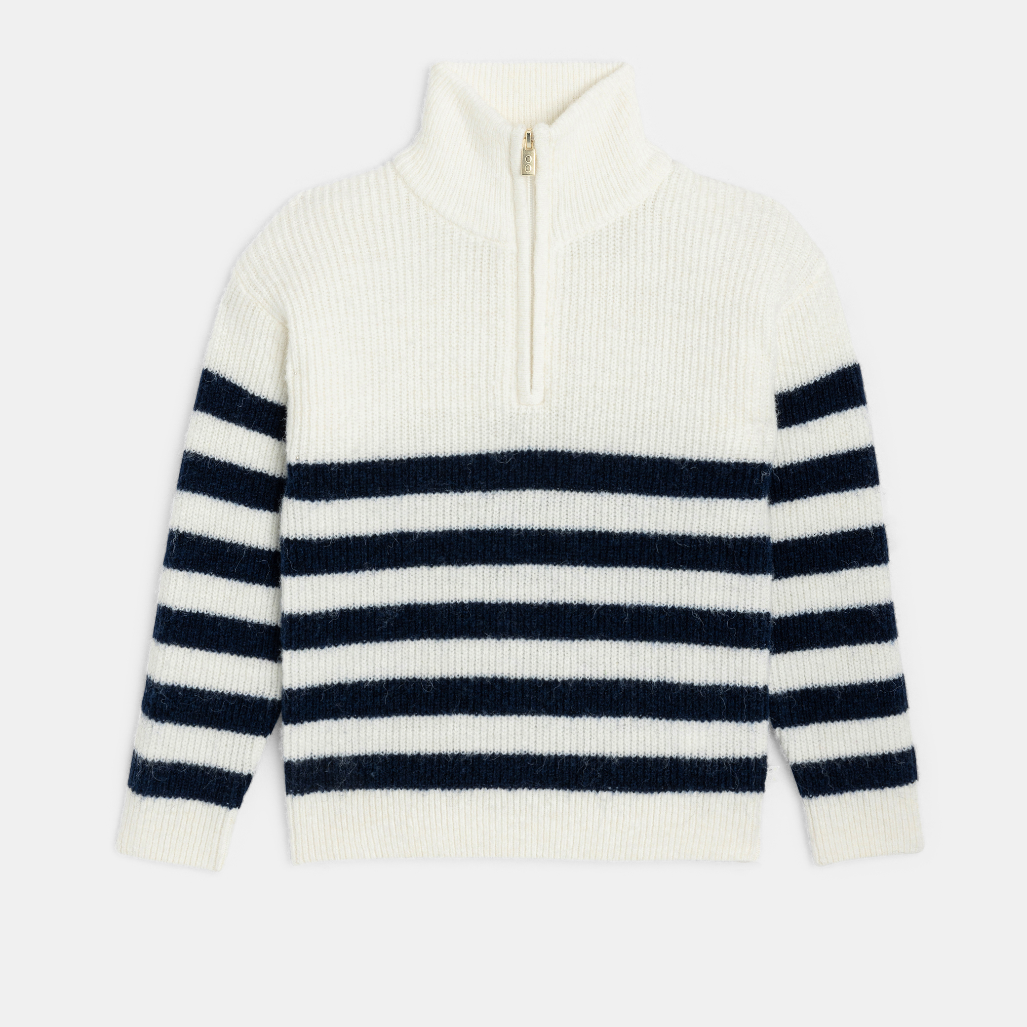 Изберете този раиран пуловер за вечен зимен стил. Плътната му плетка осигурява топлина и комфорт, идеален за хладните дни. Високата му яка с цип осигурява регулируема защита. Дългите ръкави и свободната кройка осигуряват оптимален комфорт. Перфектен за небрежно-елегантна визия.Състав