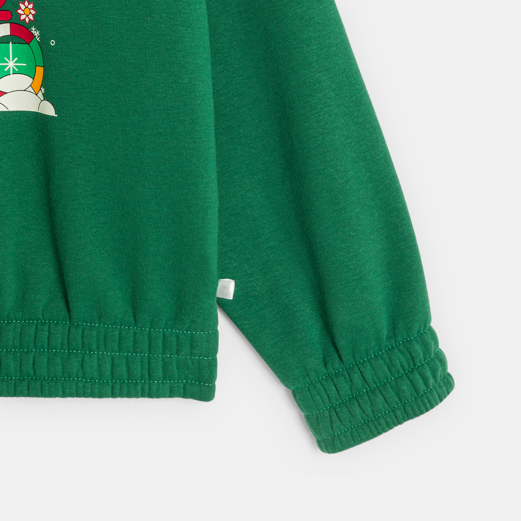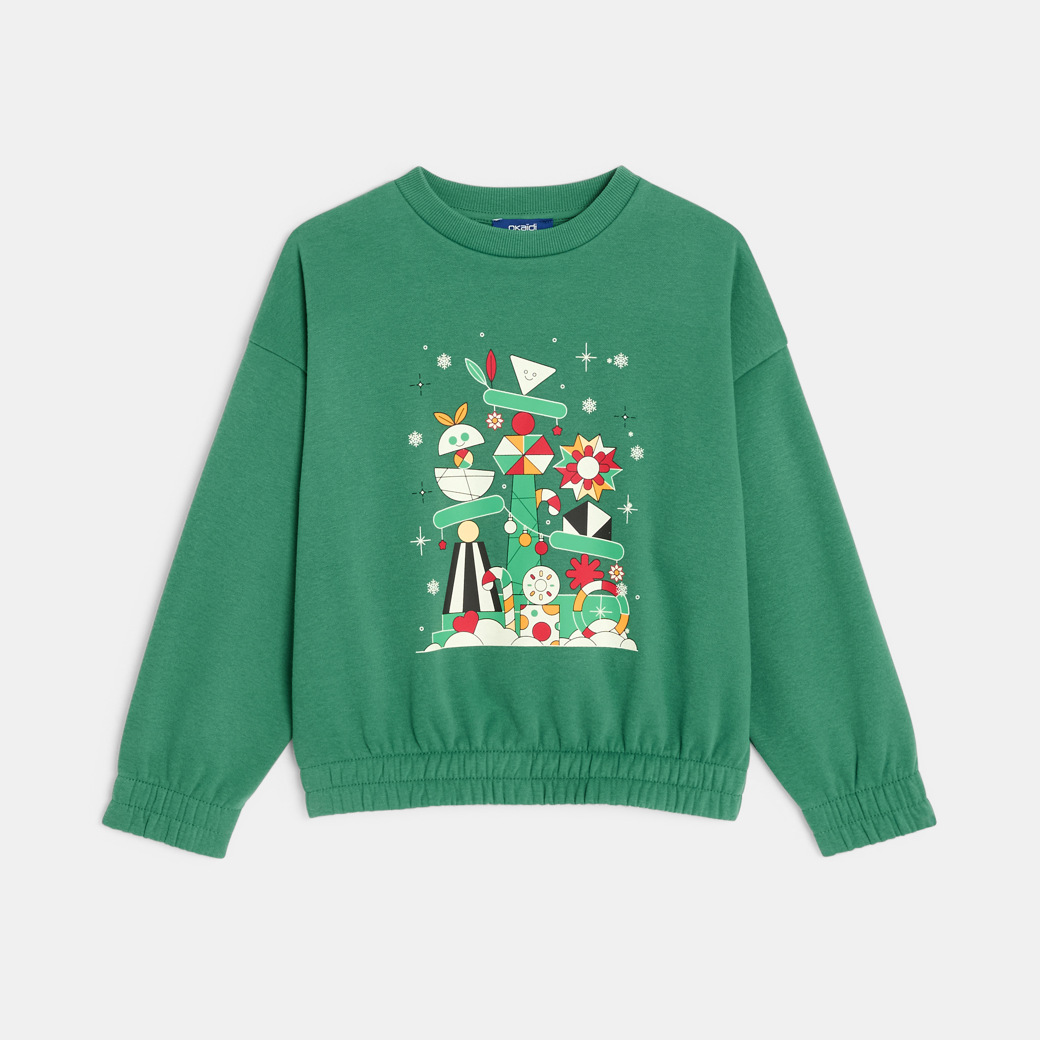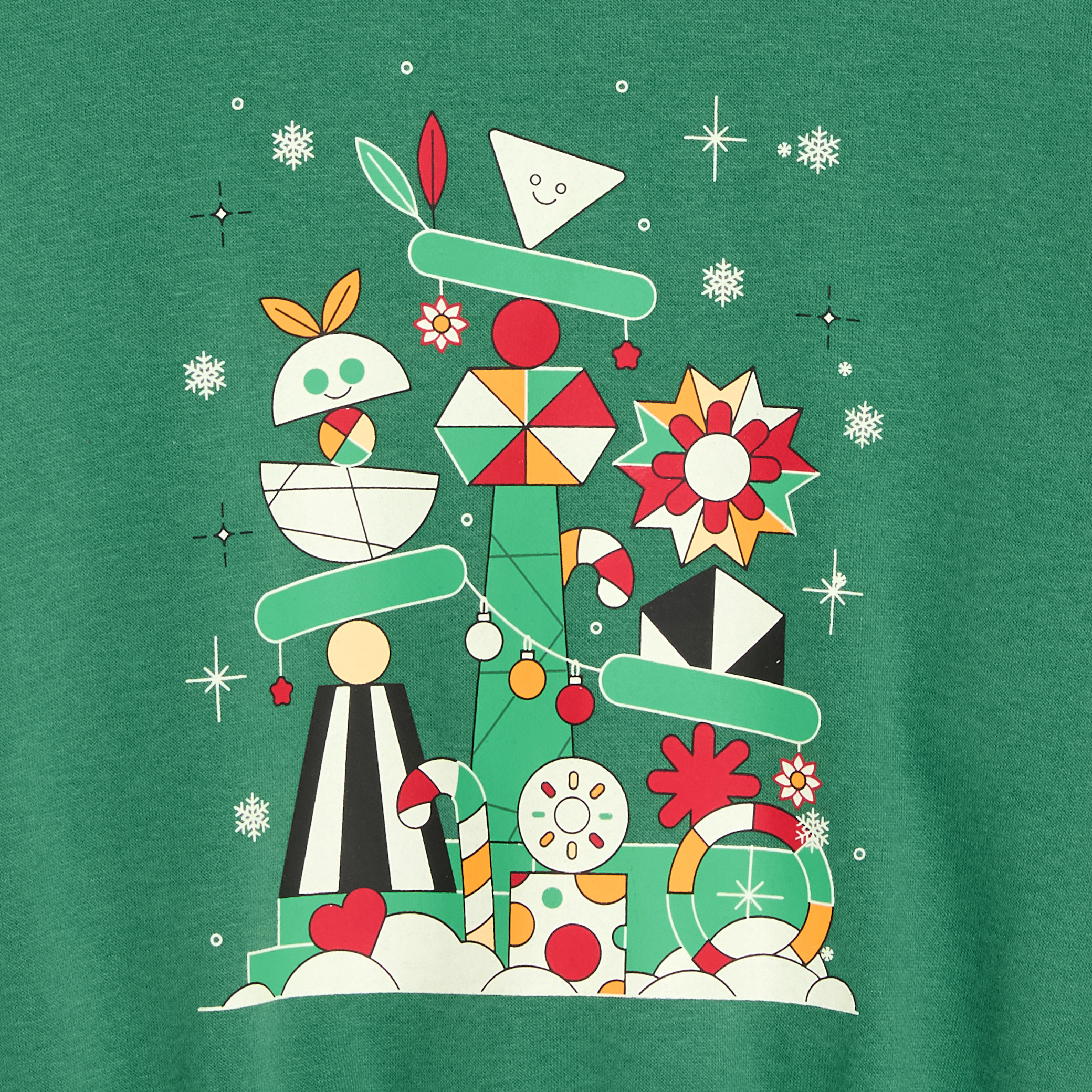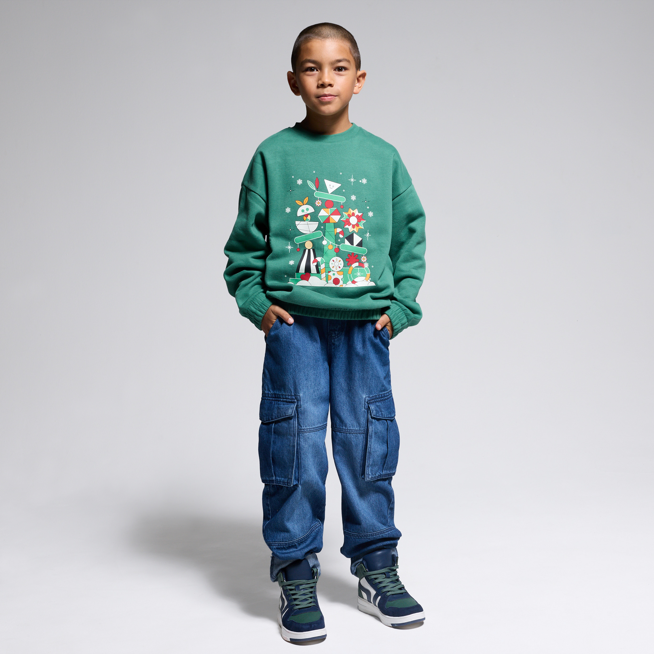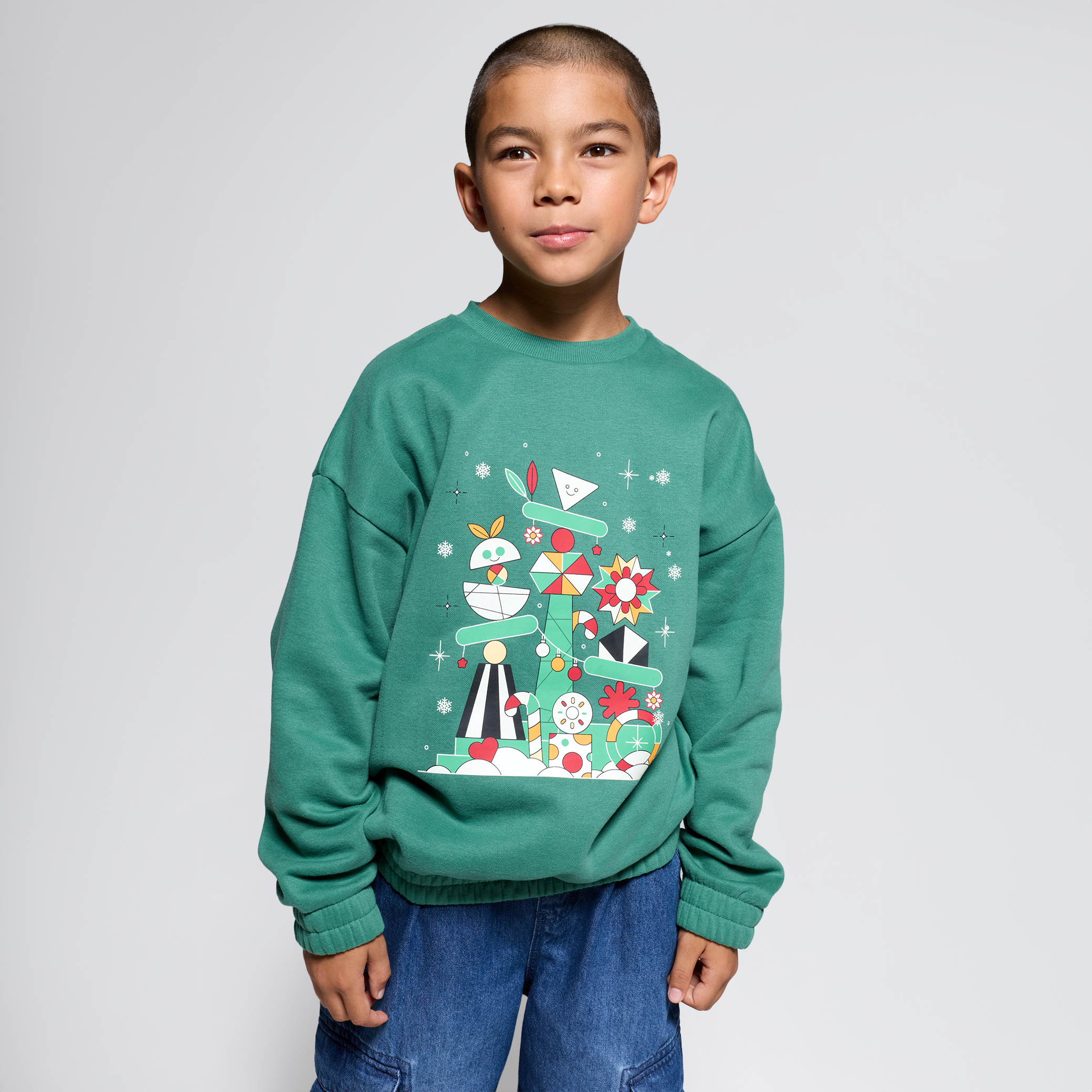 Насладете се на пъстър и оживен празничен сезон с това съвместно творение на Okaïdi и Maison Tangible. Инсталирайте приложението, сканирайте QR кода на етикета на дрехата и вдъхнете живот на дизайните с добавена реалност! Топлината и стилът се съчетават в този зелен детски суитшърт! Изработен от мек полар, той е с нормална кройка и празничен дизайн отпред. Има кръгло деколте, дълги ръкави и еластични маншети за допълнителен комфорт. Щампата отпред има фосфоресциращ ефект.Състав
