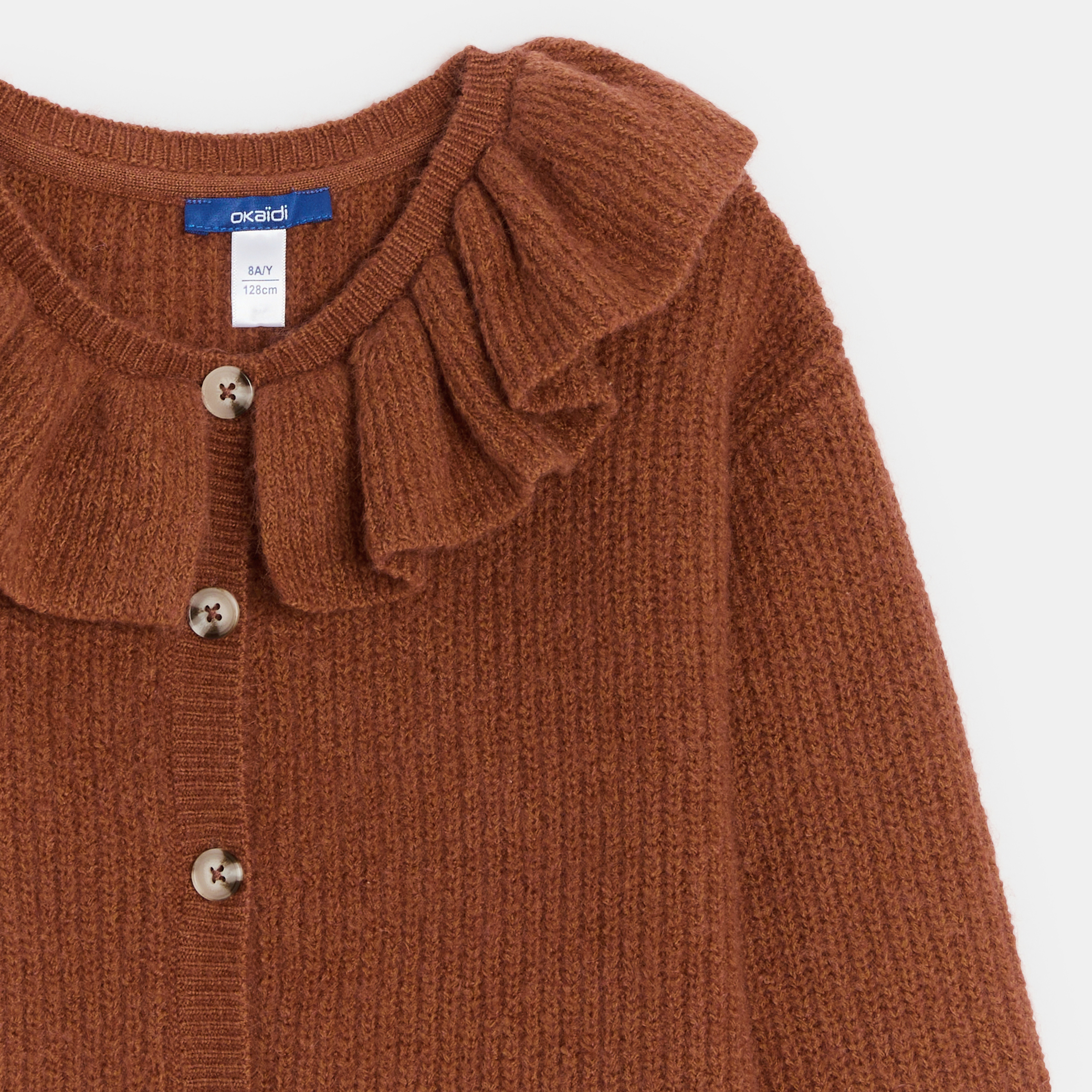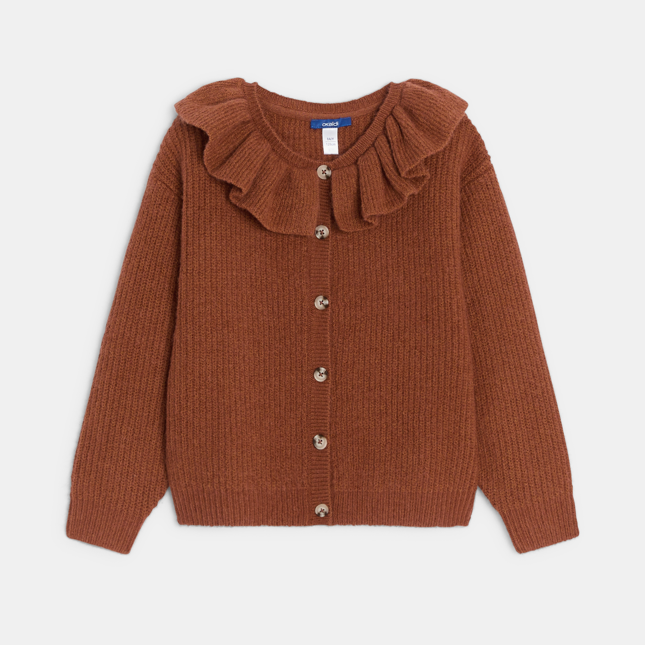 Тази елегантна кафява жилетка от мека плетка ще ви спечели с деликатната си яка с волани. С дълги ръкави и закопчаване с копчета, тя предлага едновременно стил и комфорт. Перфектна е за всекидневна употреба и е лесна за носене благодарение на свободната си кройка. Задължителна част от гардероба на всяко малко дете!Състав