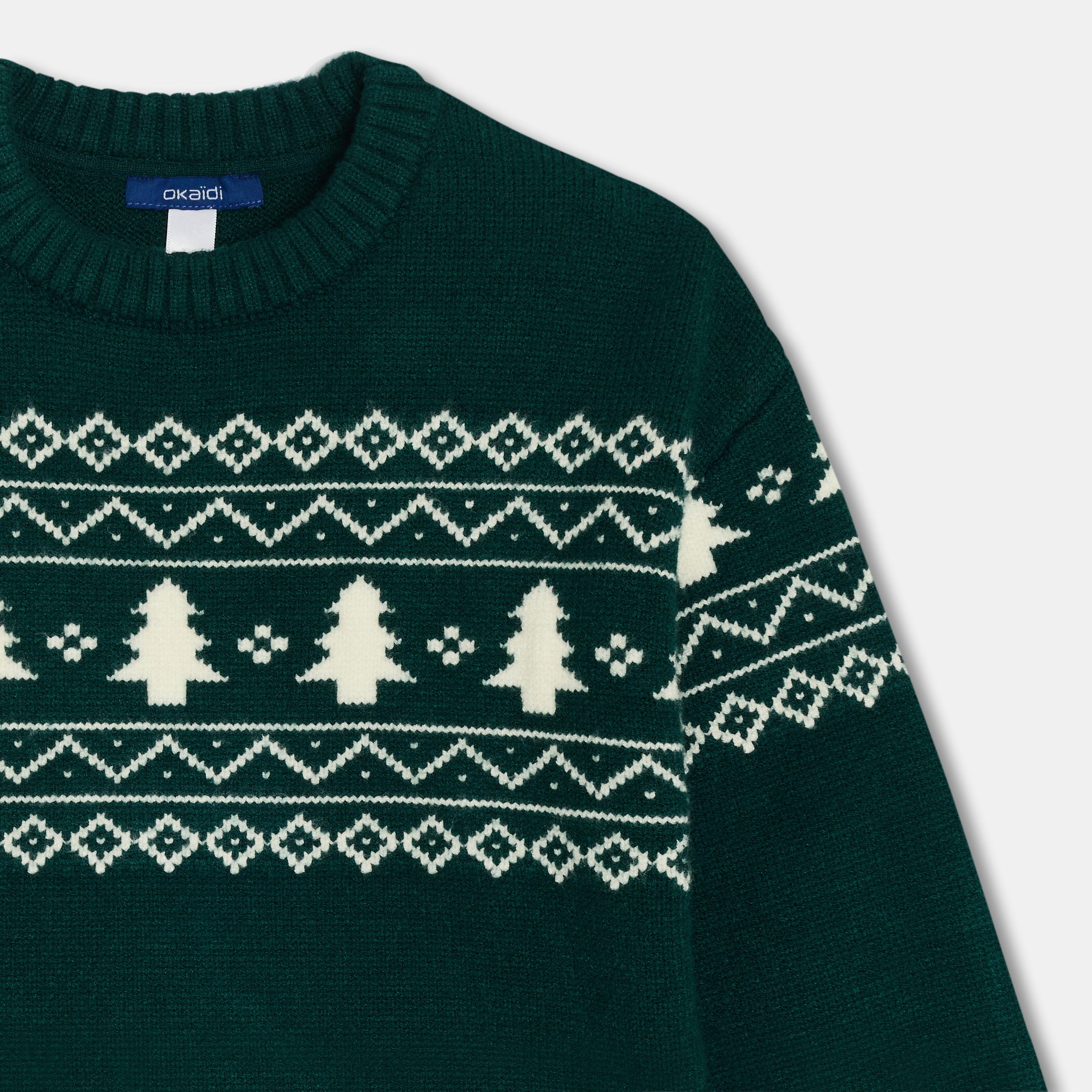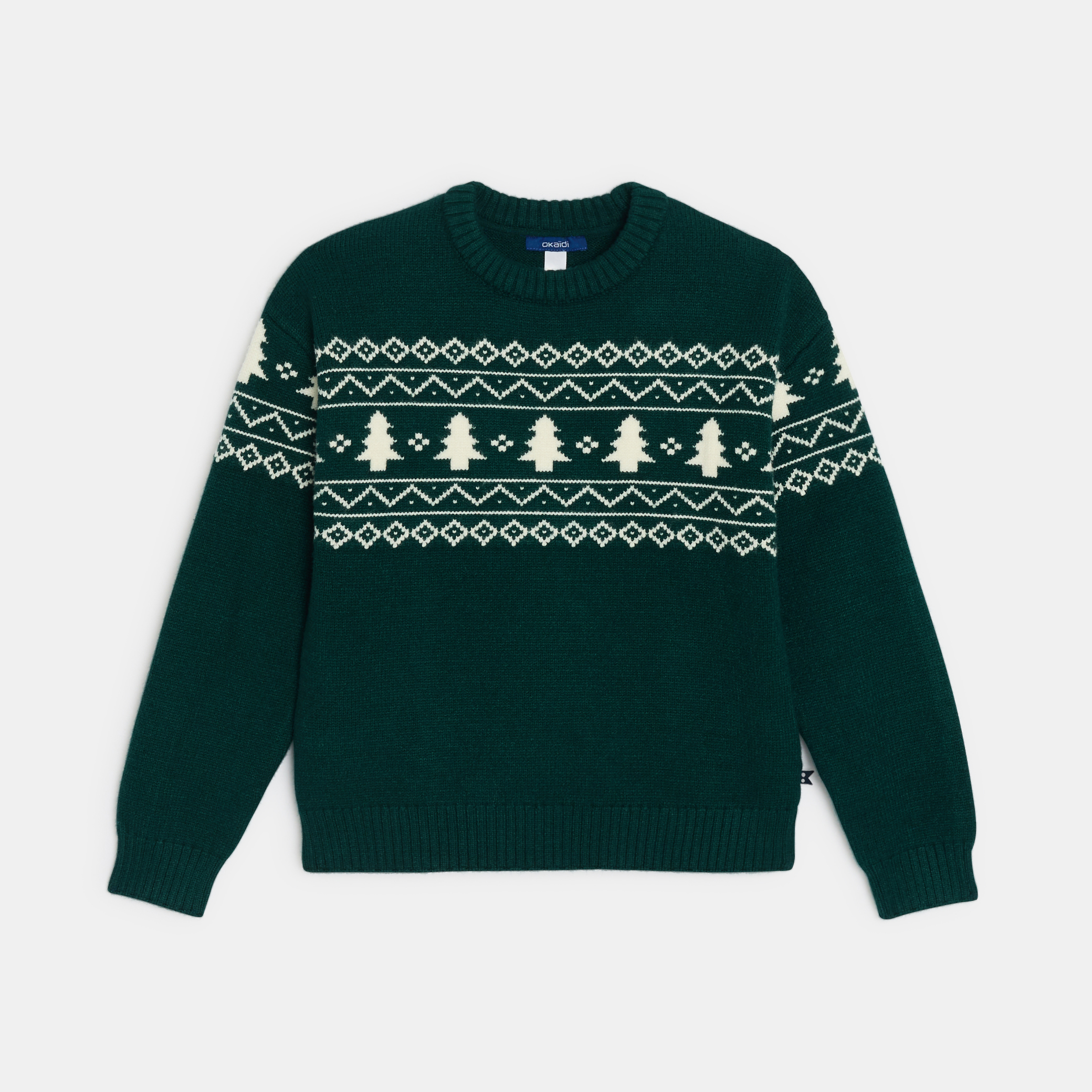 Този мек зелен плетен пуловер очарова със зимния си мотив на елха. Стандартната кройка осигурява оптимален комфорт. Обикновената яка и оребрените маншети осигуряват топлина и перфектно прилягане. Идеален за празниците или уютните дни у дома. Лесен за обличане, той бързо ще се превърне в сезонна необходимост.Състав