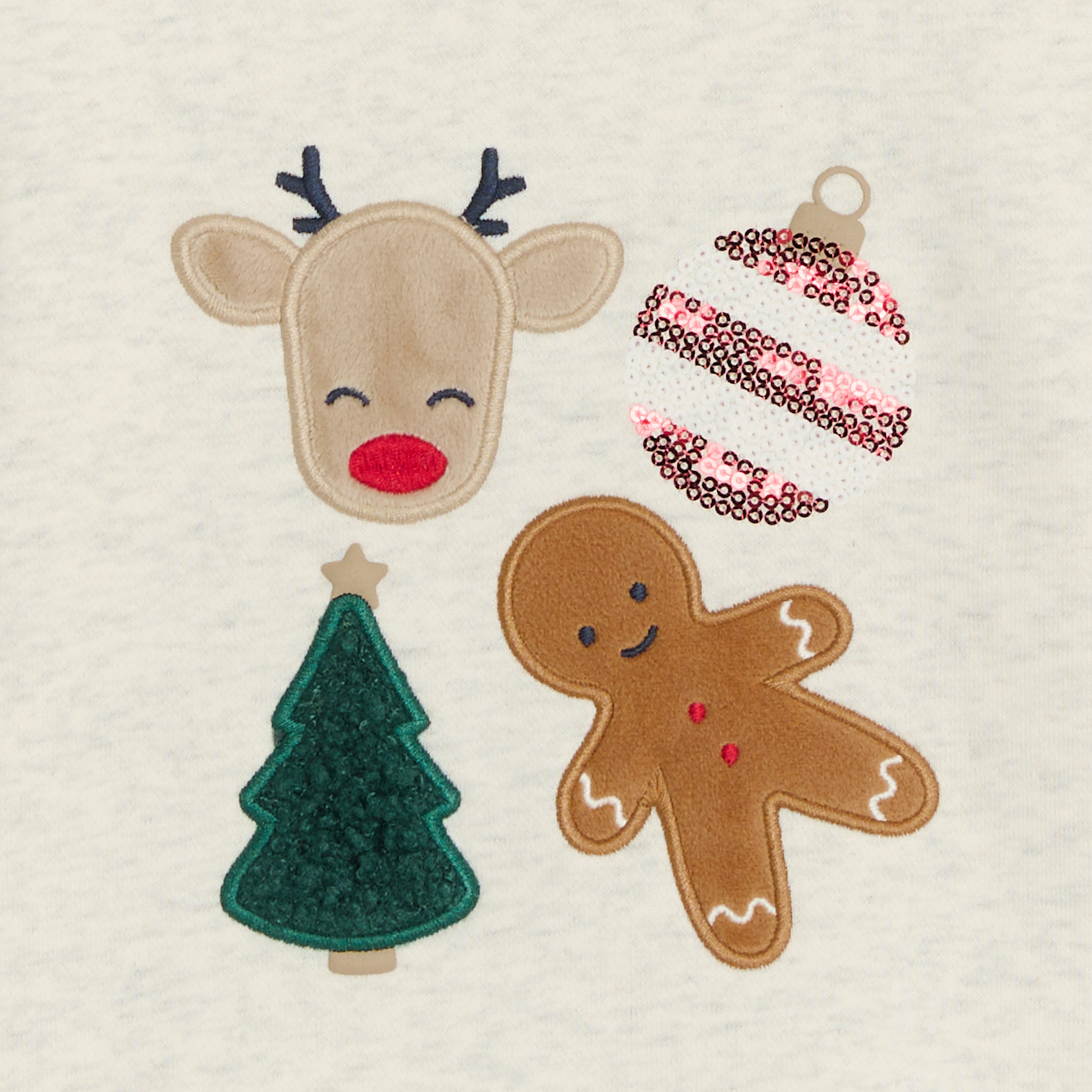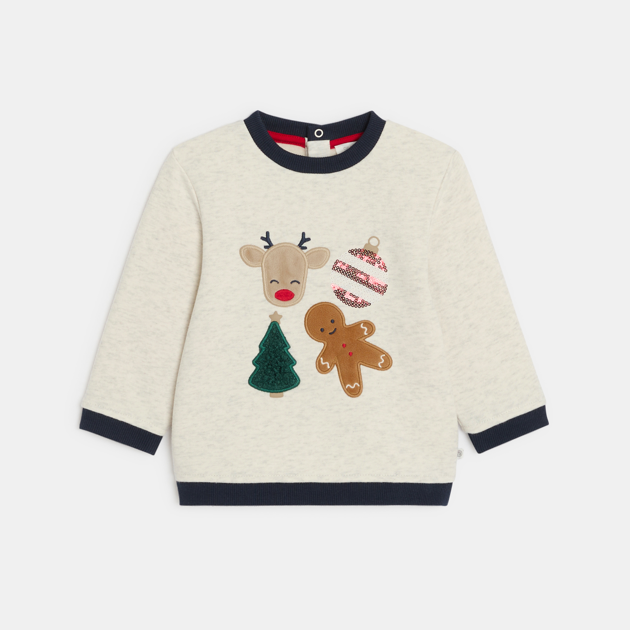 Очарователен бежов суитшърт с права, удобна кройка. Изработен от мек памук с контрастен оребрен кант, той е с празнични мотиви: елен, коледна елха, бисквитка и коледна топка. Идеален за празниците или ежедневно носене, този суитшърт предлага едновременно топлина и стил. Лесен за обличане с копче тип тик-так.Състав