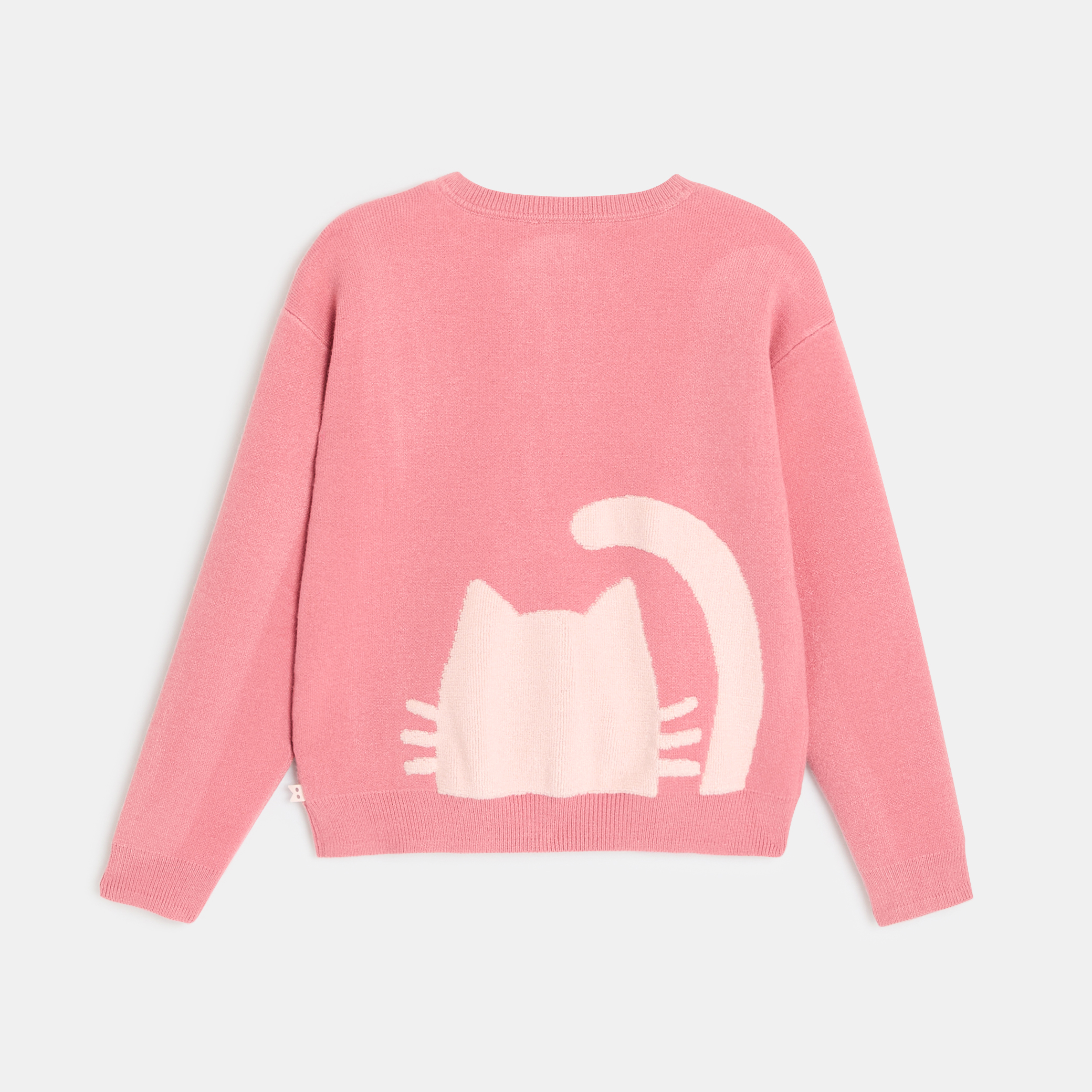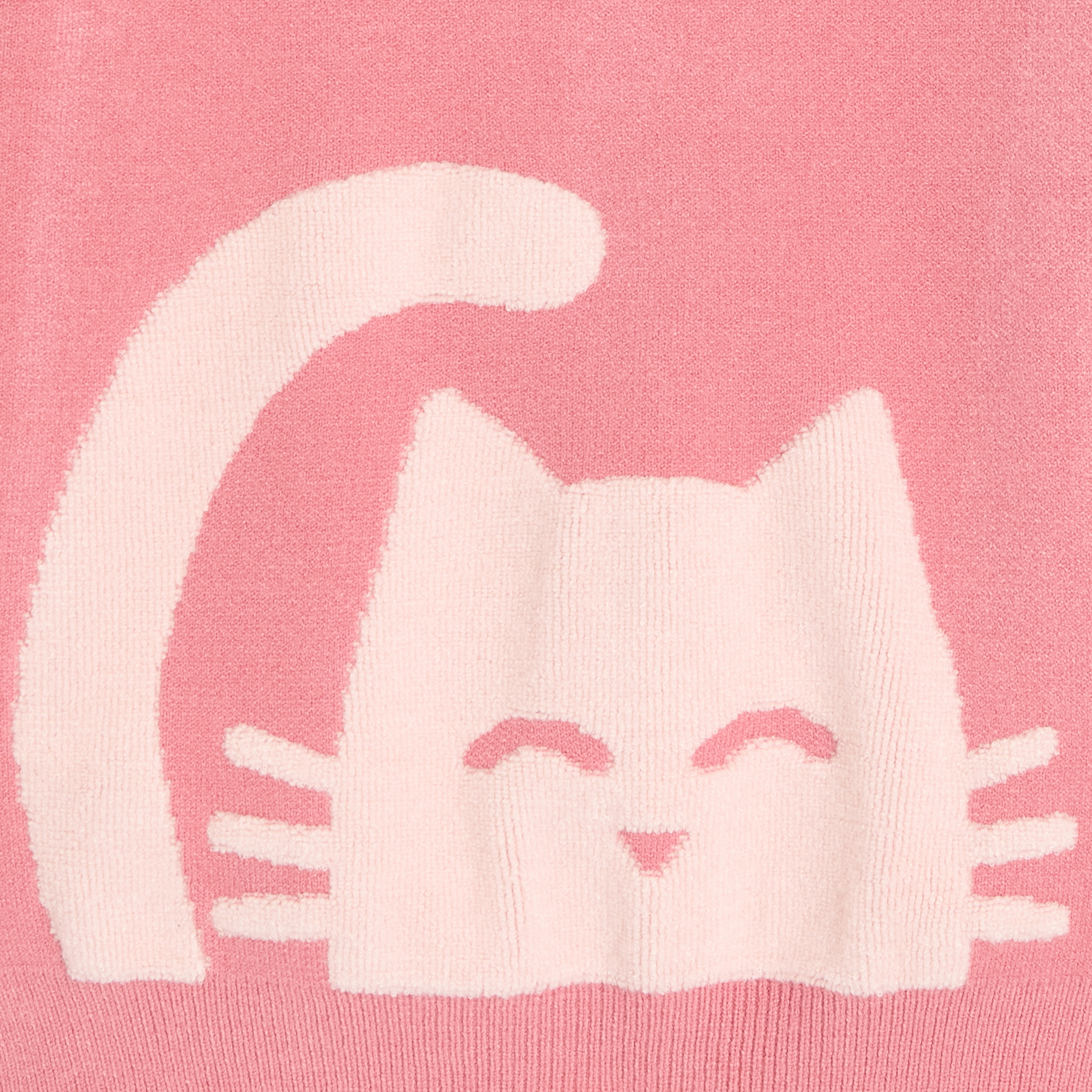Той е забавен и оригинален: има котешки мотив отпред и отзад! Не можете да устоите на мекотата на фината, еластична плетка. Кройката е малко по-тясна в долния край. Дълги ръкави. Прав подгъв.Състав