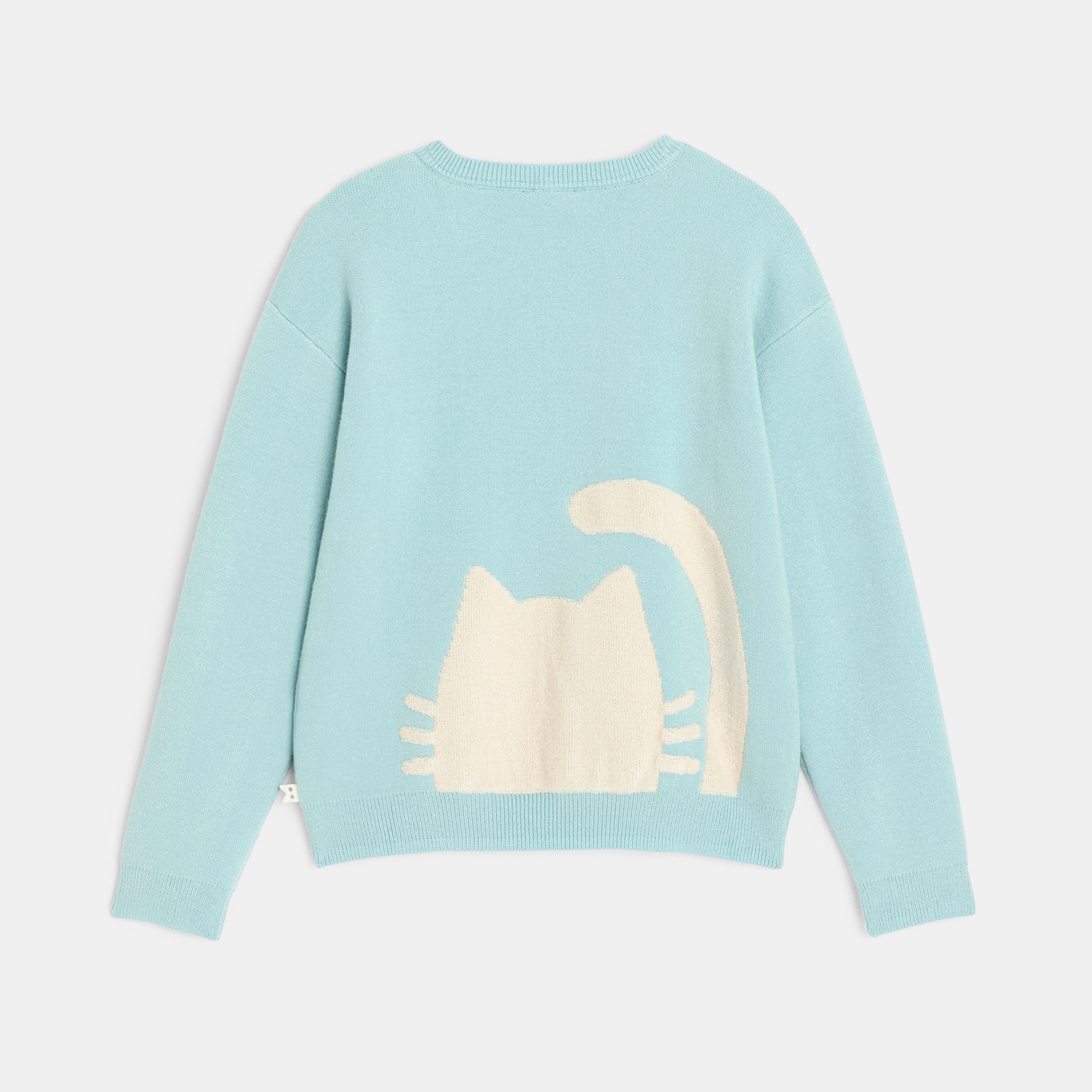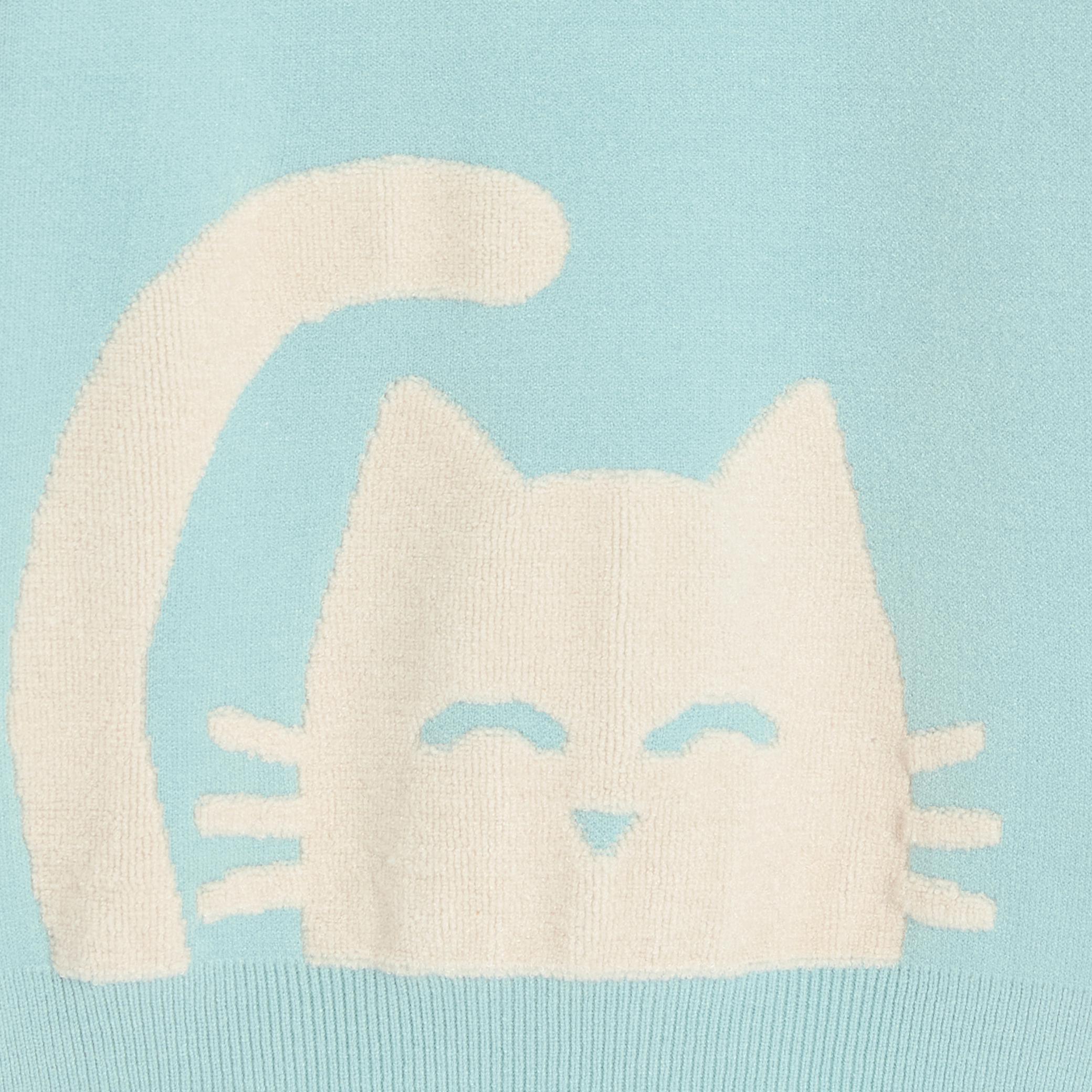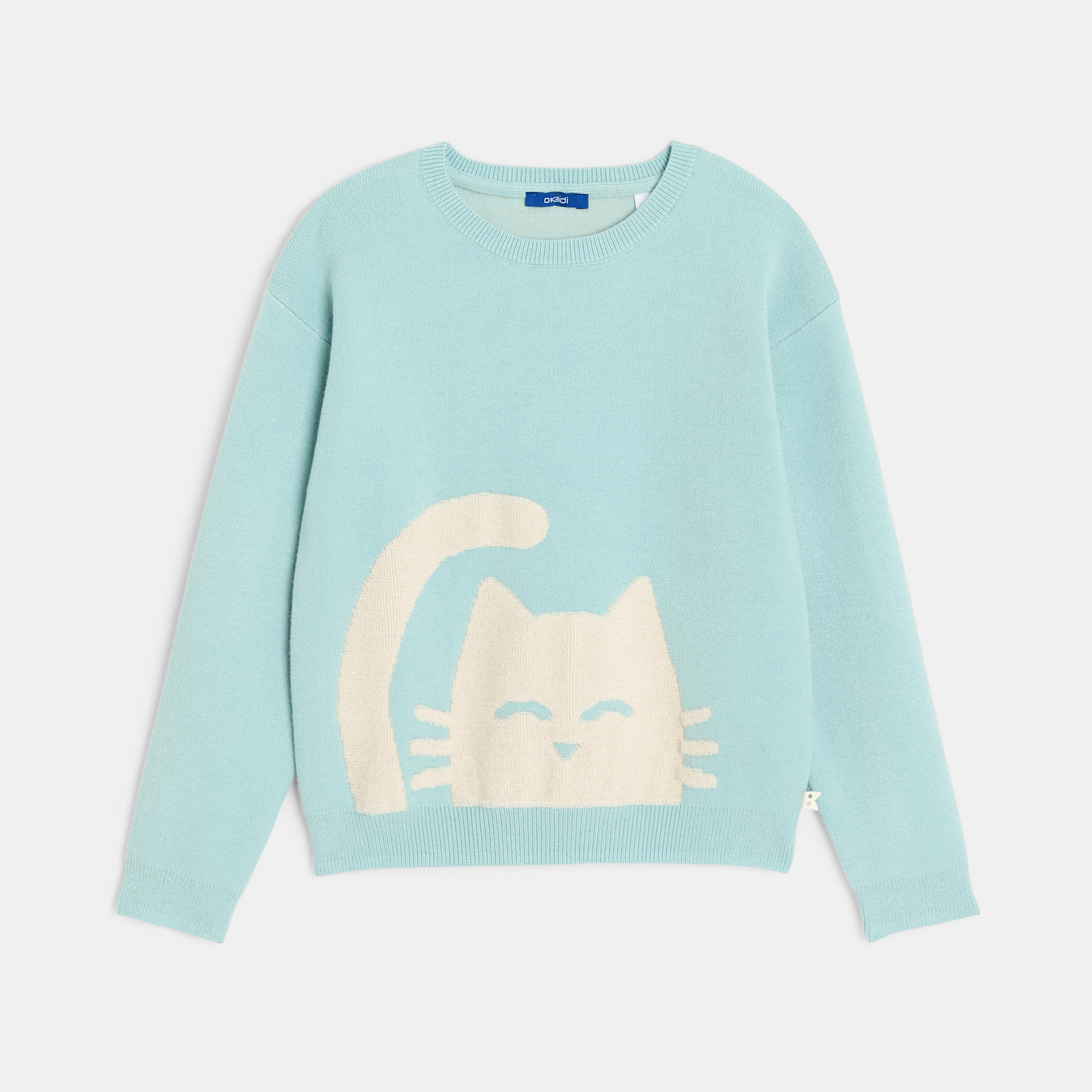 Той е забавен и оригинален: има котешки мотив отпред и отзад! Не можете да устоите на мекотата на фината, еластична плетка. Кройката е малко по-тясна в долния край. Дълги ръкави. Прав подгъв.Състав