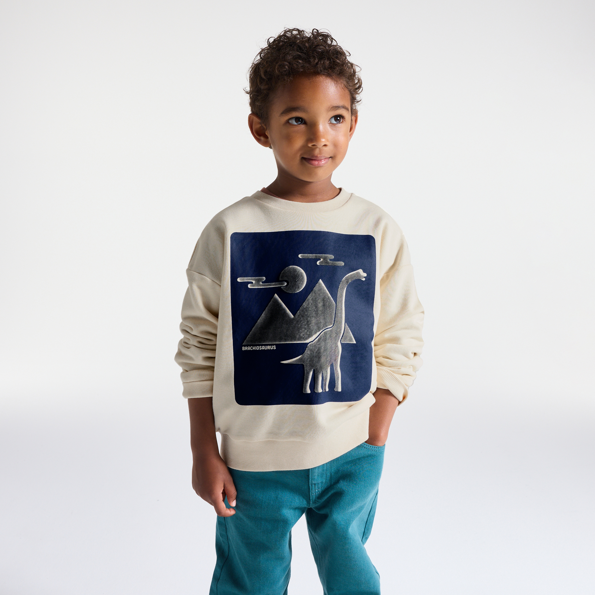 Този суитшърт е с правилна кройка за ежедневен комфорт. Изработен от мек памук, той е с мотив на динозавър отпред, идеален за малките изследователи. Обло деклоте и дълги аръкави за класически вид. Идеален за всички сезони, предлагащ лекота на движенията и небрежен стил.Състав
