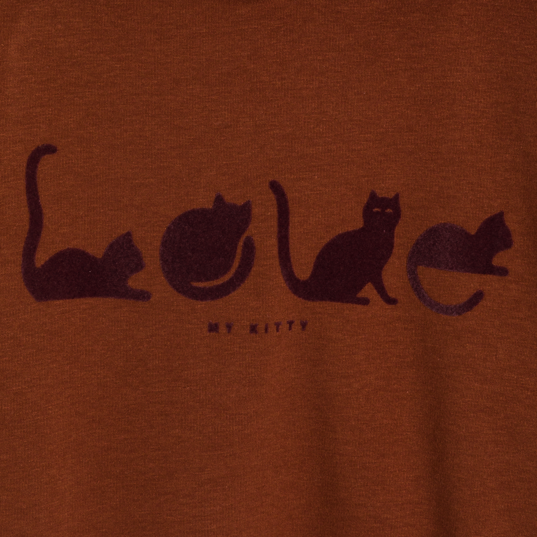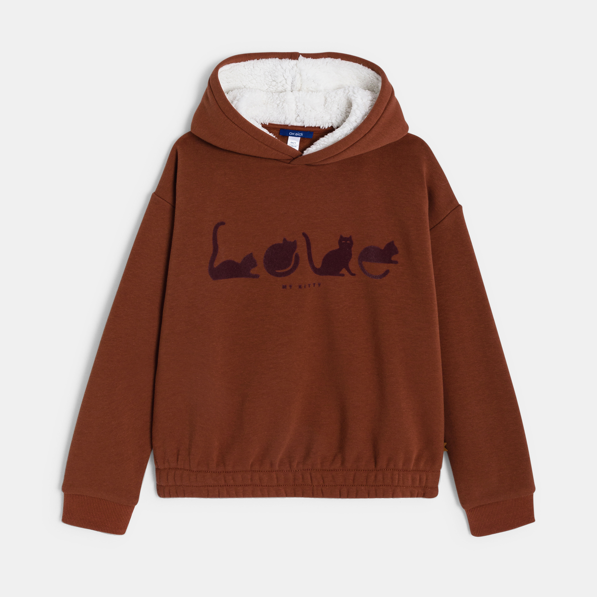 Няма да можете да устоите на този кафяв суитшърт с качулка, изработен от мек полар и подплатен с шерпа за абсолютен комфорт. Той е с дълги ръкави, оребрени маншети и котешки мотив „любов“. Идеален за ежедневно носене, лесен е за обличане и ви държи топли със стил.Състав
