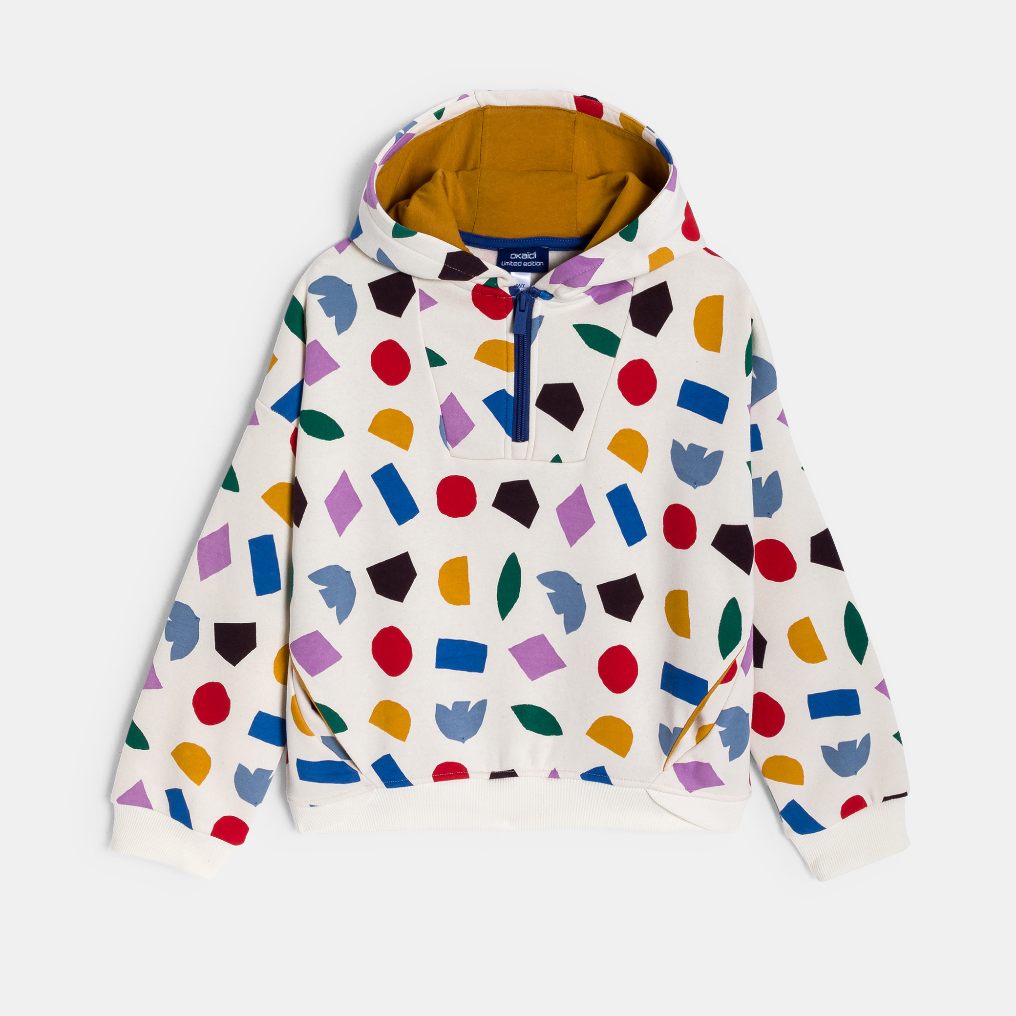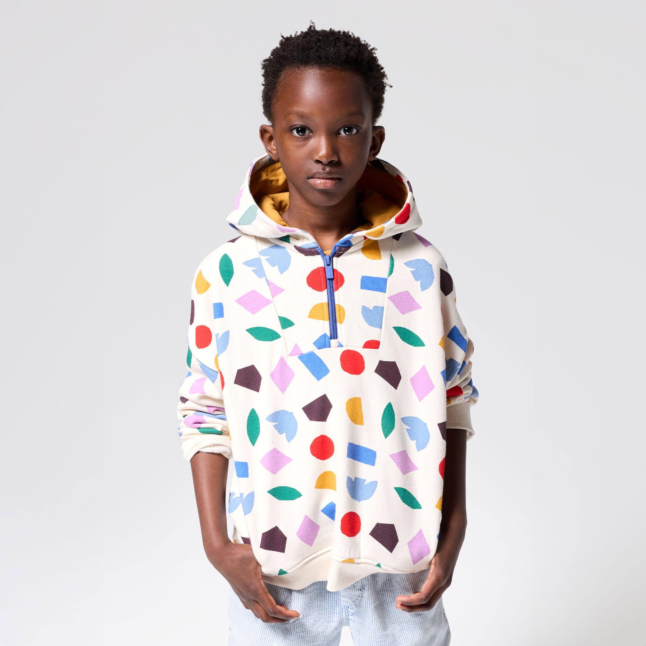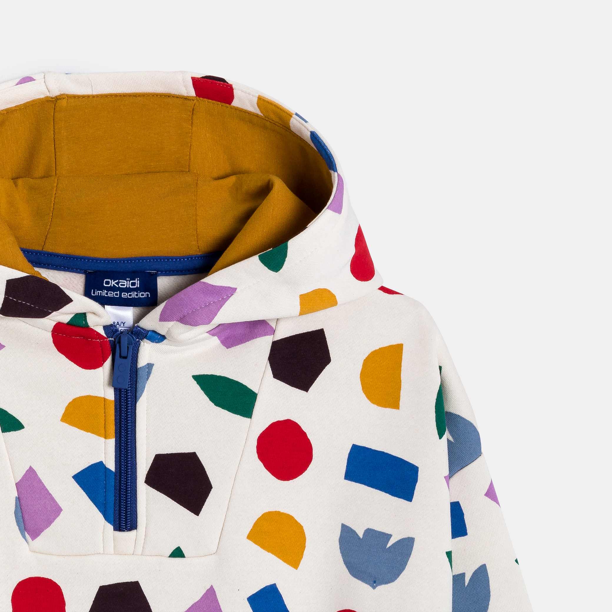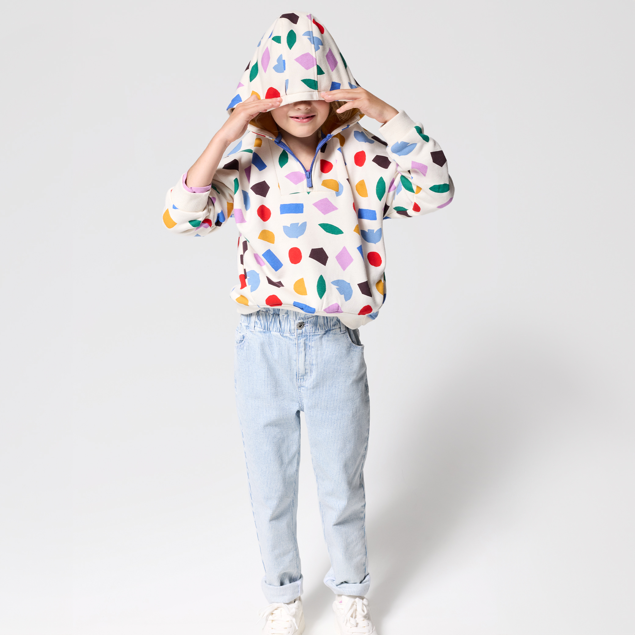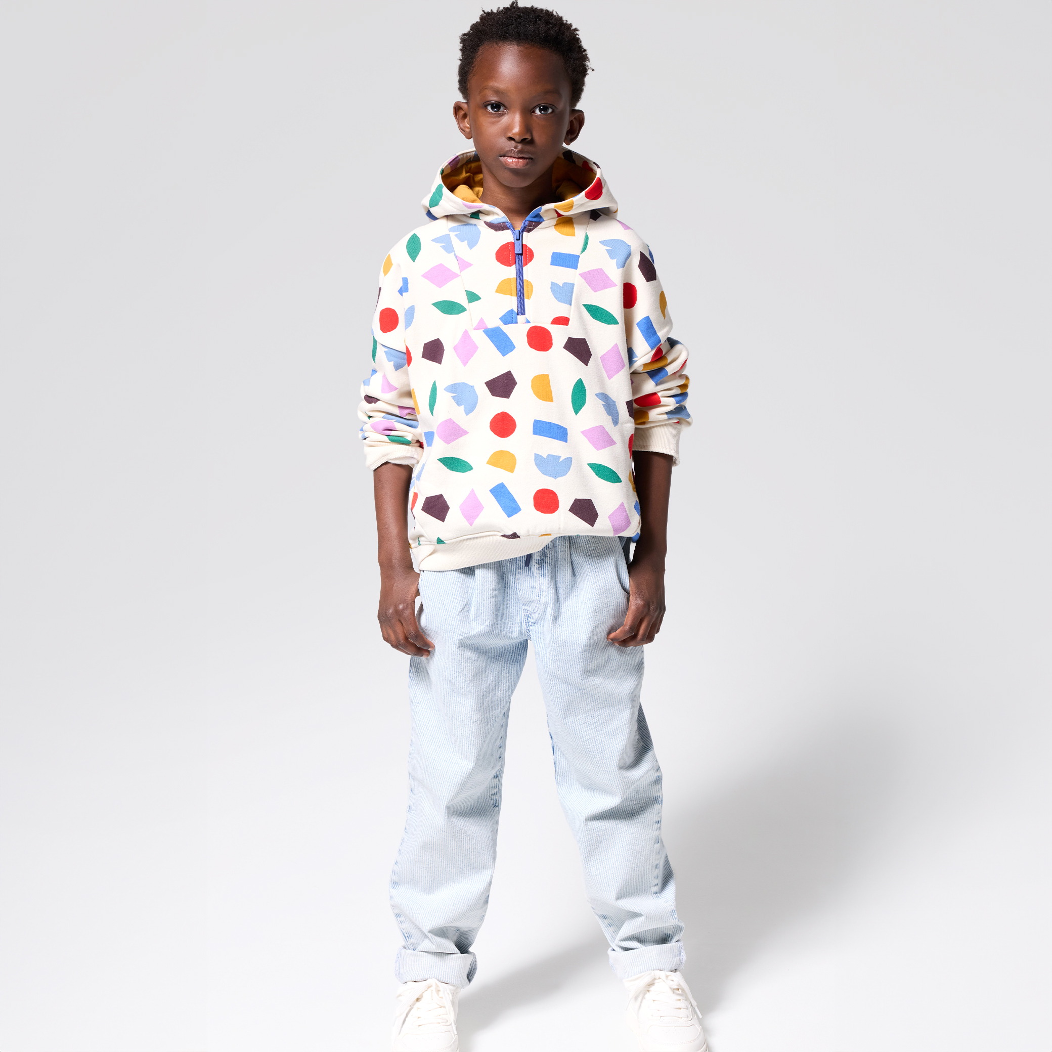 Изблик на цвят в този бял суитчър с многоцветни геометрични мотиви! Той осигурява комфорт и стил. Качулка, практичен полуцип. Перфектен за ежедневието на малките приключенци. Дълги ръкави и оребрени маншети и подгъв. Идеален за актуална, ежедневна визия.За началото на учебната 2025 година Okaïdi имаше удоволствието да си сътрудничи с международния мултидисциплинарен художник Матиас Ларайн.