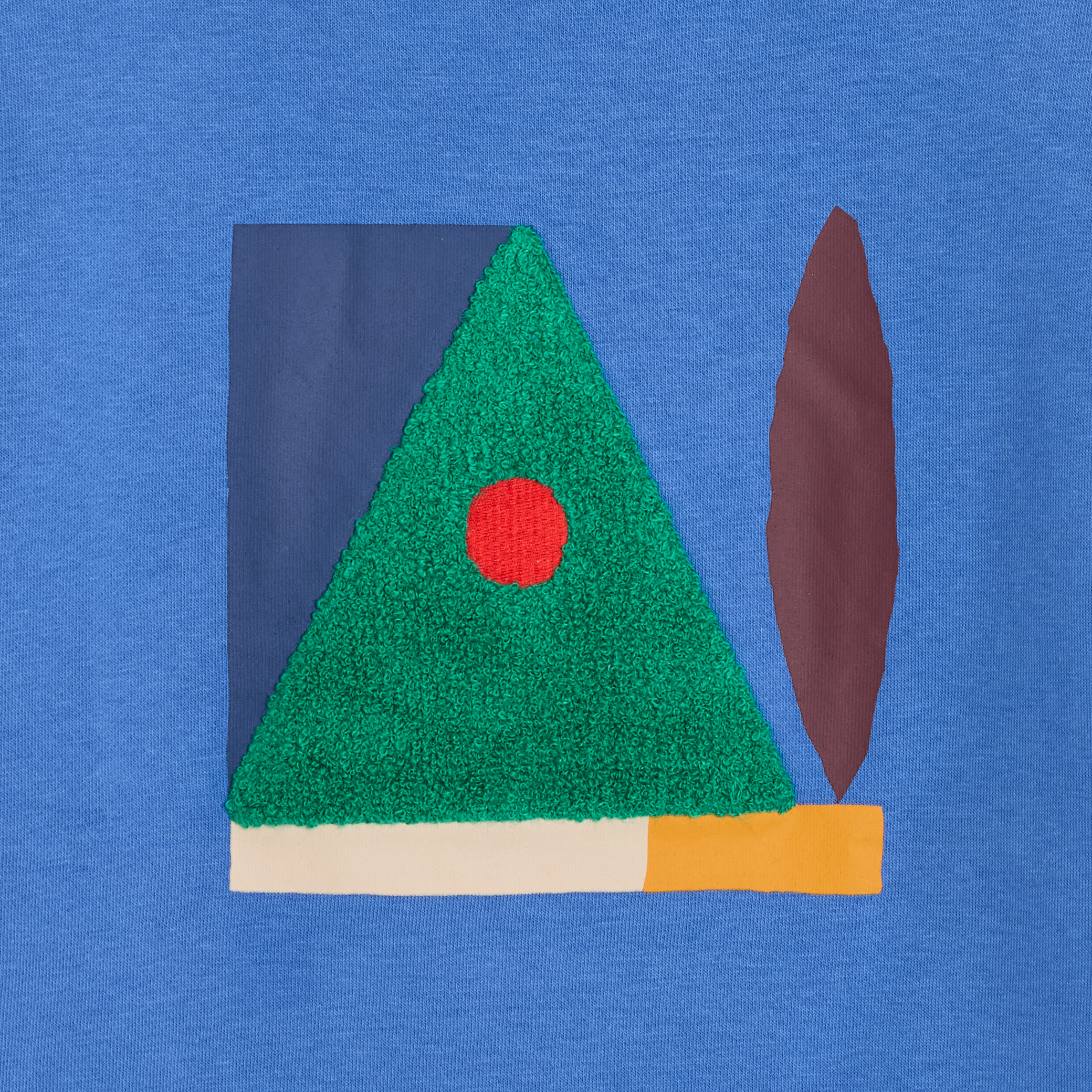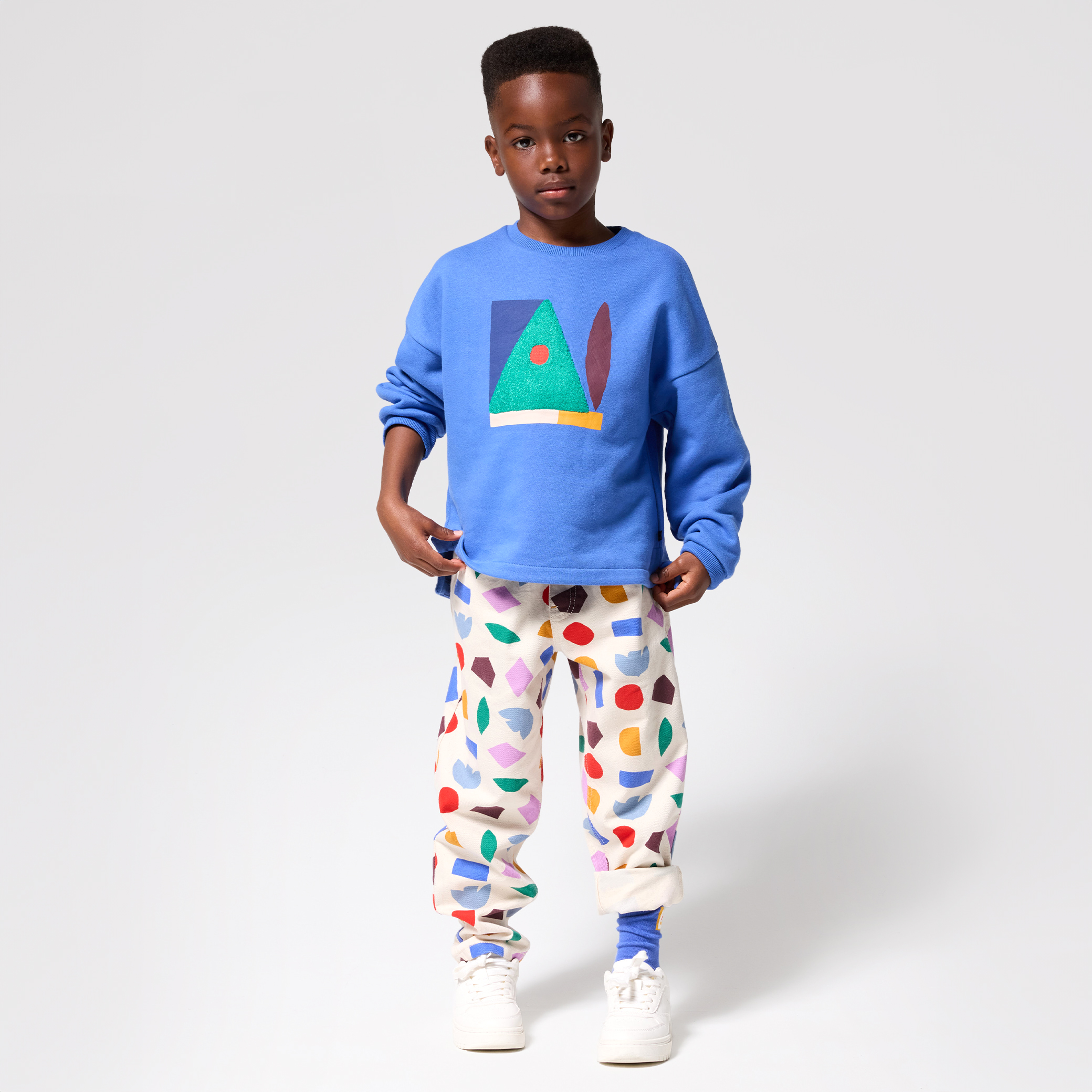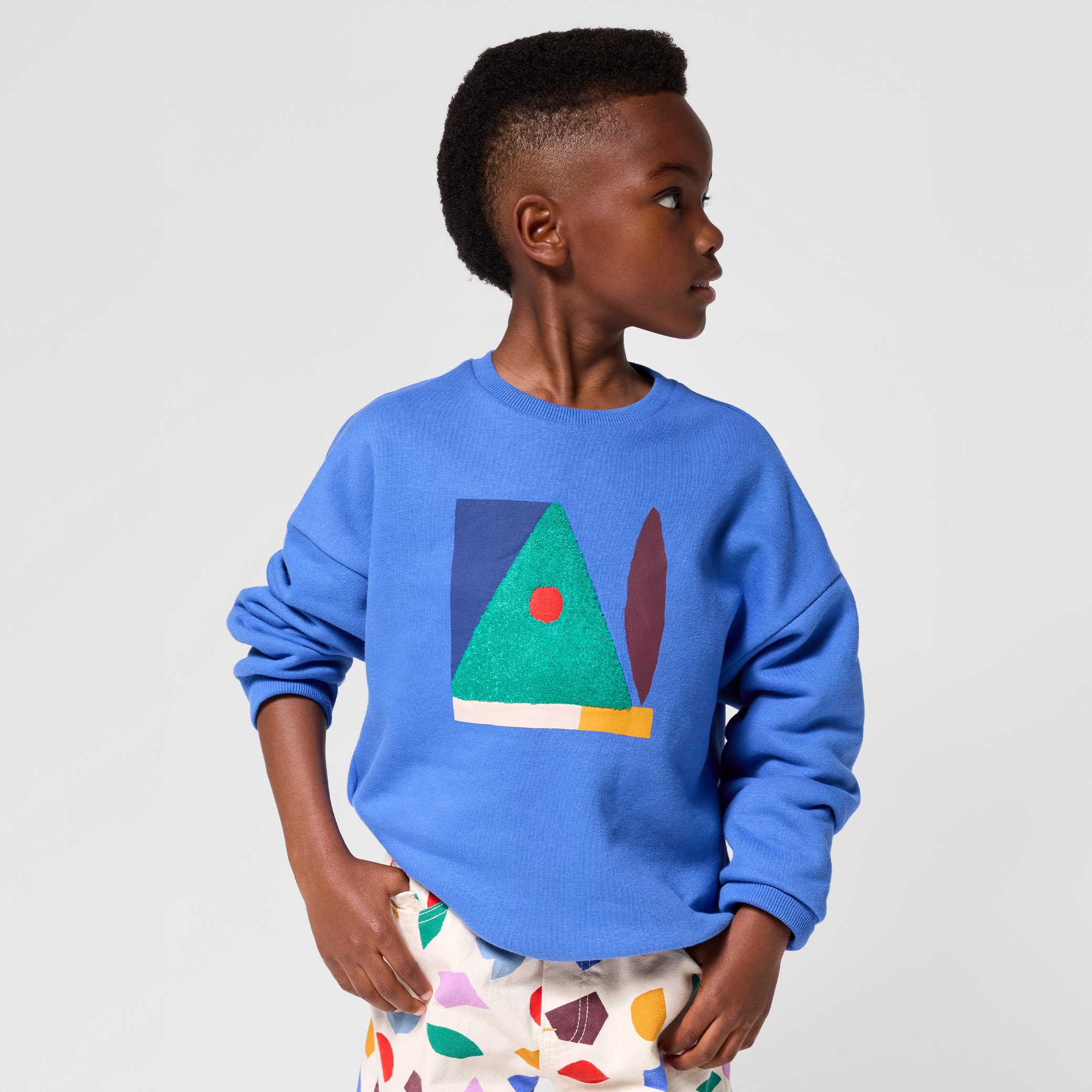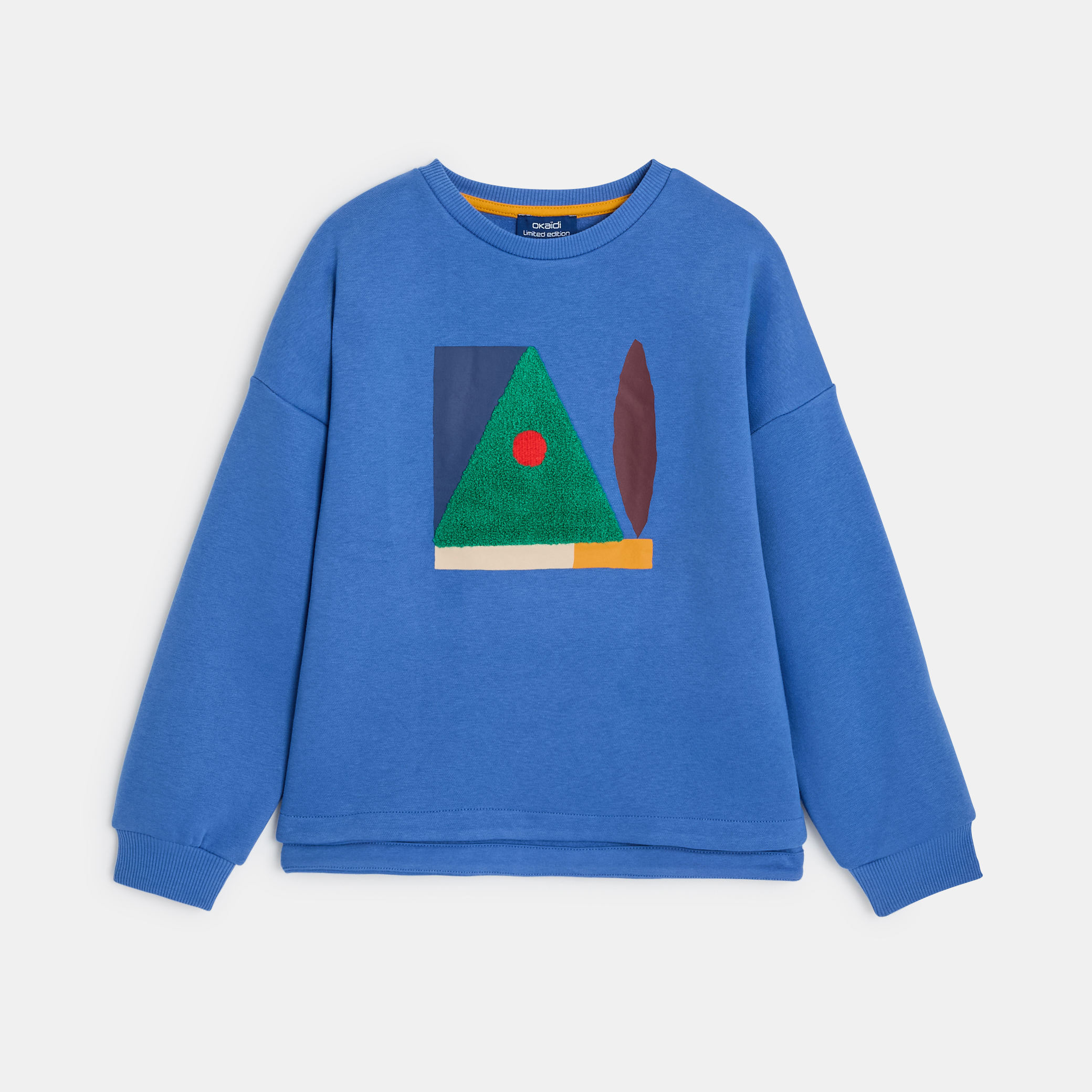 Този син суитшърт съчетава стил и комфорт със свободната си кройка. Изработена от мек полар, тя има цветен геометричен десен отпред. Идеален за всекидневно носене, дългите му ръкави и оребрените маншети са топли и практични. Лесен за обличане, идеален за стилно опознаване на света.За началото на учебната 2025 г. Okaïdi имаше удоволствието да си сътрудничи с международния мултидисциплинарен художник Матиас Ларайн.