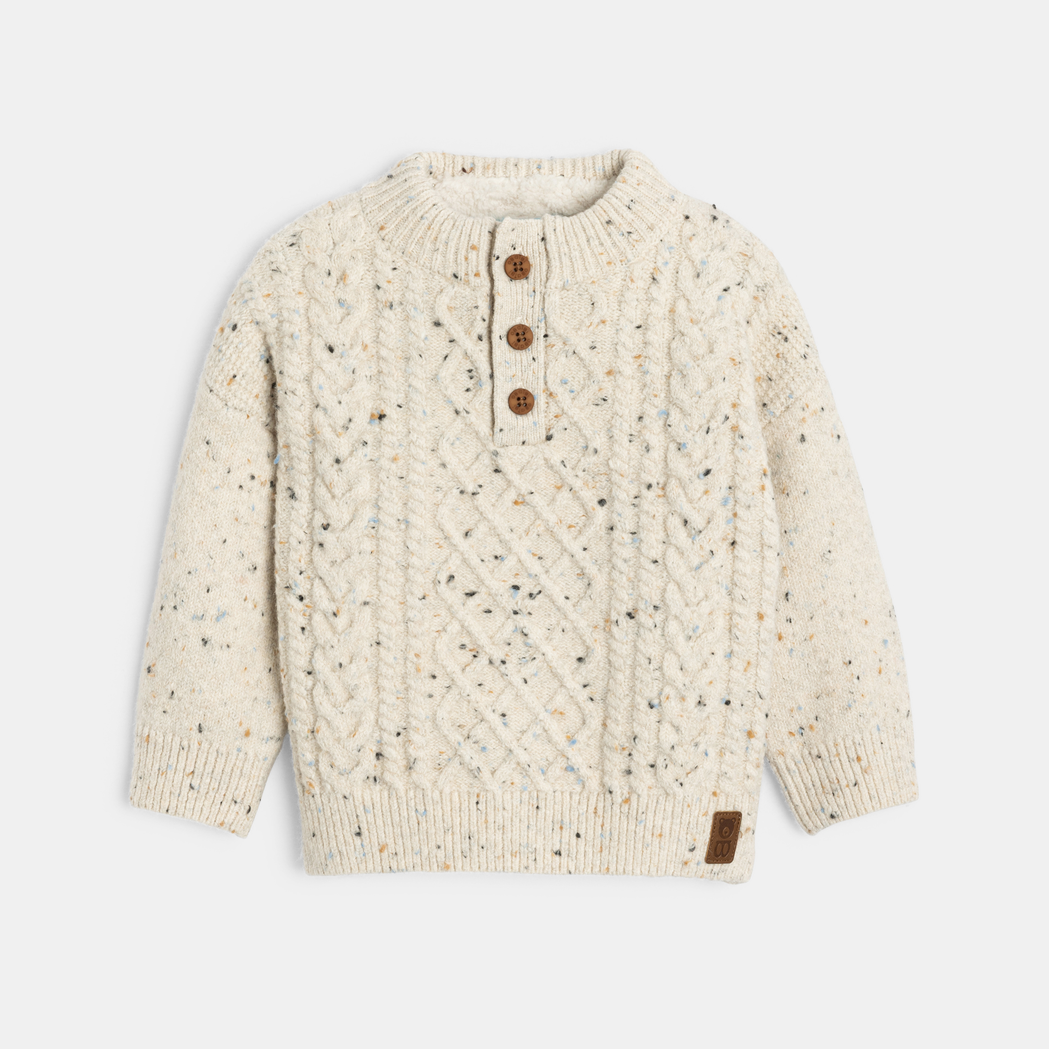 Като мек пашкул от комфорт, този плетен пуловер добавя автентичен щрих към облеклото ви с вдъхновената от планината плетка. Той е невероятно топъл и гарантира комфортни дни за момчетата. Закопчава се с копчета отпред. Оребрен кант.
