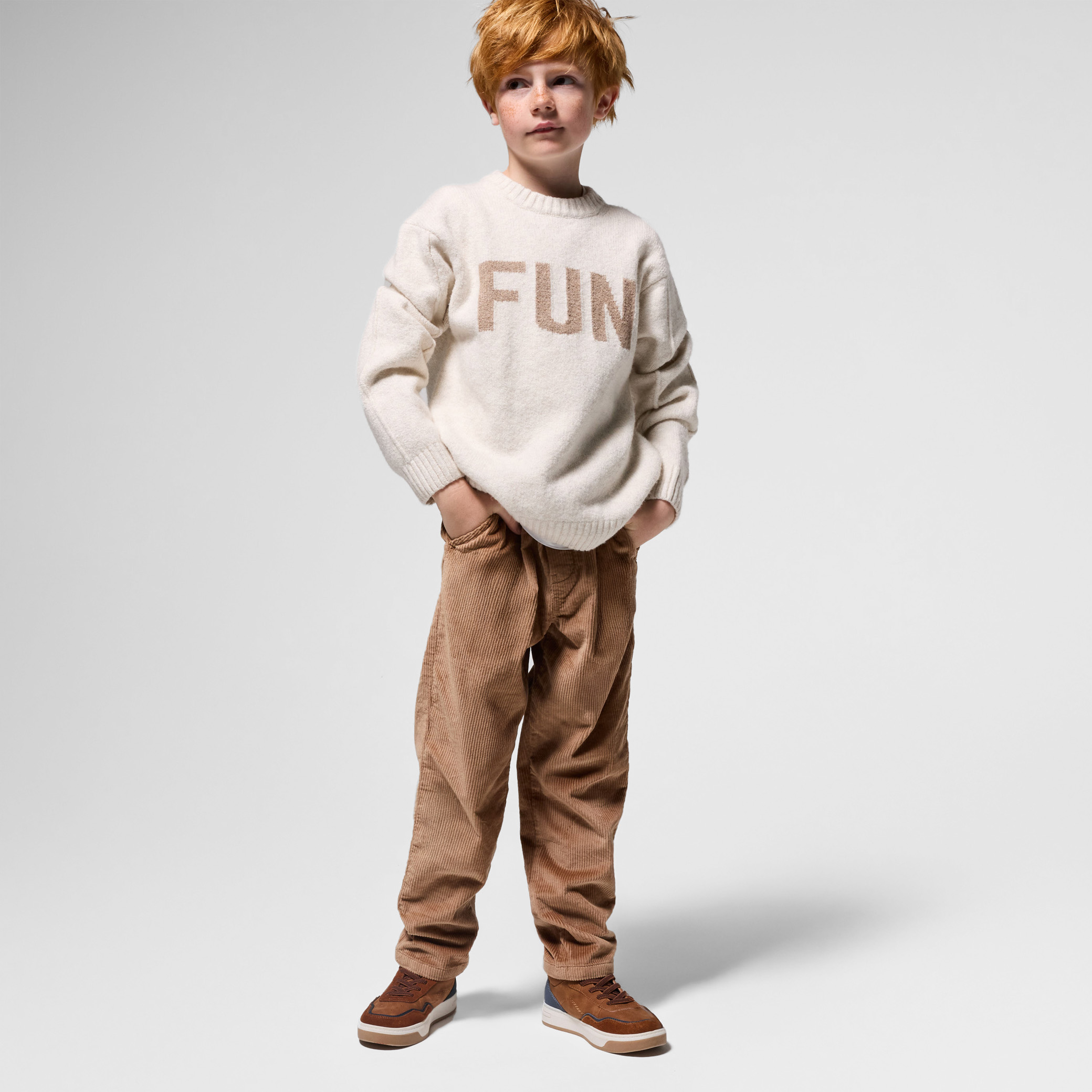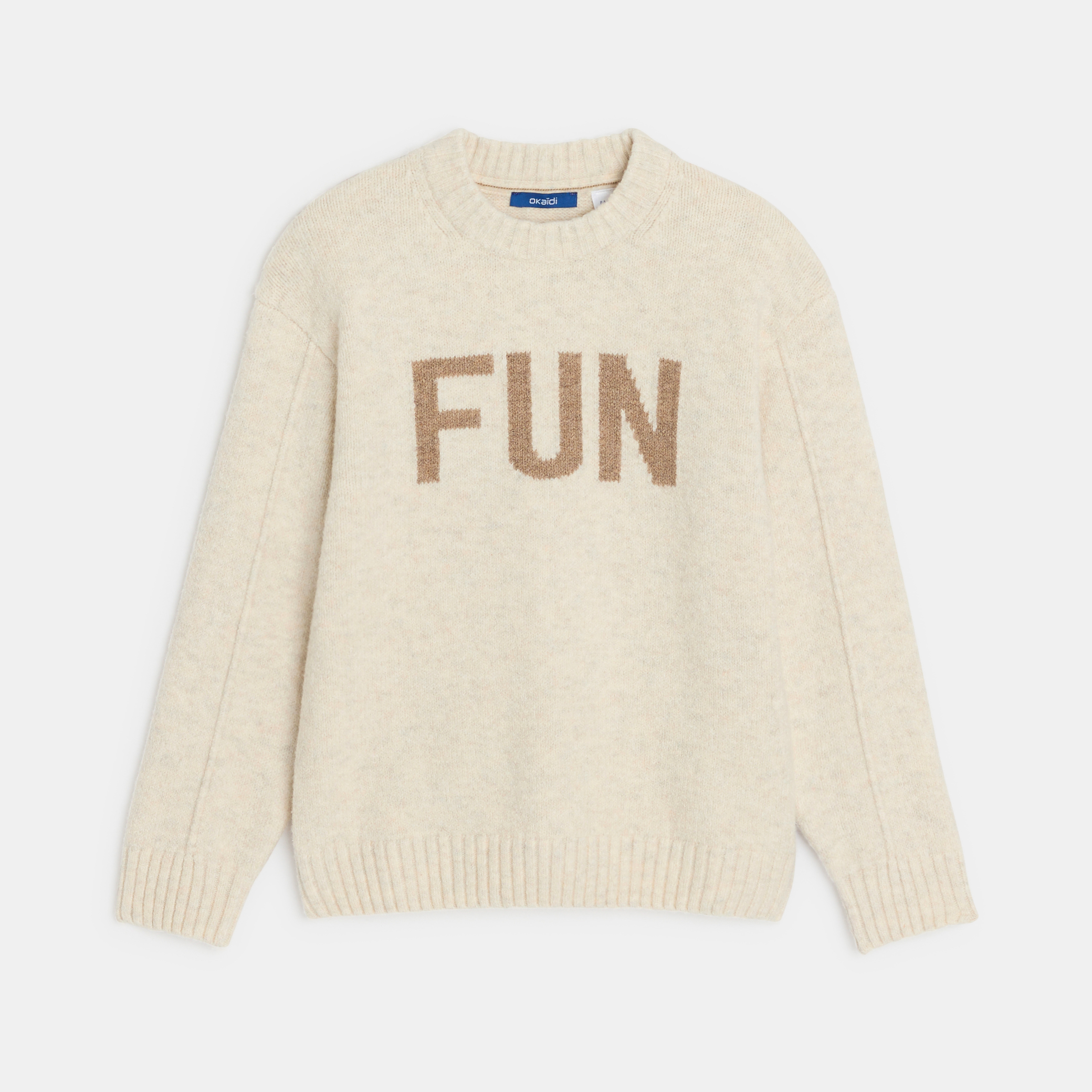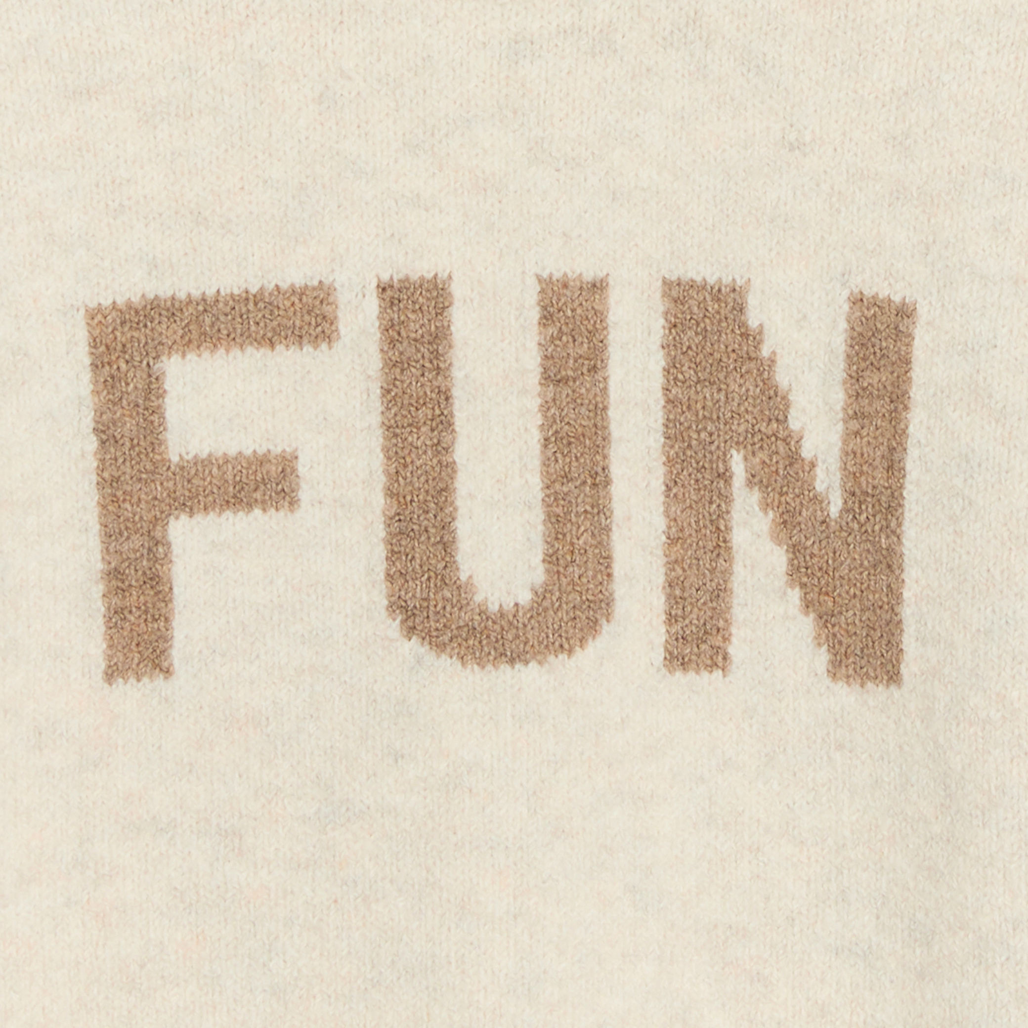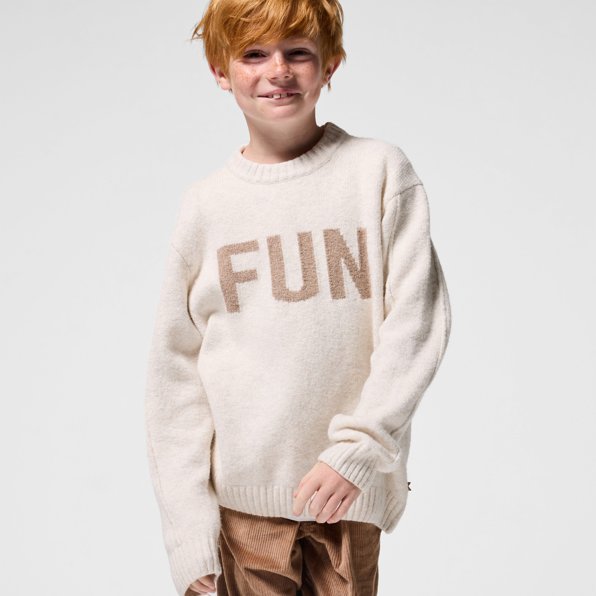 Отдайте място на мекотата с този мек плетен бежов пуловер, гордо показващ думата "FUN" с контрастни букви. Стандартната му кройка предлага комфорт и стил за ежедневно носене. С дълги ръкави и кръгло деколте, този пуловер е идеален за топло и стилно носене в хладните дни. Оребрени маншети и подгъв за перфектно прилягане.Състав