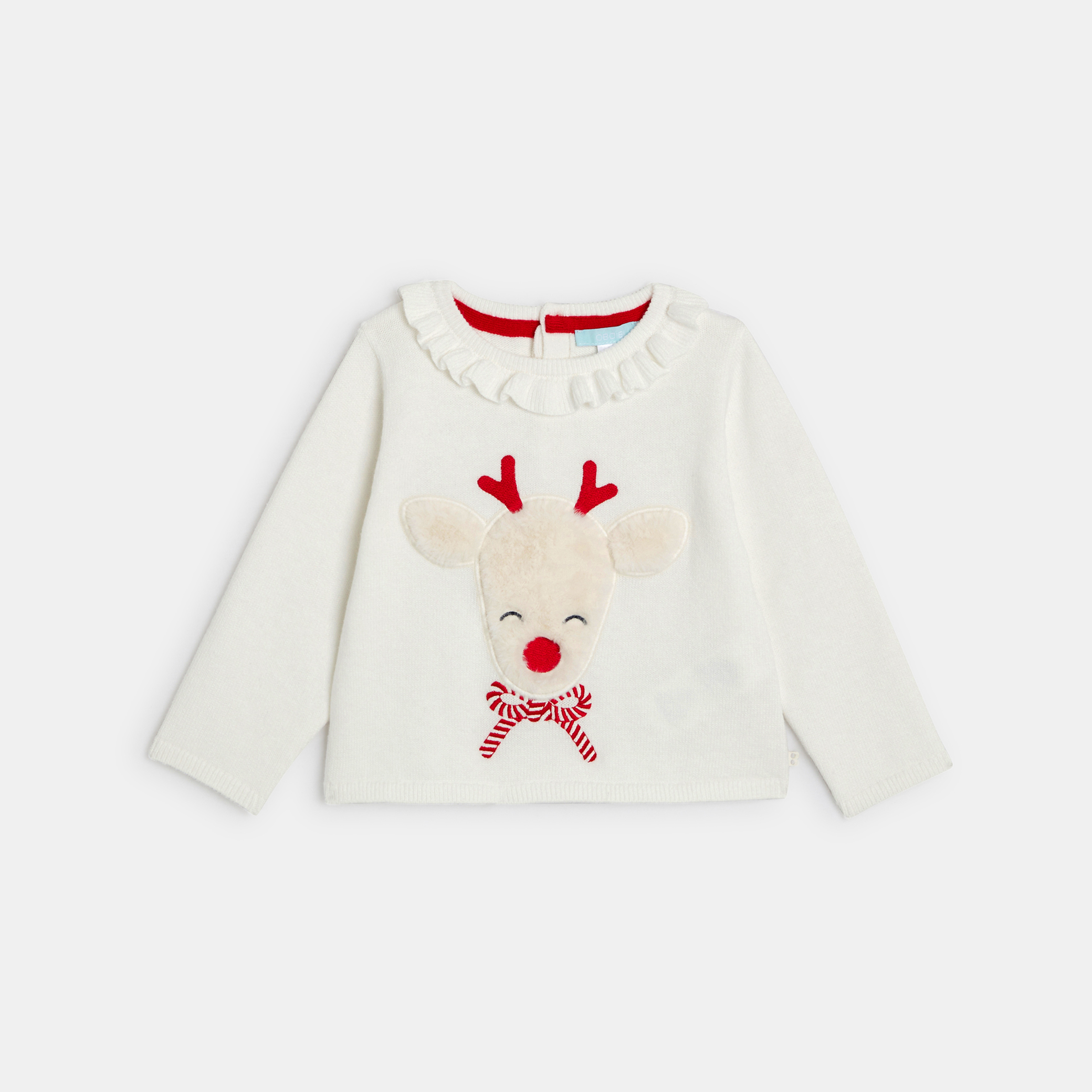 Този празничен пуловер очарова с очарователния си релефен мотив на елен. Правата му кройка и меката плетка осигуряват комфорт и топлина, а кръглото деколте, украсено с волани, добавя елегантен и празничен щрих. Идеален за партита или специални поводи, той е и практичен благодарение на закопчаването с копчета отзад, което го прави лесен за обличане.Състав