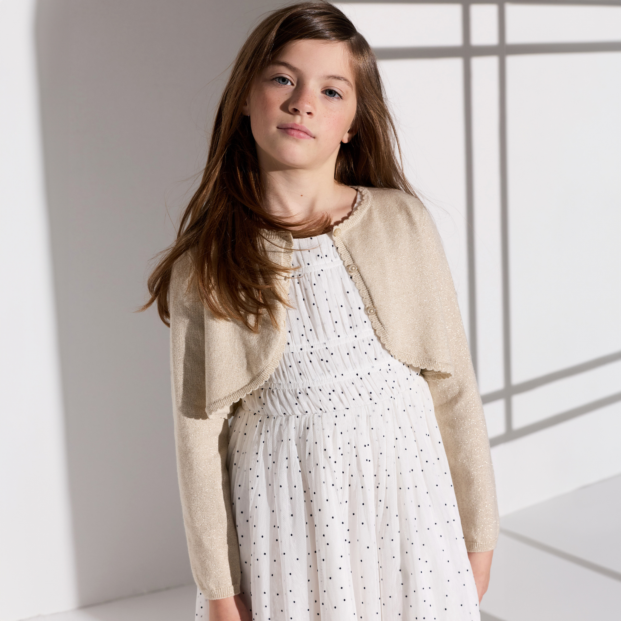 Това болеро е идеално за добавяне на блясък към всеки тоалет! Изработено е от мека трикотажна материя, а скъсената кройка е изключително елегантна. Кръгла яка, изрязан кант, дълги ръкави и закопчаване с копчета. Идеален за специални поводи, той гарантира комфорт и стил.Състав