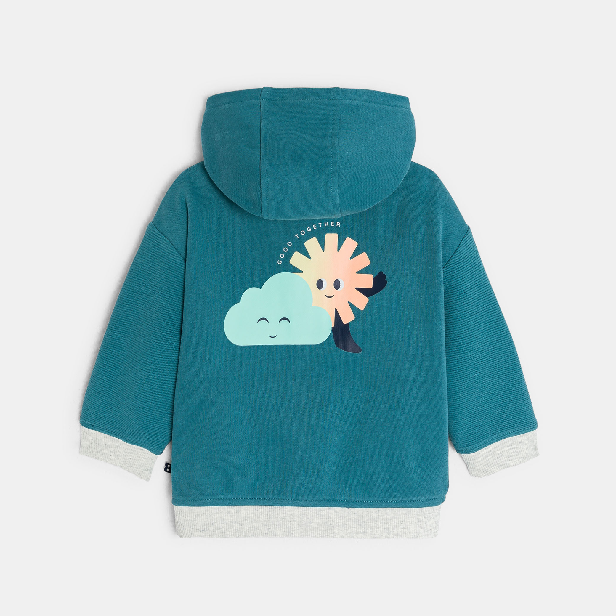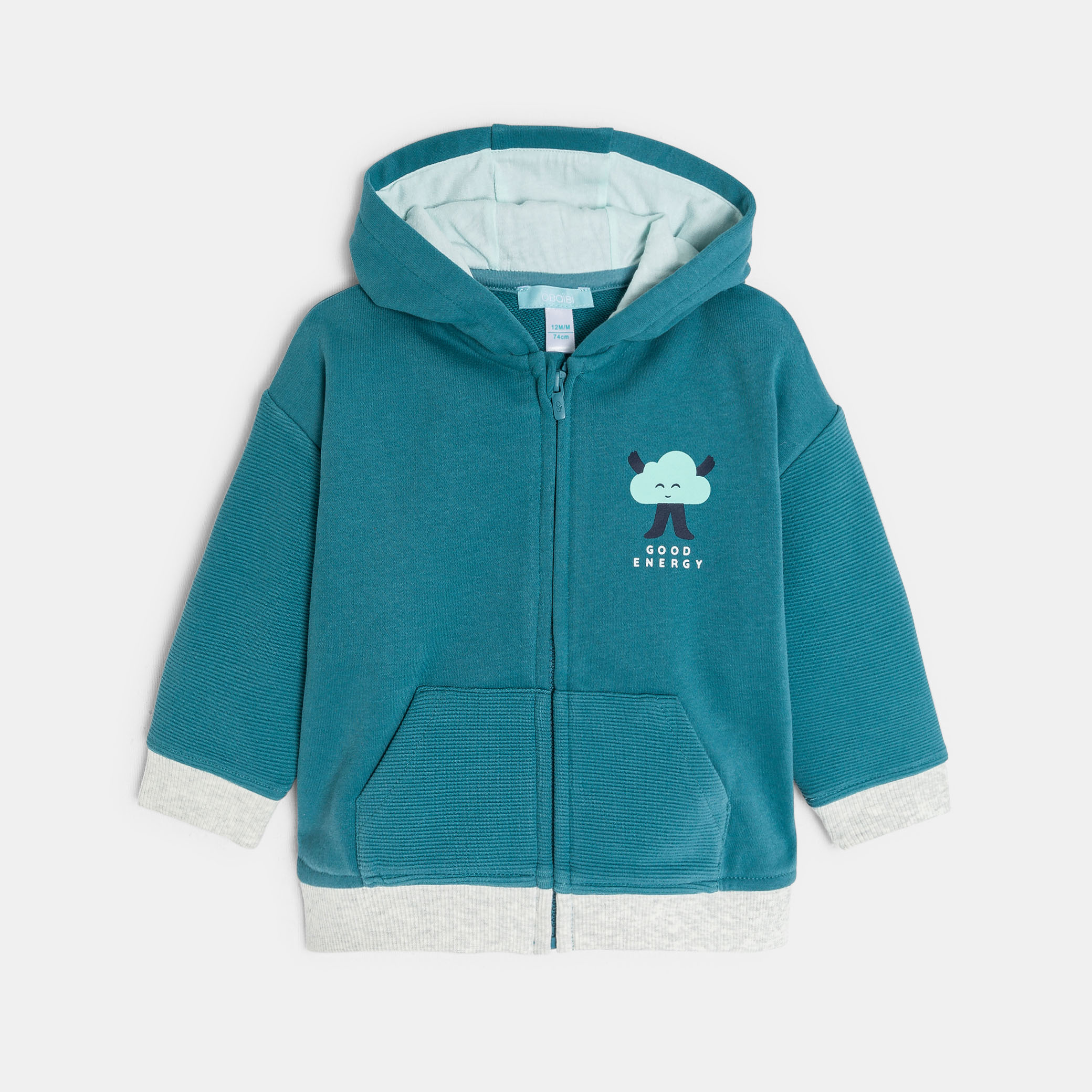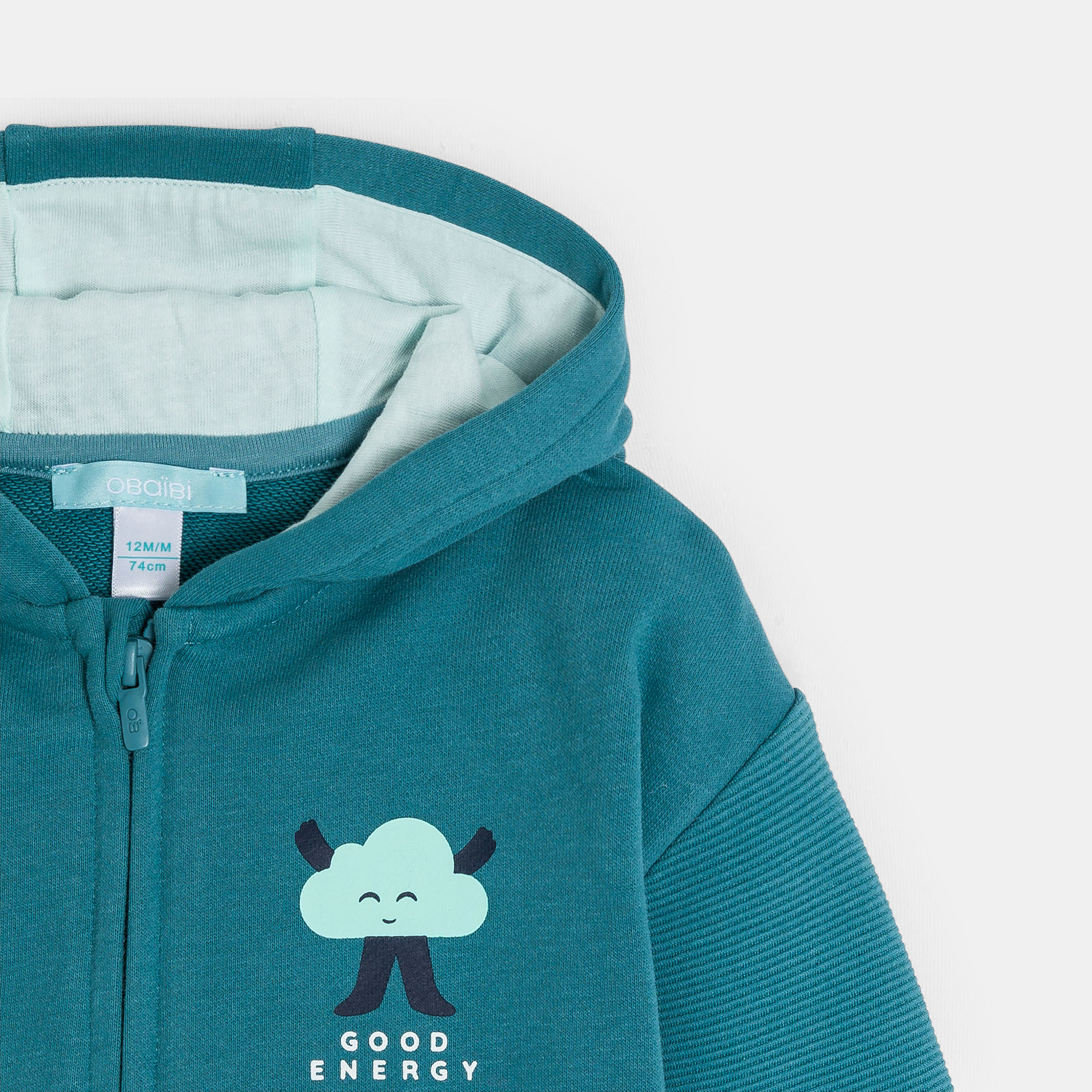 Топъл и уютен, този син суитшърт с качулка превръща всеки ден в приключение! Той се отличава със свободна кройка, мек плат и удобен цип отпред. Просторният му джоб тип „кенгуру“ и графиката „Good Energy“ добавят модерен щрих. Идеален за ежедневно носене, обгръщащата го качулка осигурява комфорт и топлина. Контрастният интериор и оребрените маншети допълват визията със стил.Състав