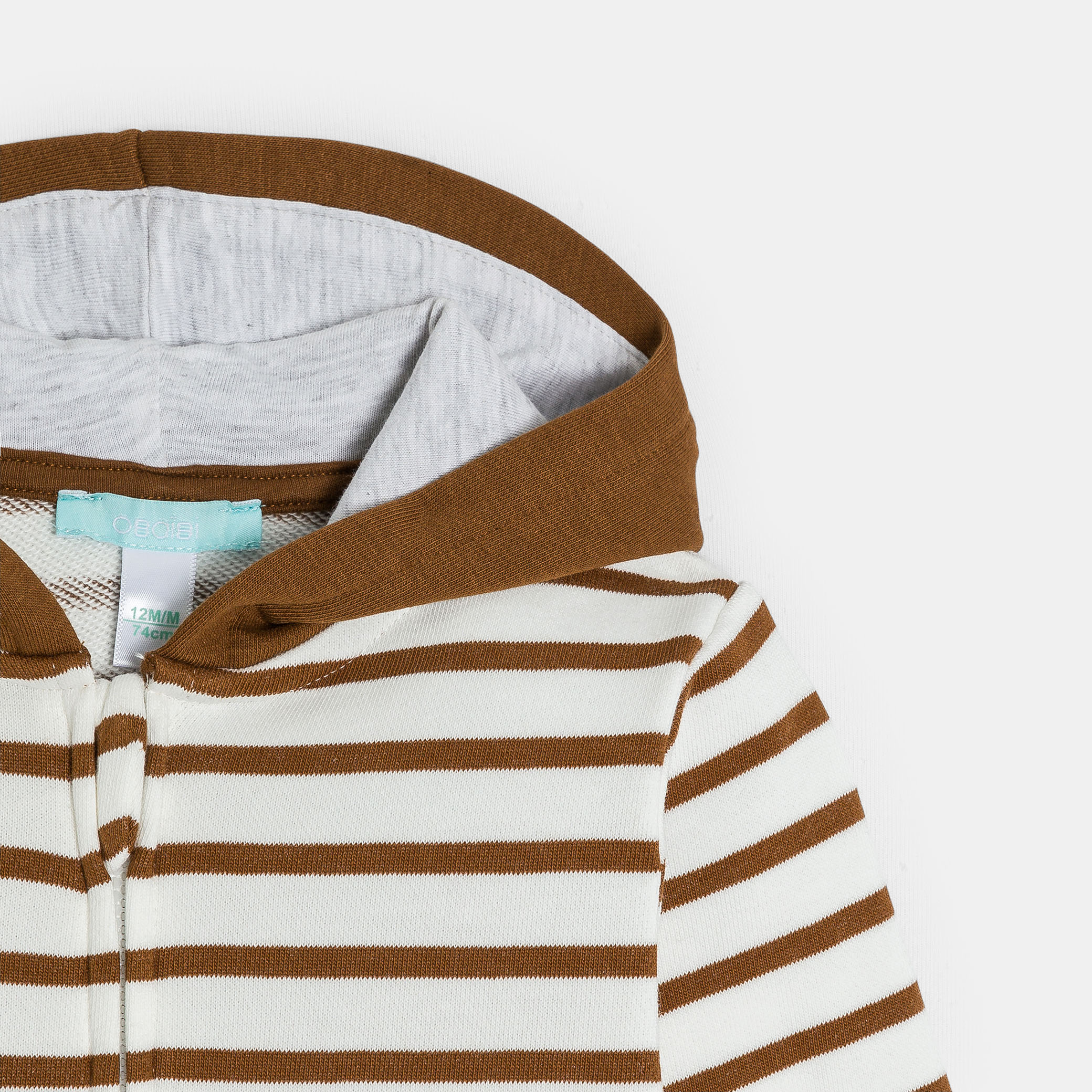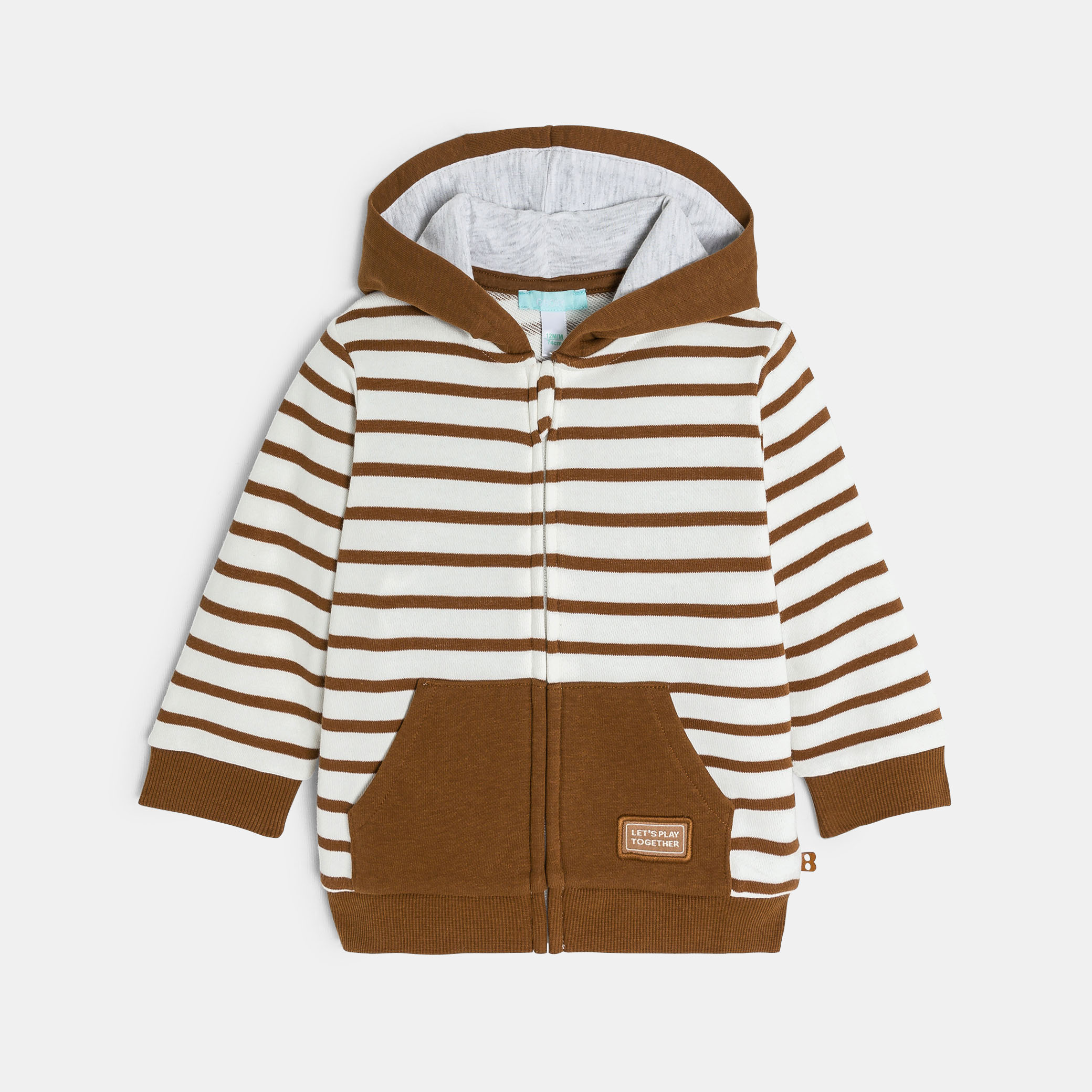 Невъзможно е да устоите на този кафяв раиран суитшърт! Изработен от мек плат, той има практична качулка и дълги ръкави. Закопчаване с цип за лесно обличане. Практични странични джобове за съхранение на малки съкровища. Перфектен за ежедневен комфорт и стил.Състав