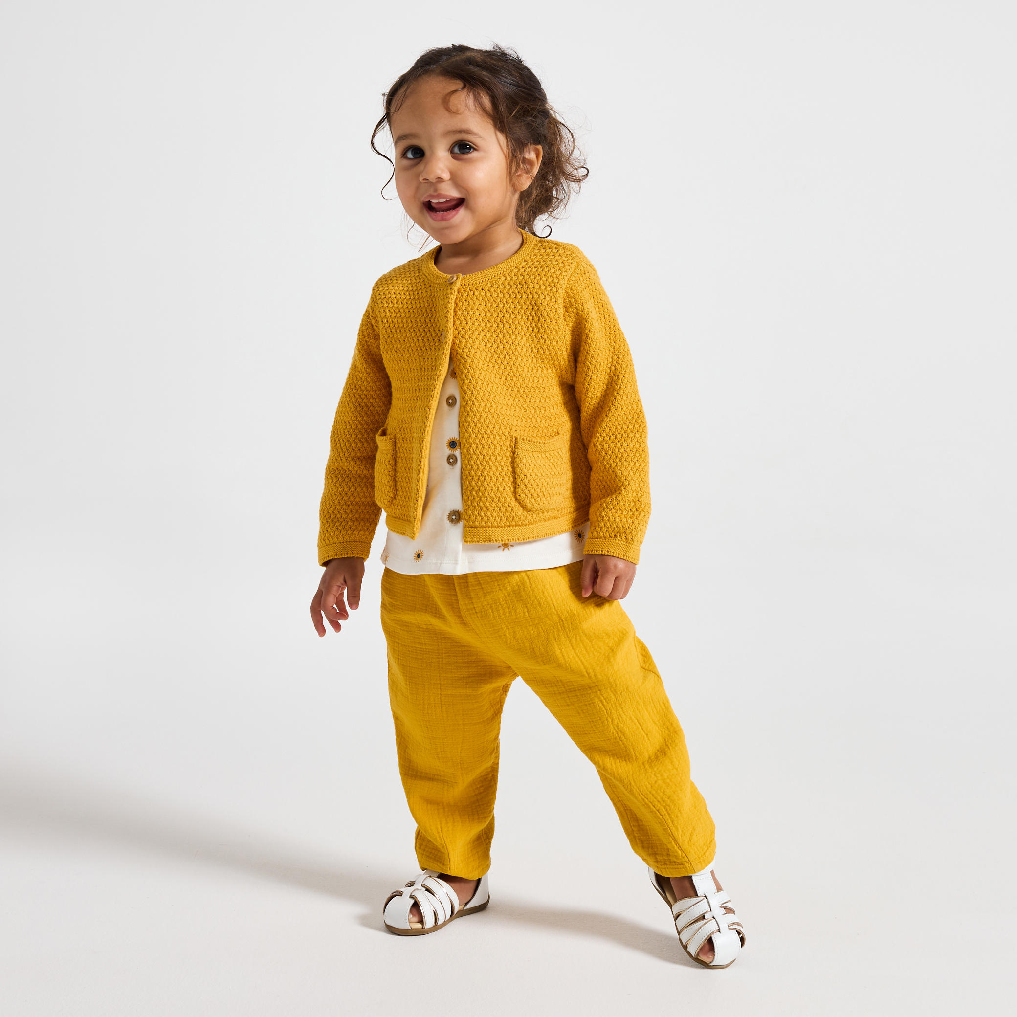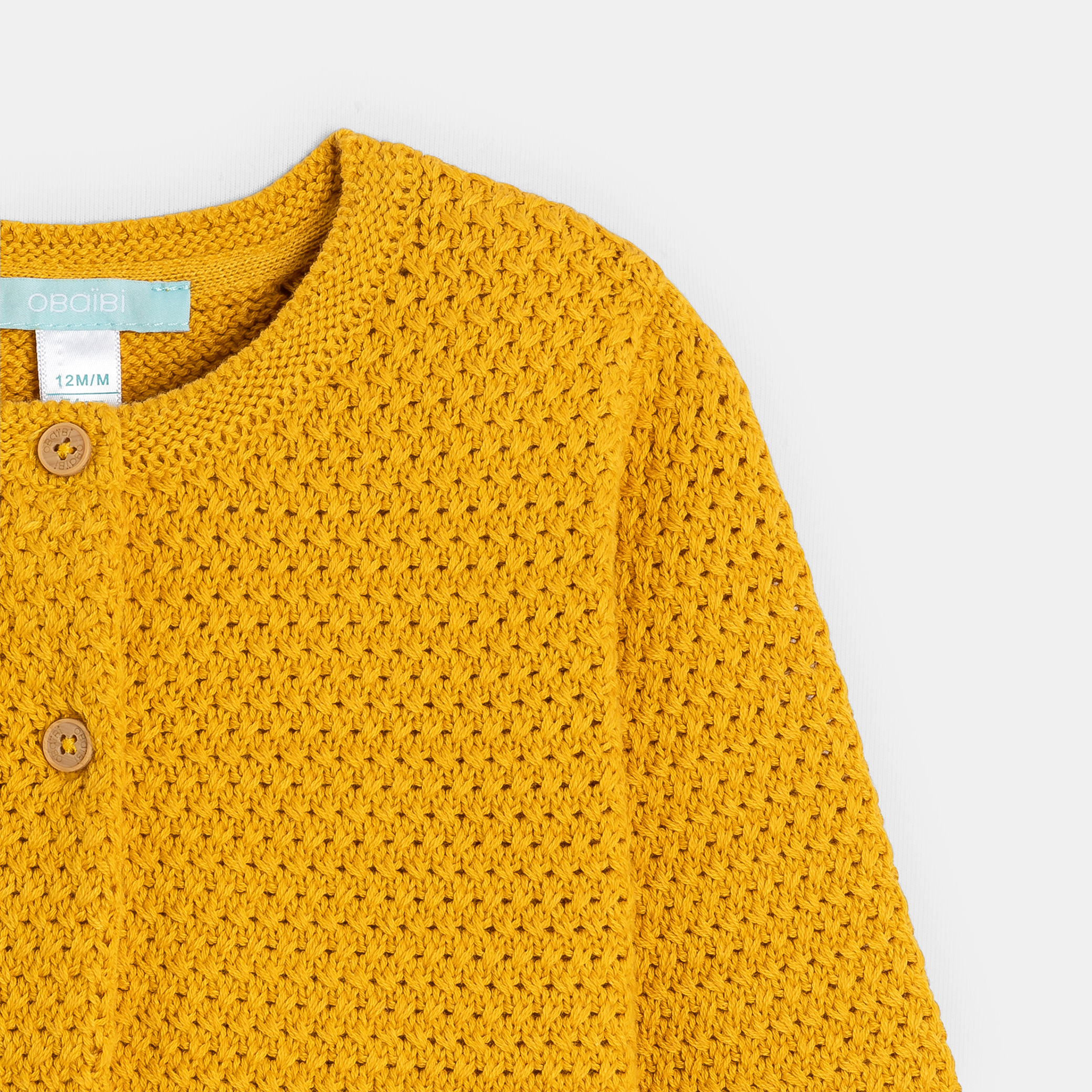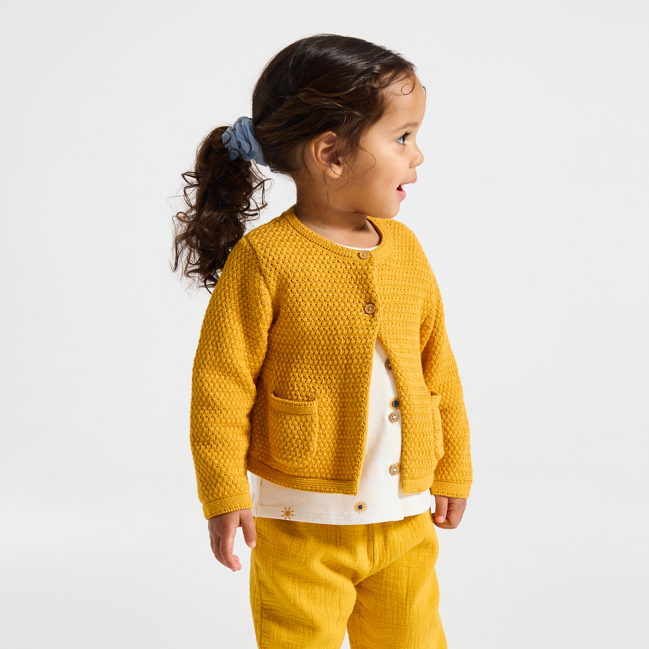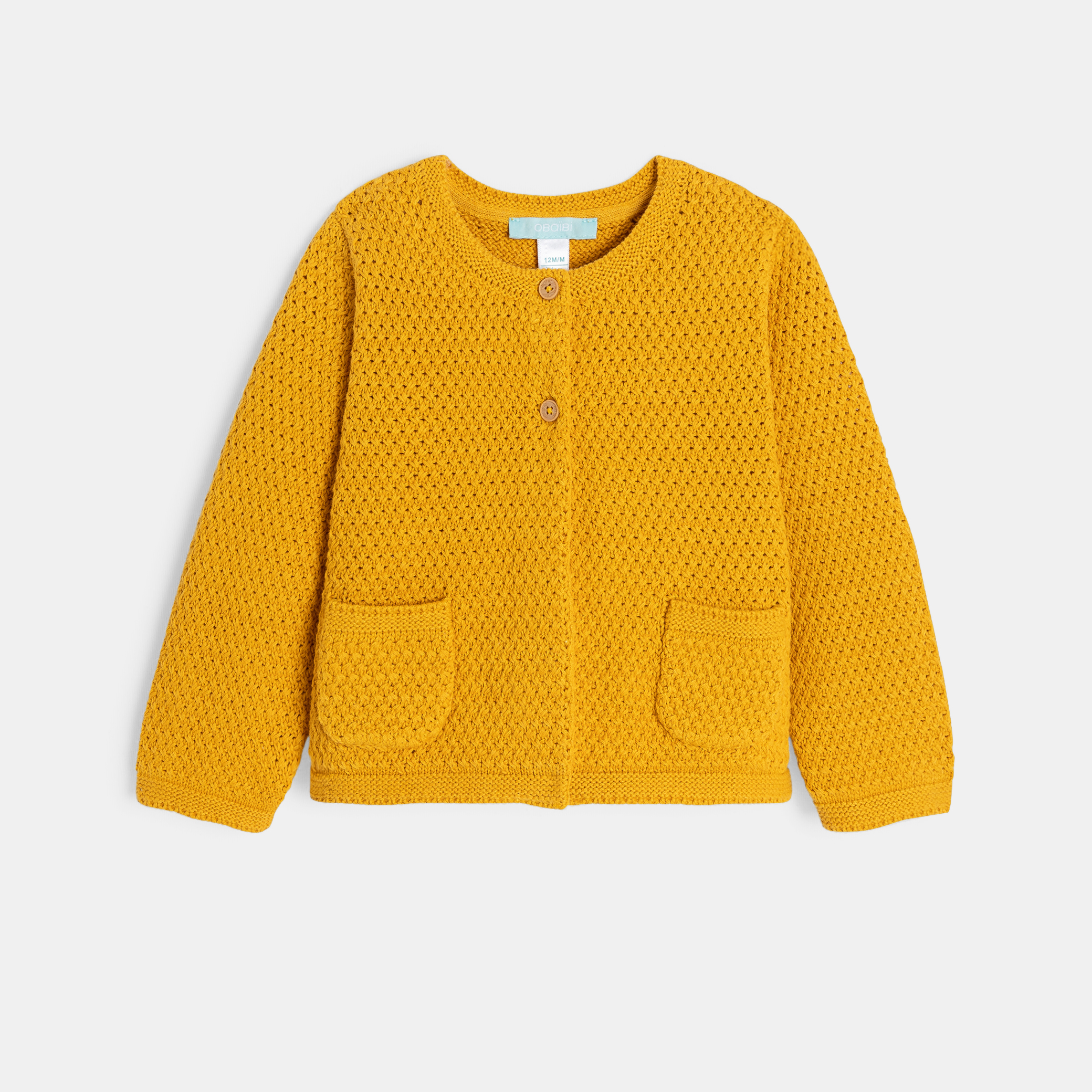 Топлина и комфорт ви очакват в този жълт плетен кардиган! Меката му, дишаща плетка и закопчаването с копчета отпред го правят практична и удобна дреха. Идеален за ежедневно носене, той разполага с два джоба за съхранение на малки вещи от първа необходимост. С дългите си ръкави и стандартната си кройка, той се облича лесно за всеки повод.