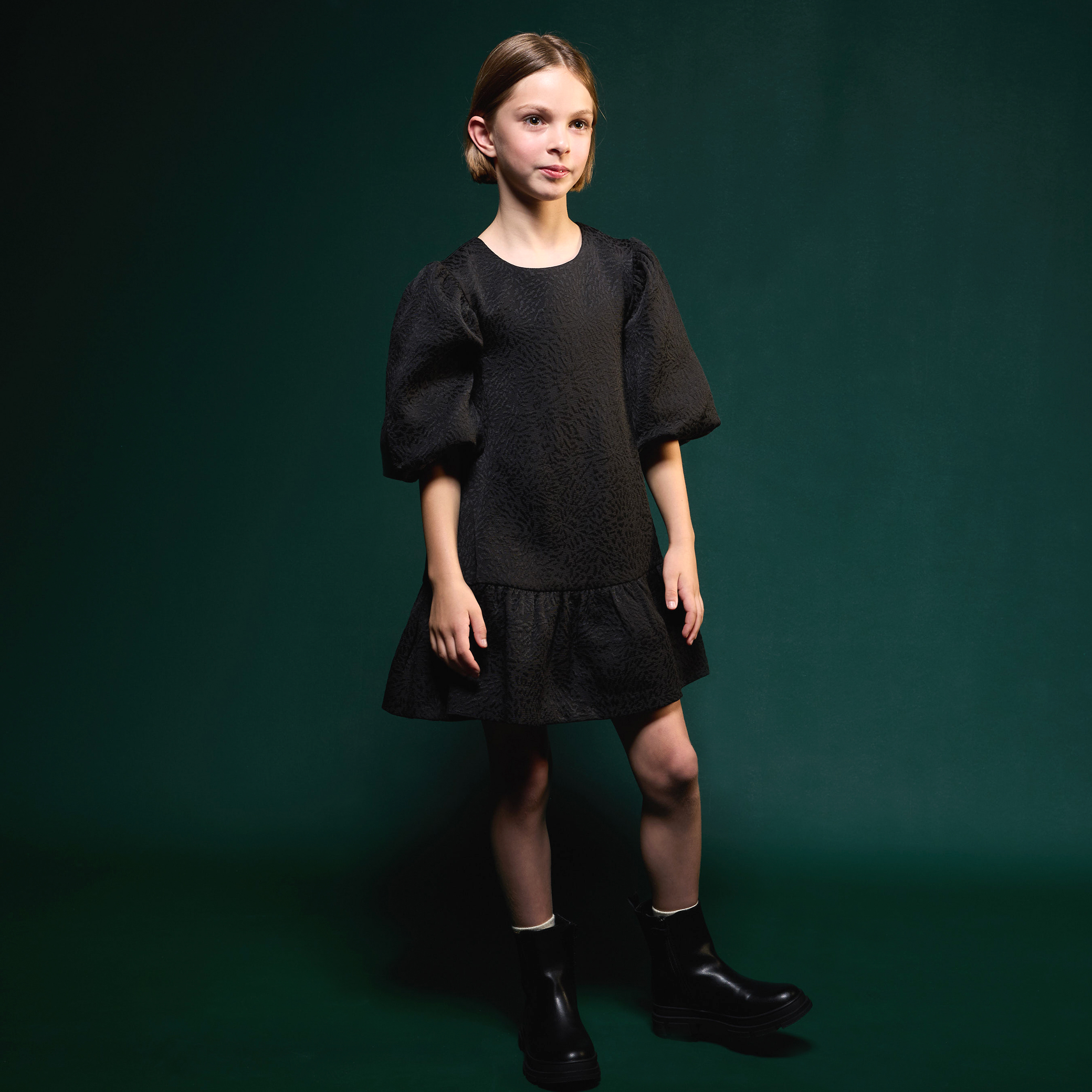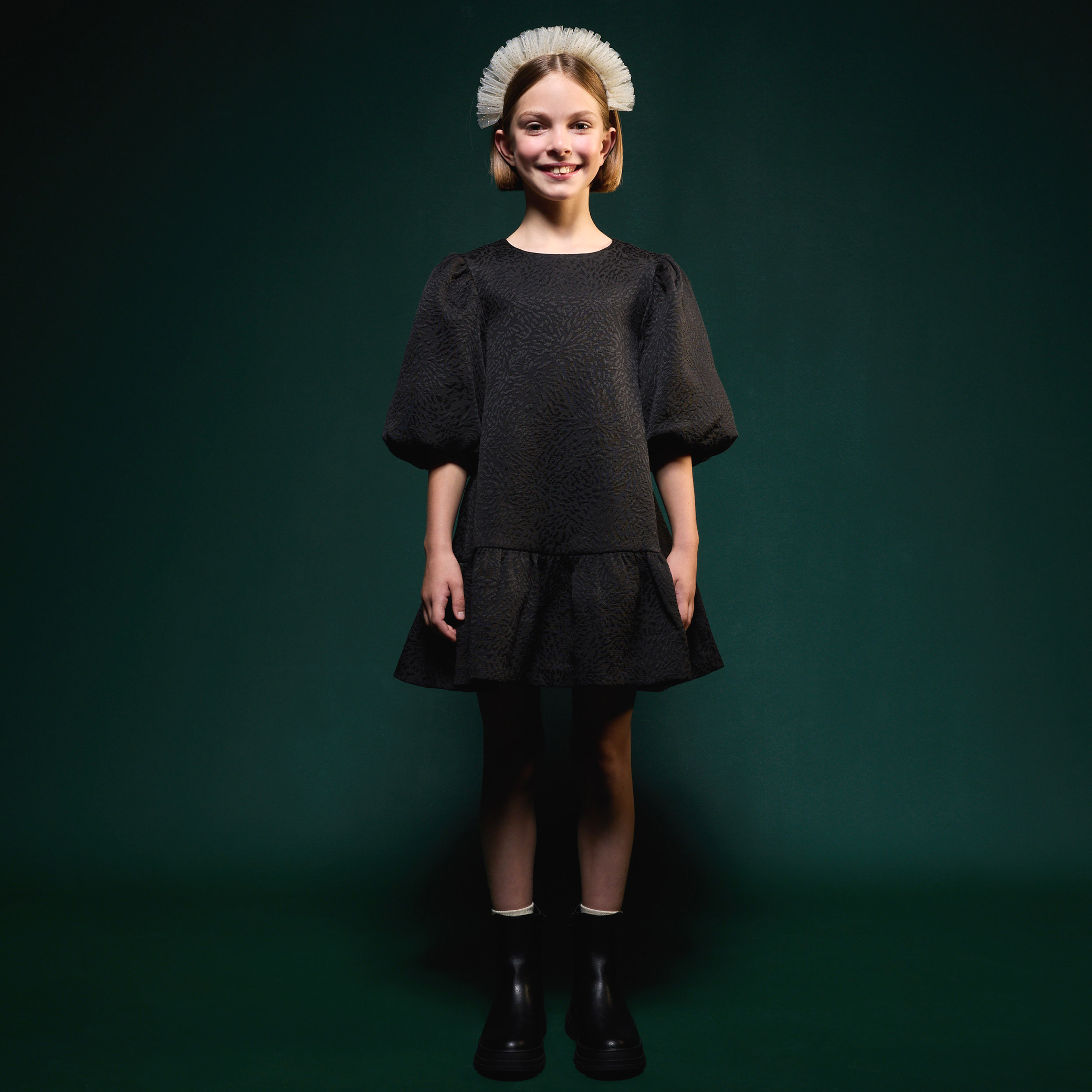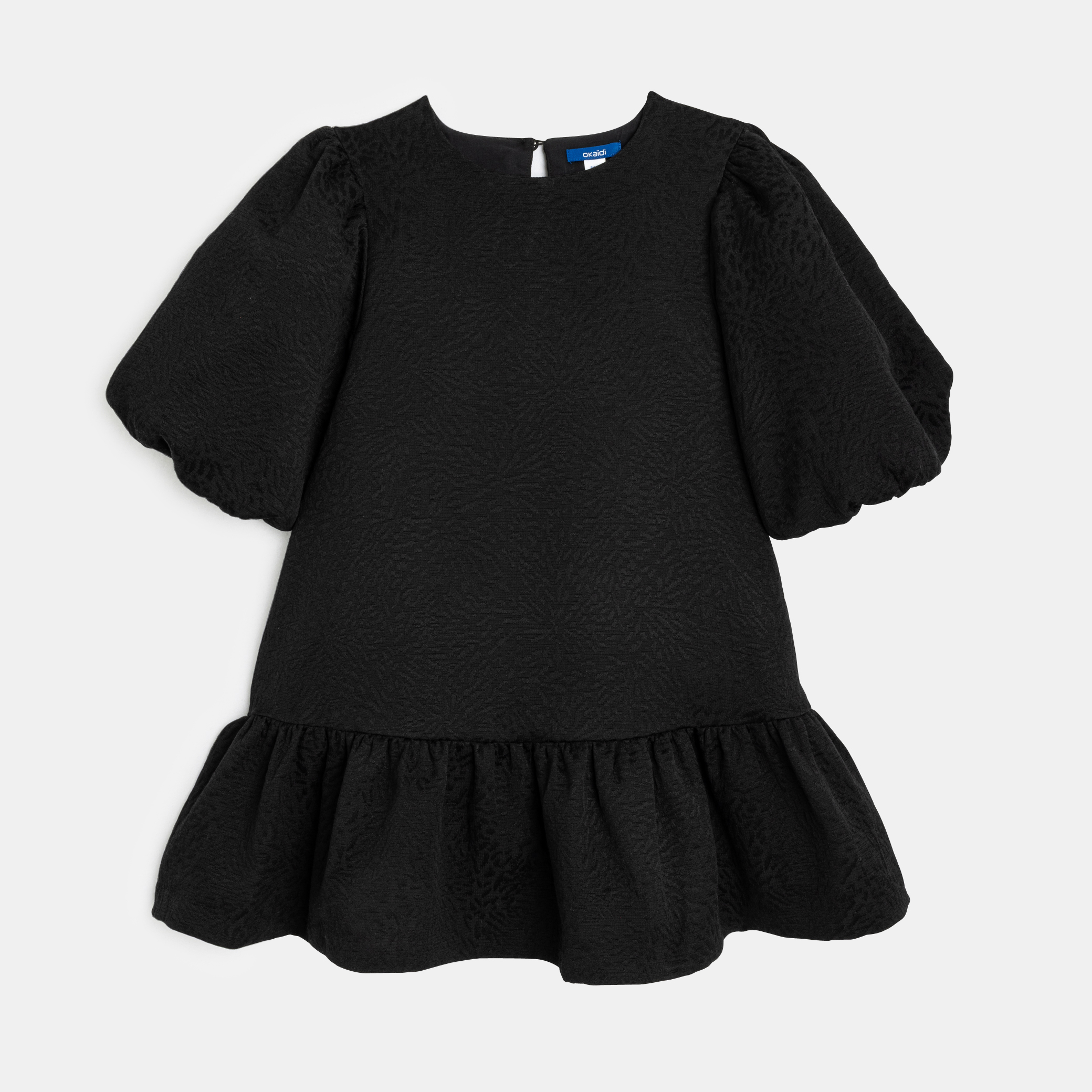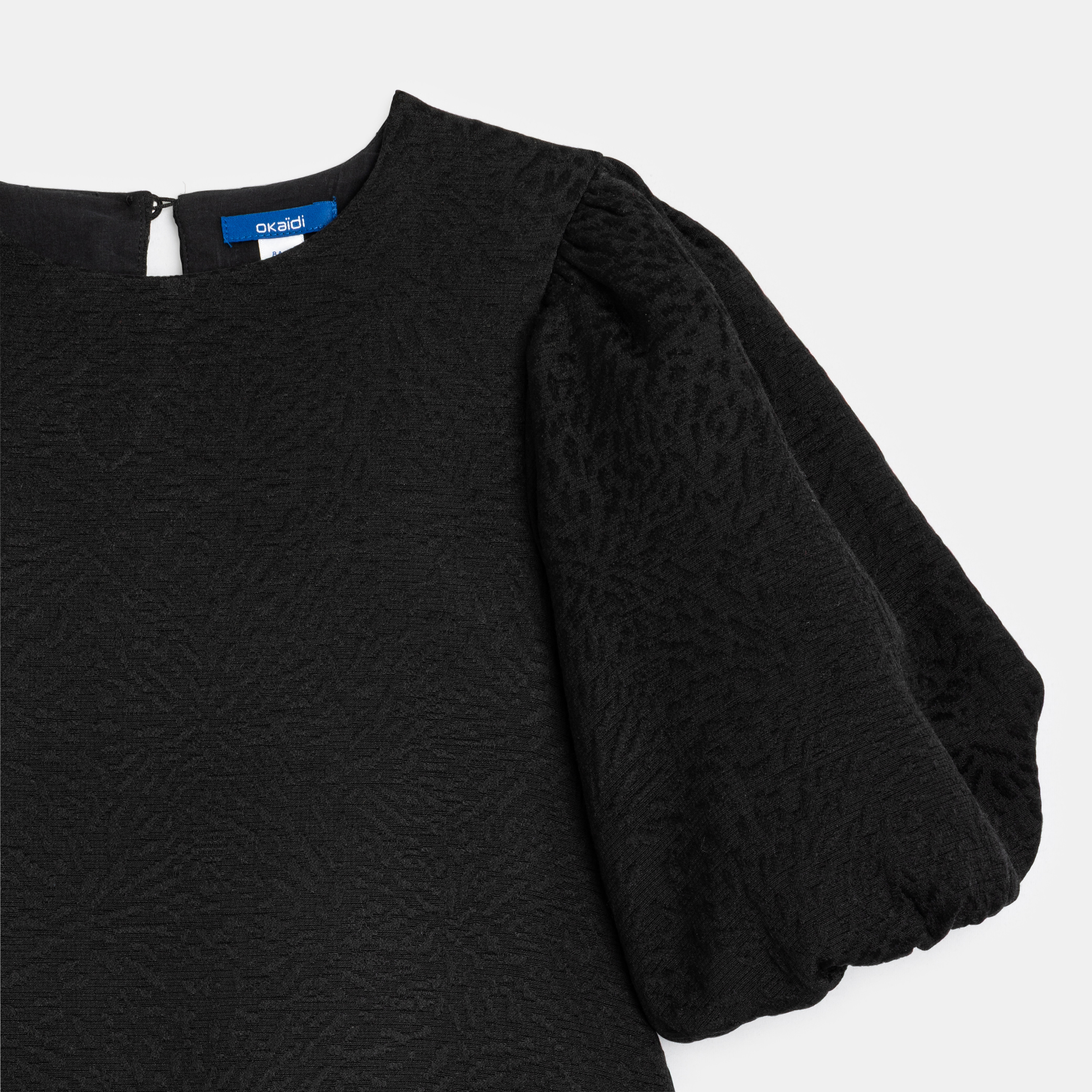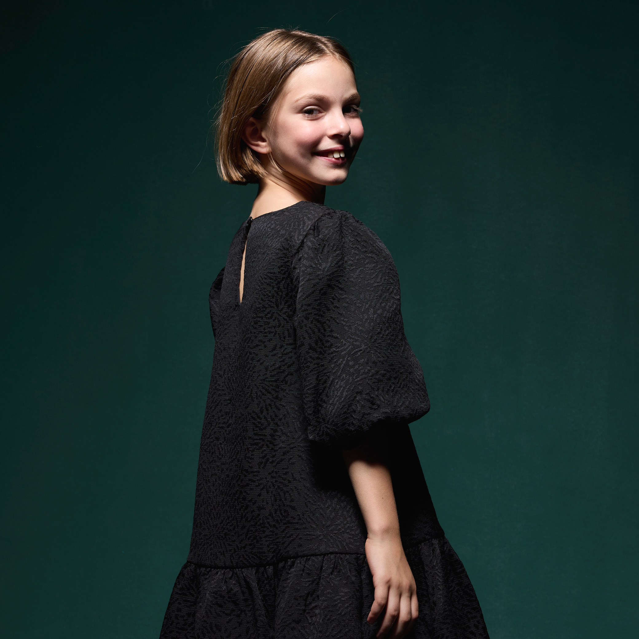 Изберете тази елегантна черна рокля със свободен и модерен стил. Изработена от текстурирана материя, тя е с плавна А-линия. Надиплените ръкави придават изтънченост. Стилна и удобна, идеална за специални поводи. Закопчаване с копчета на гърба за лесно обличане.Състав