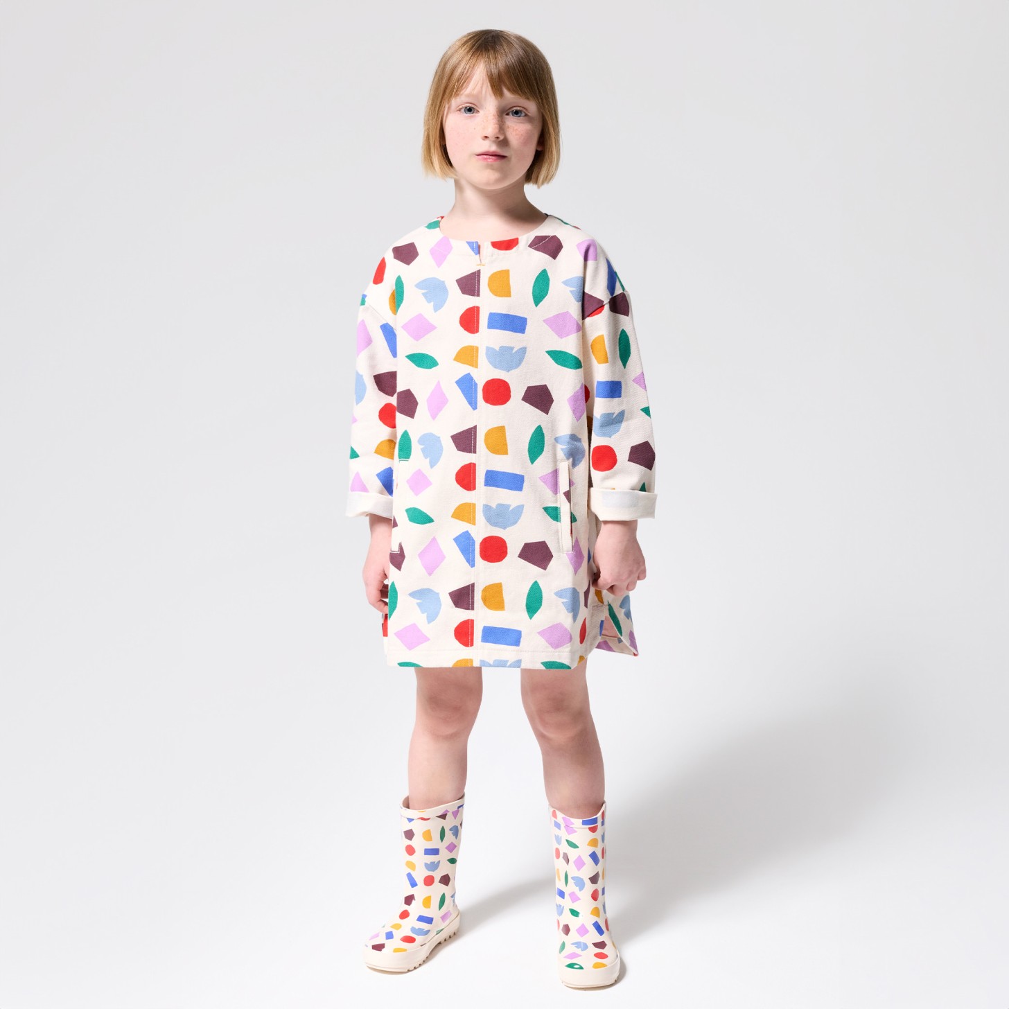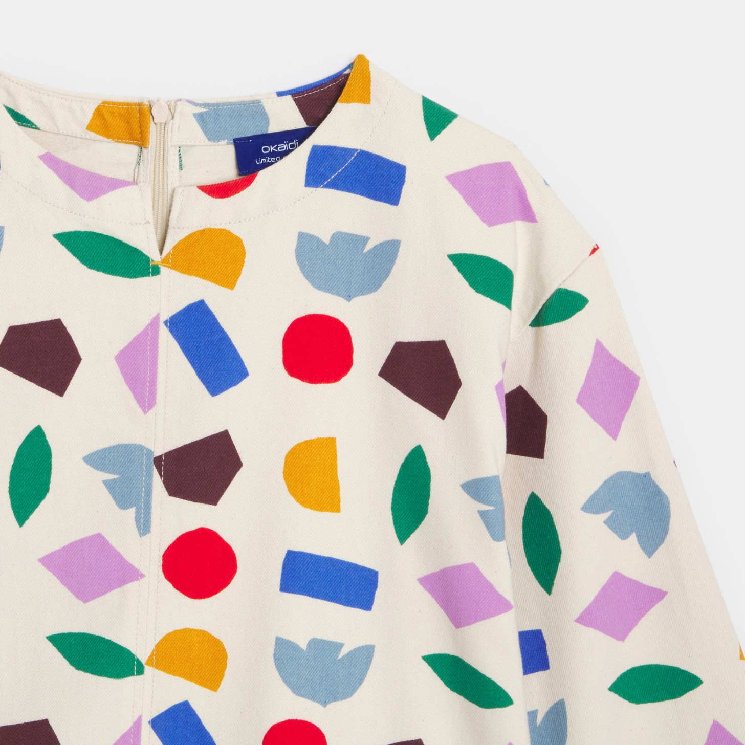 Ярки цветове и оригиналност, които момичетата обожават! Тази рокля е фантастична: тя е проектирана в сътрудничество с международния и мултидисциплинарен художник Матиас Ларейн. Неговата радостна, графична и пъстра вселена е вдъхновена от птиците и природата. Открийте това лимитирано издание, за да изразите стила си в пълна свобода! Права и свободна кройка. Кръгло деколте с малка цепка отпред и цип отзад за лесно обличане. Дълги ръкави. Леко цепки отстрани.