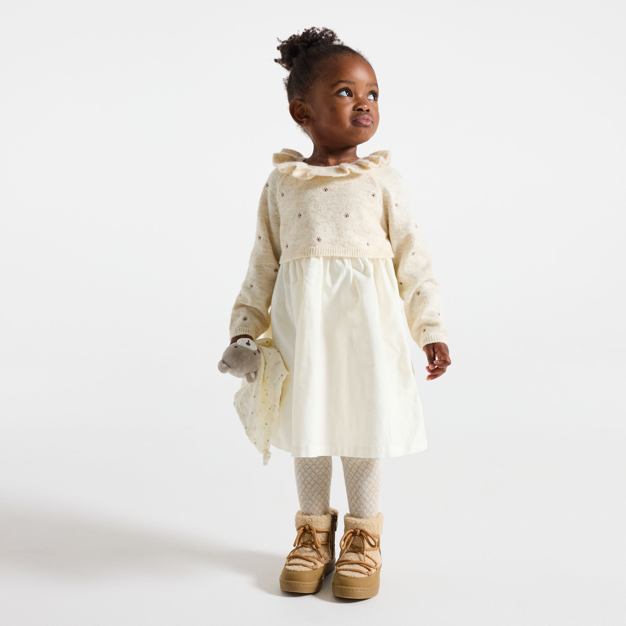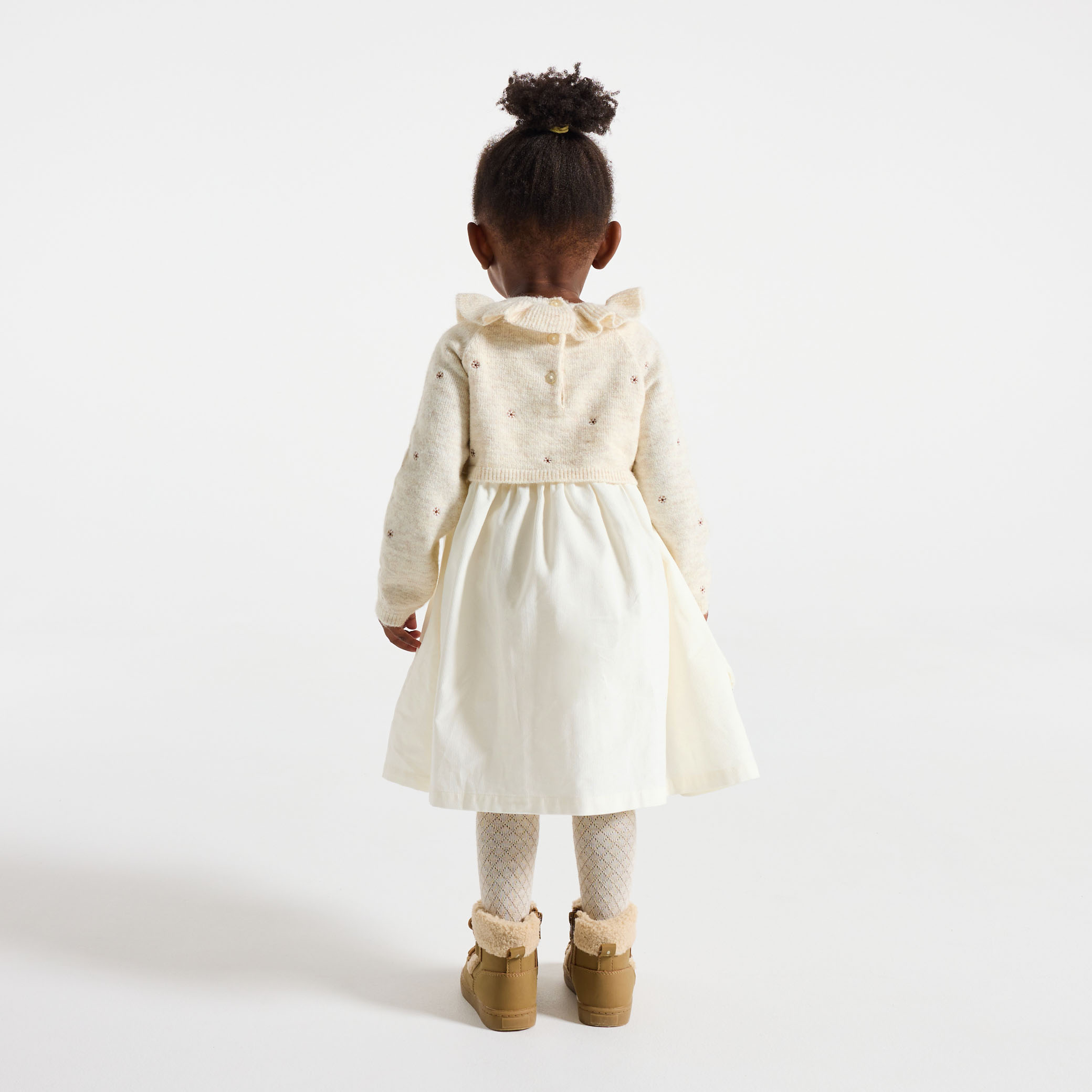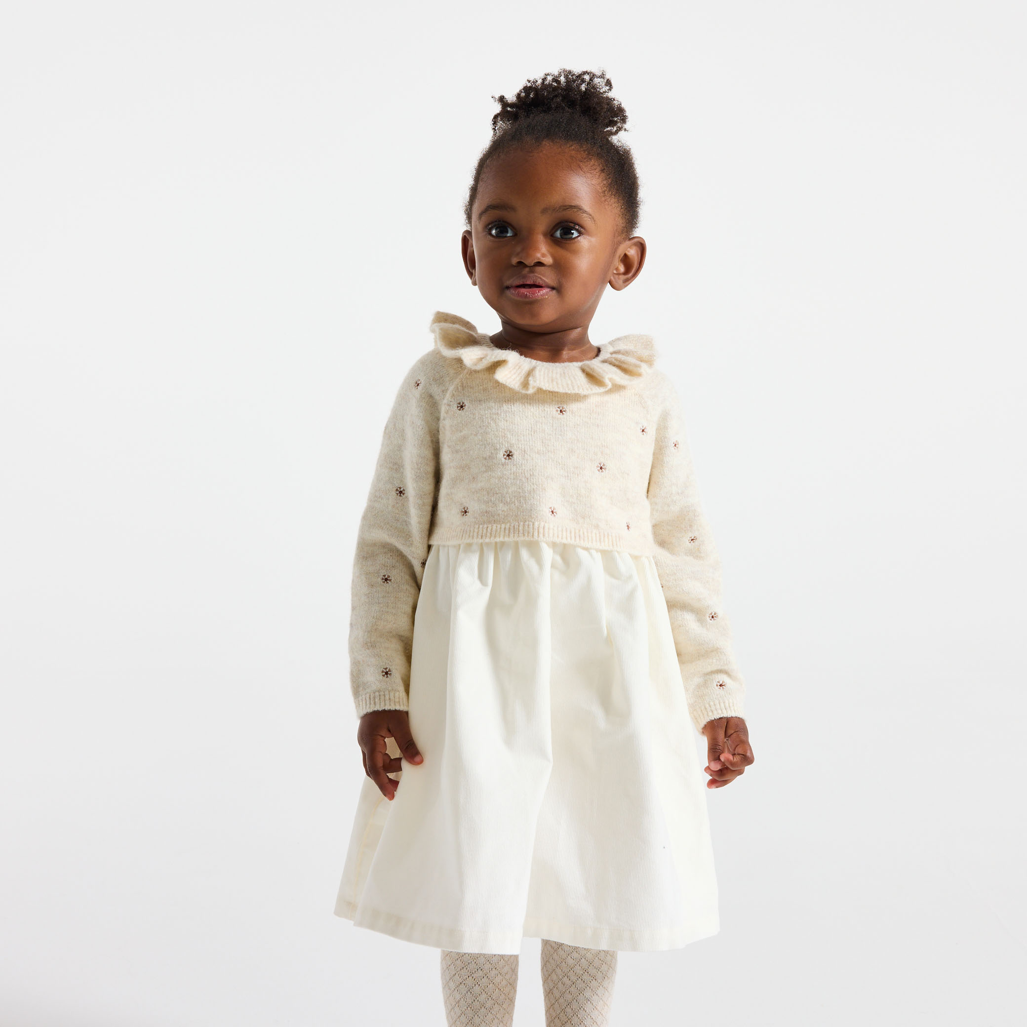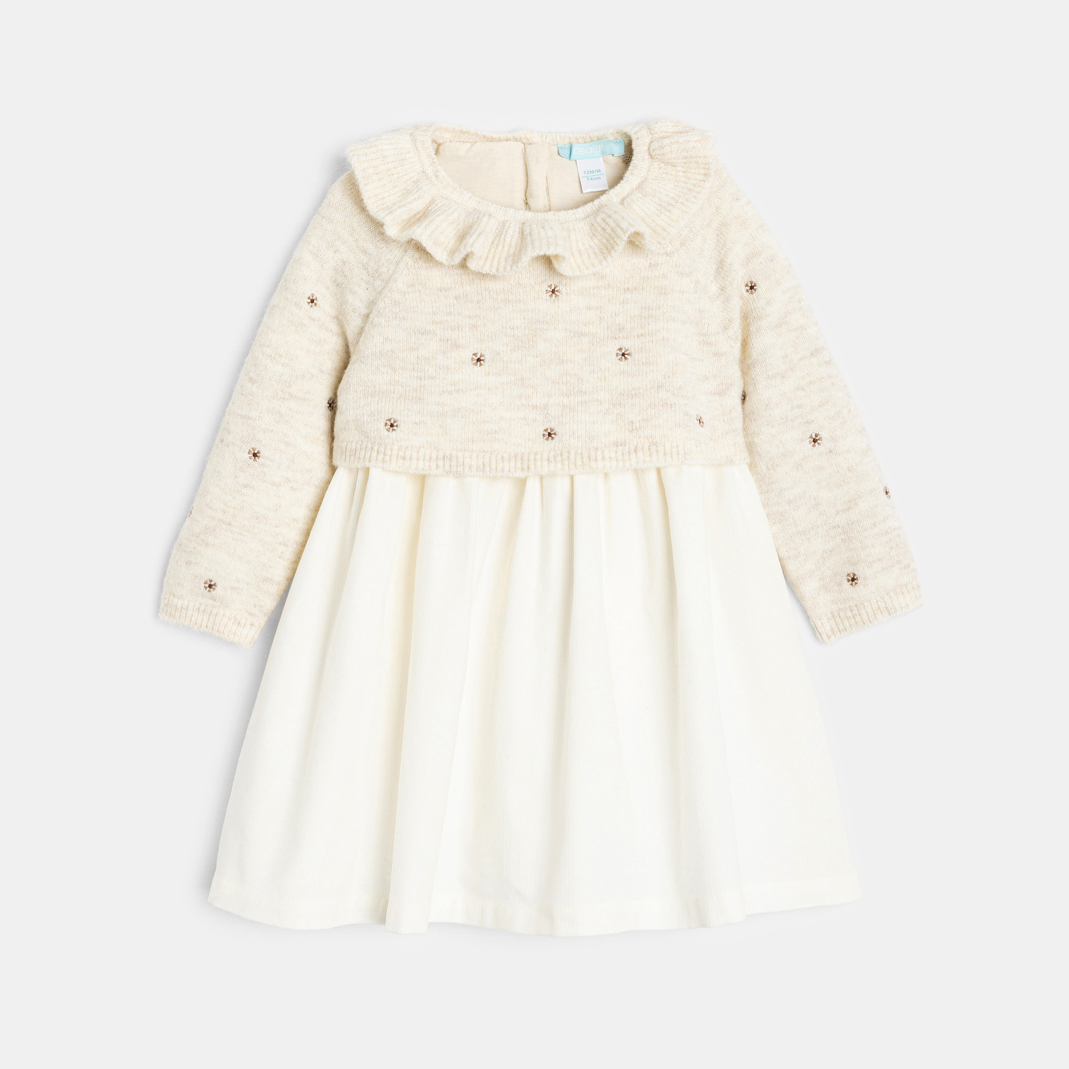 Великолепна рокля в стил 2 в 1. Бродирана плетена горна част с накъдрена яка и гладка кадифена долна част. Кръгло деколте с волани и дълги ръкави за нотка чар. Идеална за ежедневна употреба или за специални поводи. Закопчаване с копче на гърба за лесно обличане. Елегантно и удобно.Състав