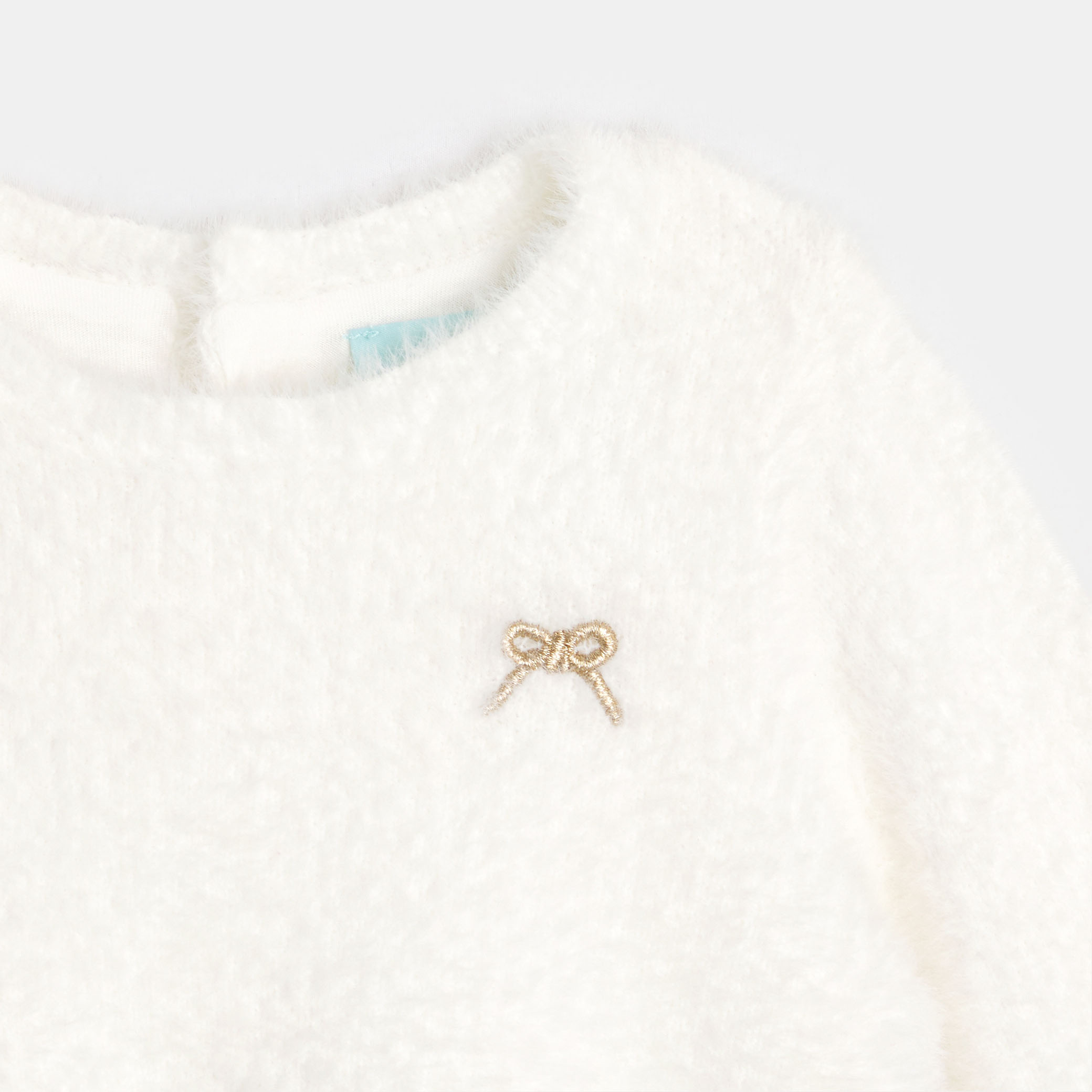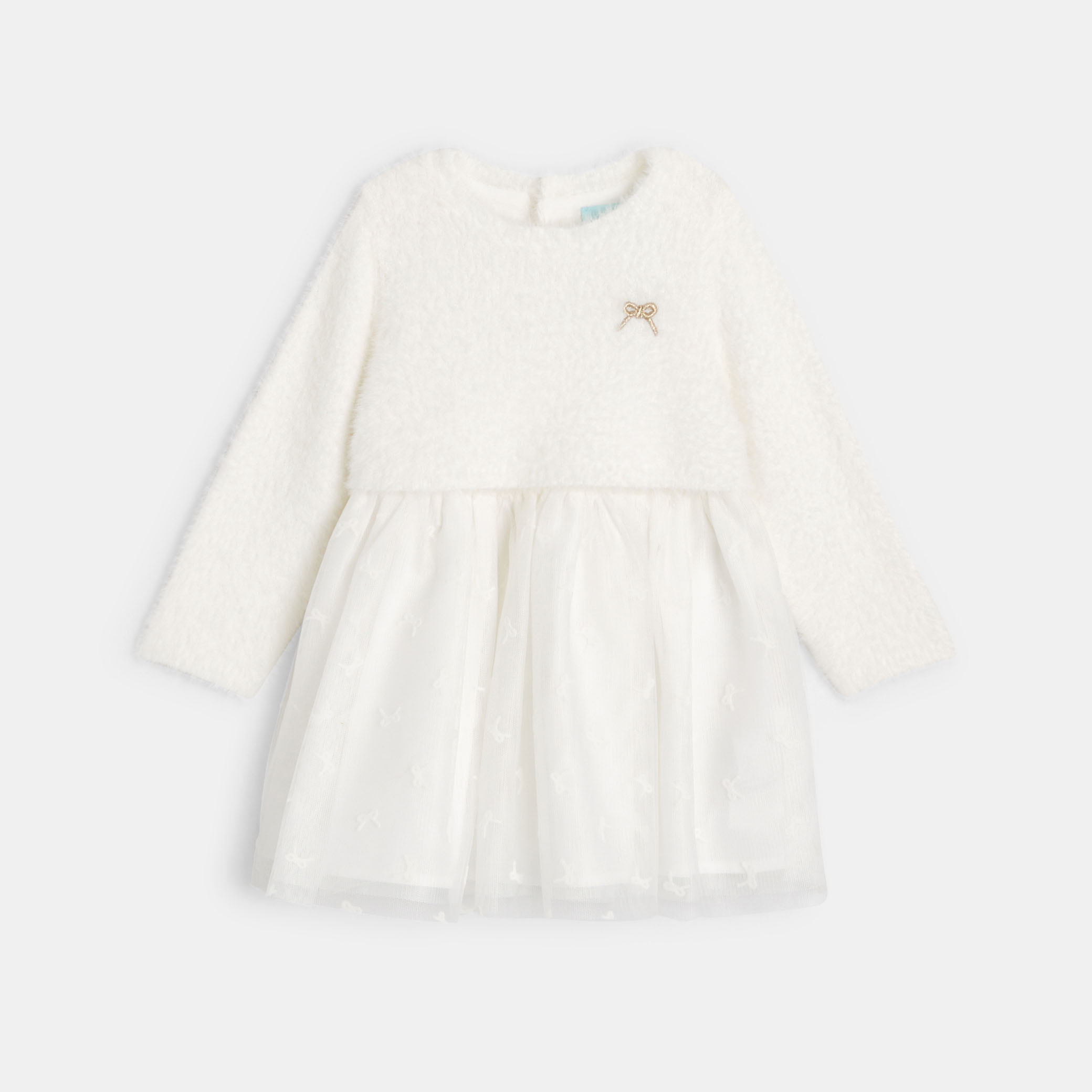 Предложете неустоима елегантност с тази бяла рокля с дълъг ръкав от мека плетка букле. Пълната пола от деликатен тюл е с фини бродирани мотиви. Шикозна малка панделка отпред добавя завършващ щрих. Идеална за специални поводи, тя е удобна и лесна за обличане.Състав