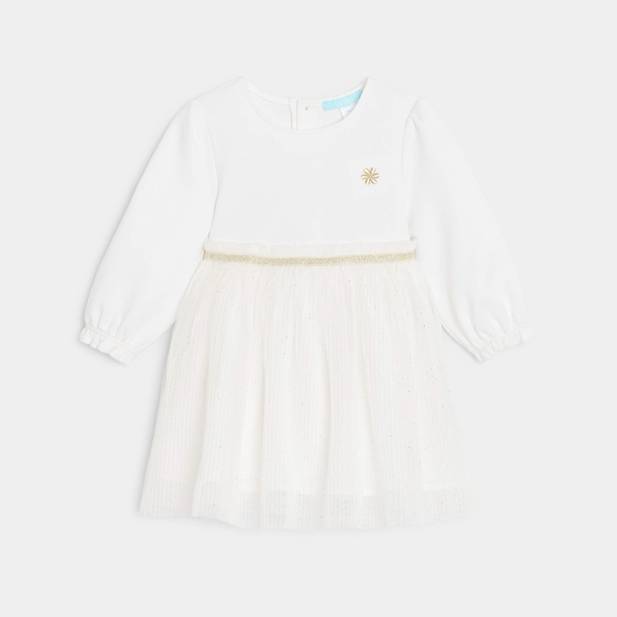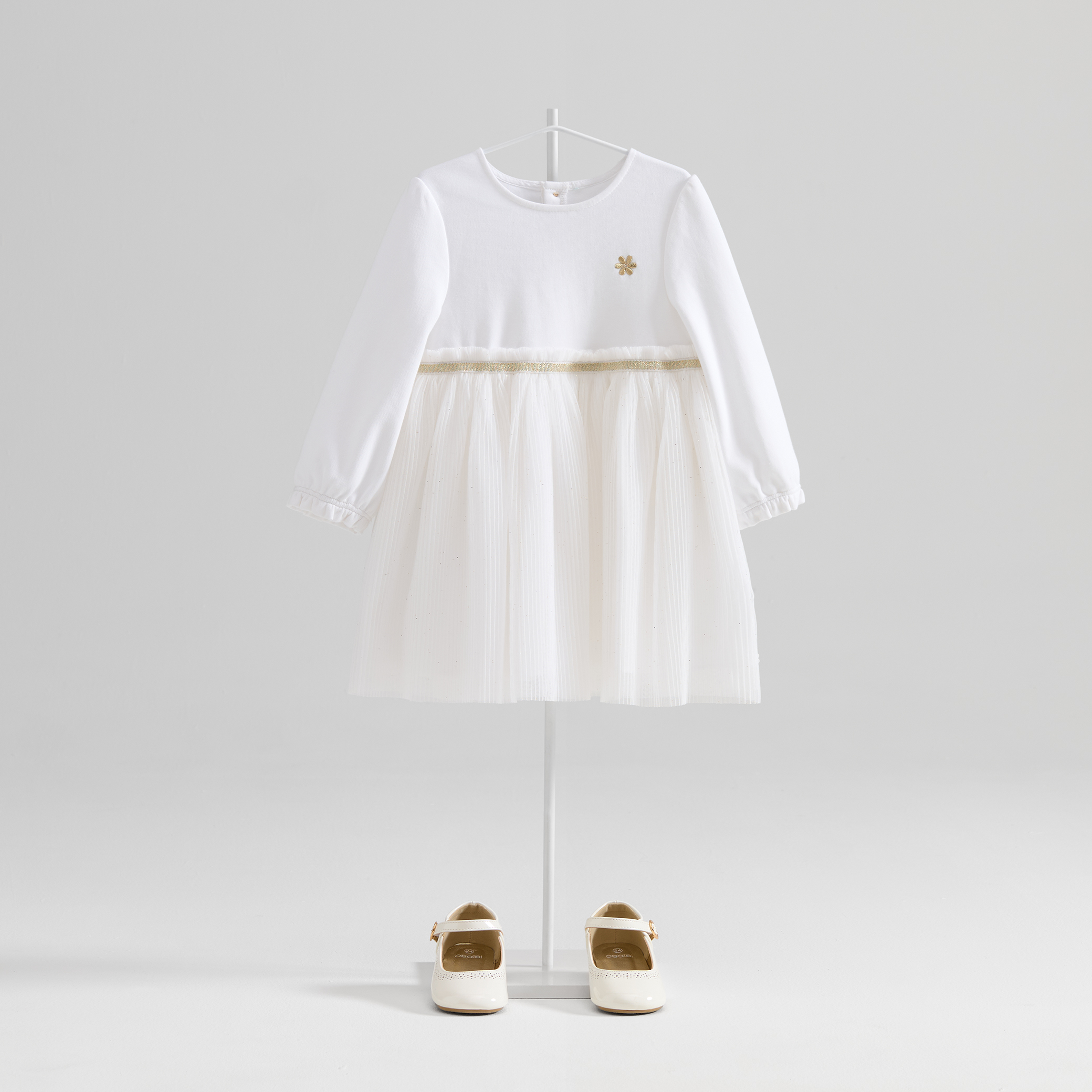 Тази прекрасна бяла рокля със сигурност ще зарадва всяко момиче: мек плетен топ с дълъг ръкав и блестяща тюлена пола. Преливащ се колан пристяга талията, добавяйки нотка блясък. Идеална за специални поводи, тя съчетава елегантност и комфорт с деколте с копчета за лесно обличане.Състав