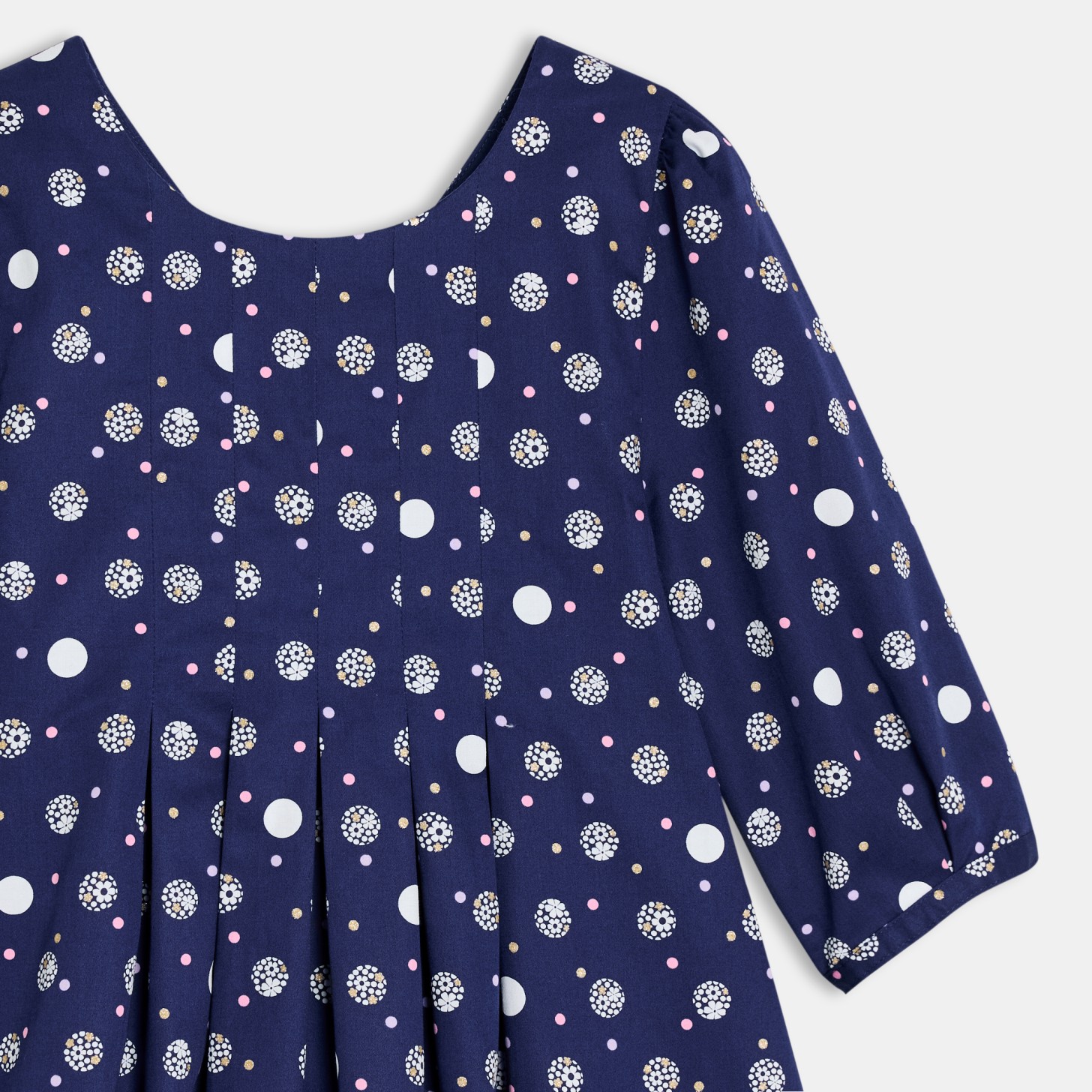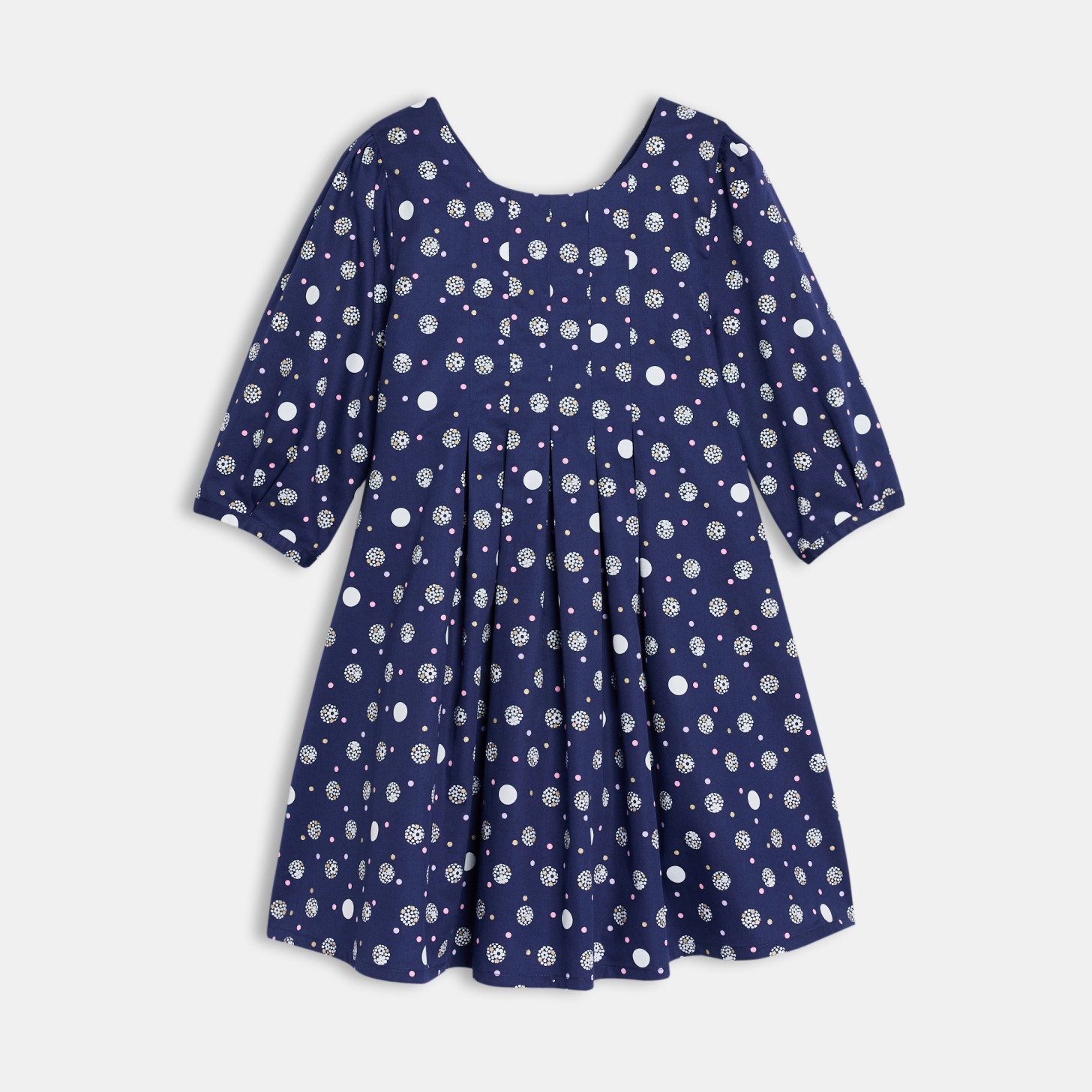 Невъзможно е да устоите на тази синя рокля с бели точки и флорален принт! Буфан ръкавите с дължина три четвърти и деликатно плисираната разкроена кройка ѝ придават чар и елегантност. Изработена от памук за оптимален комфорт, тя е идеална както за специални поводи, така и за слънчеви дни. Има кръгло деколте и е лесна за обличане.