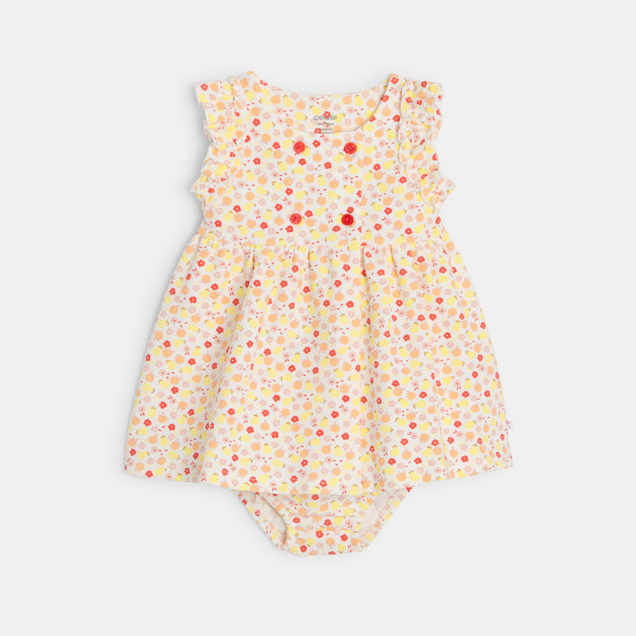 Влюбете се в тази очарователна бебешка рокля с флорален принт! Изработена от мек трикотаж, тя е с разкроена кройка за максимален комфорт. Червените копчета на горнището и воланите с презрамки добавят нотка на екстравагантност. Перфектна за ежедневно носене, тя съчетава стил и комфорт.Състав