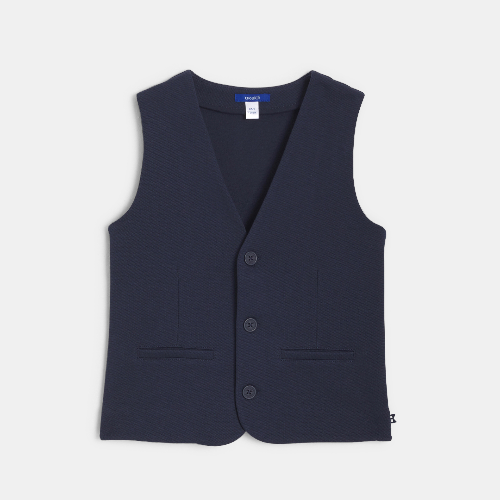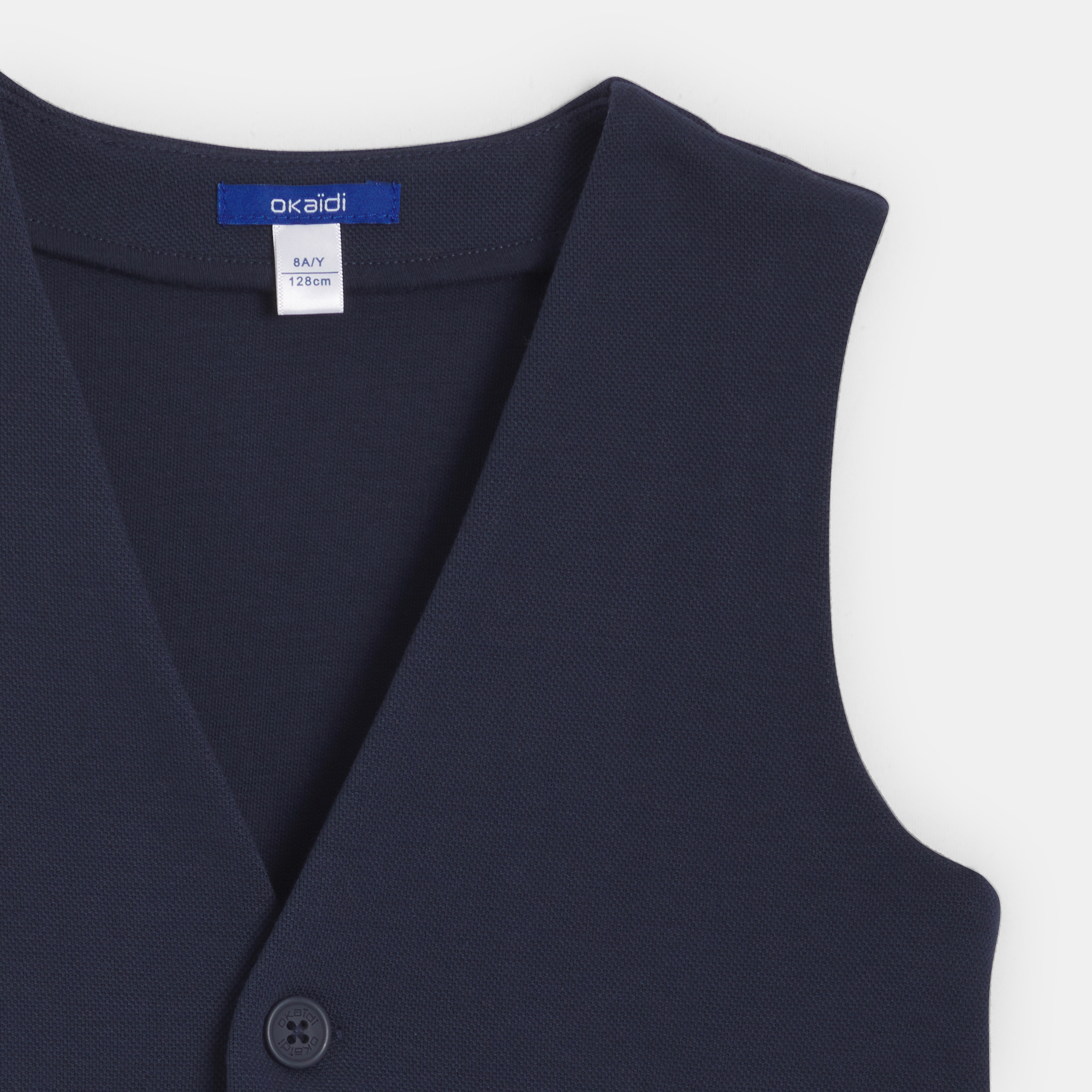 Този тъмносин елек е задължителен за шикозен външен вид. С вталена кройка и изработен от мека, еластична плетка, той се закопчава с елегантно копче отпред. Два джоба с капаци добавят практичност. Идеален за специални поводи, той гарантира както комфорт, така и изискан стил. V-образно деколте.Състав