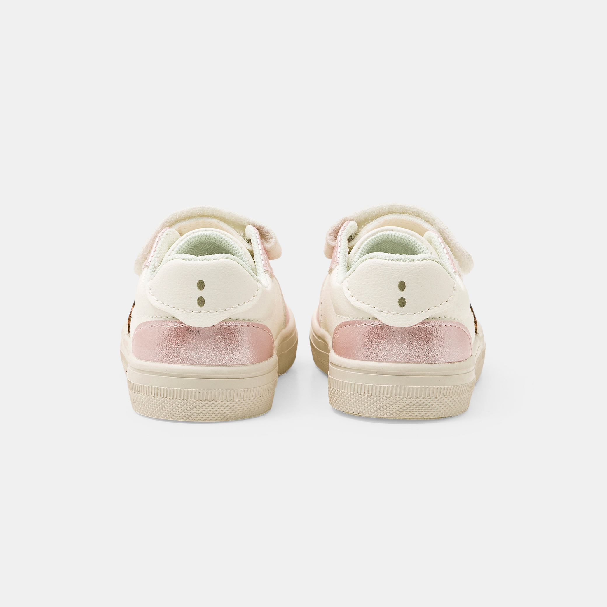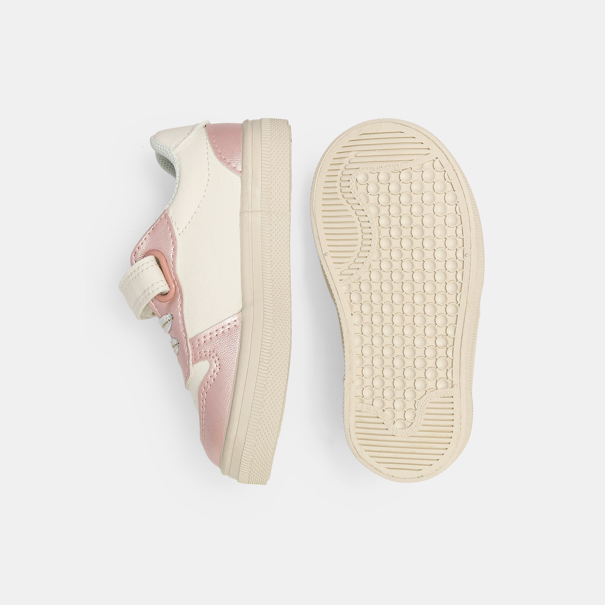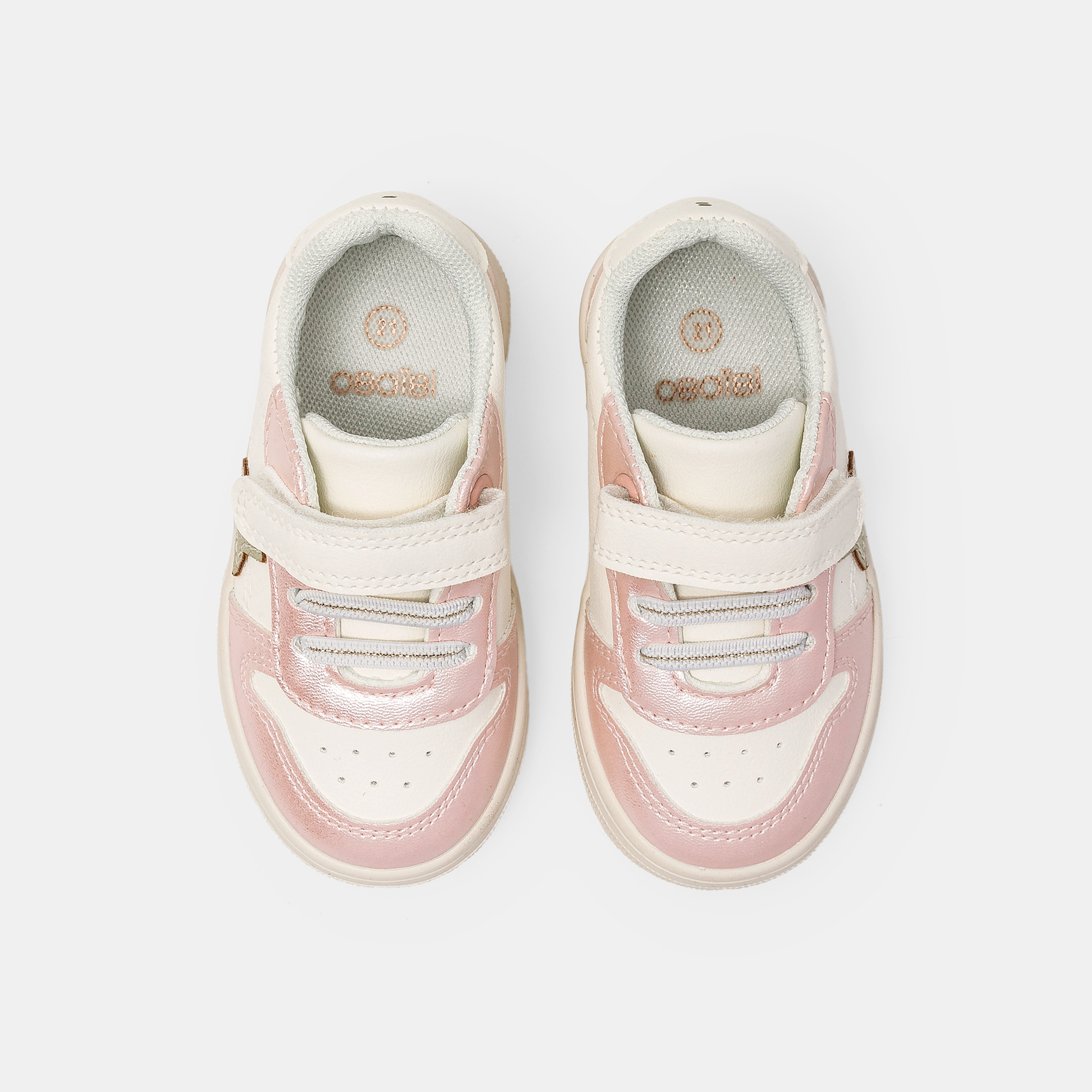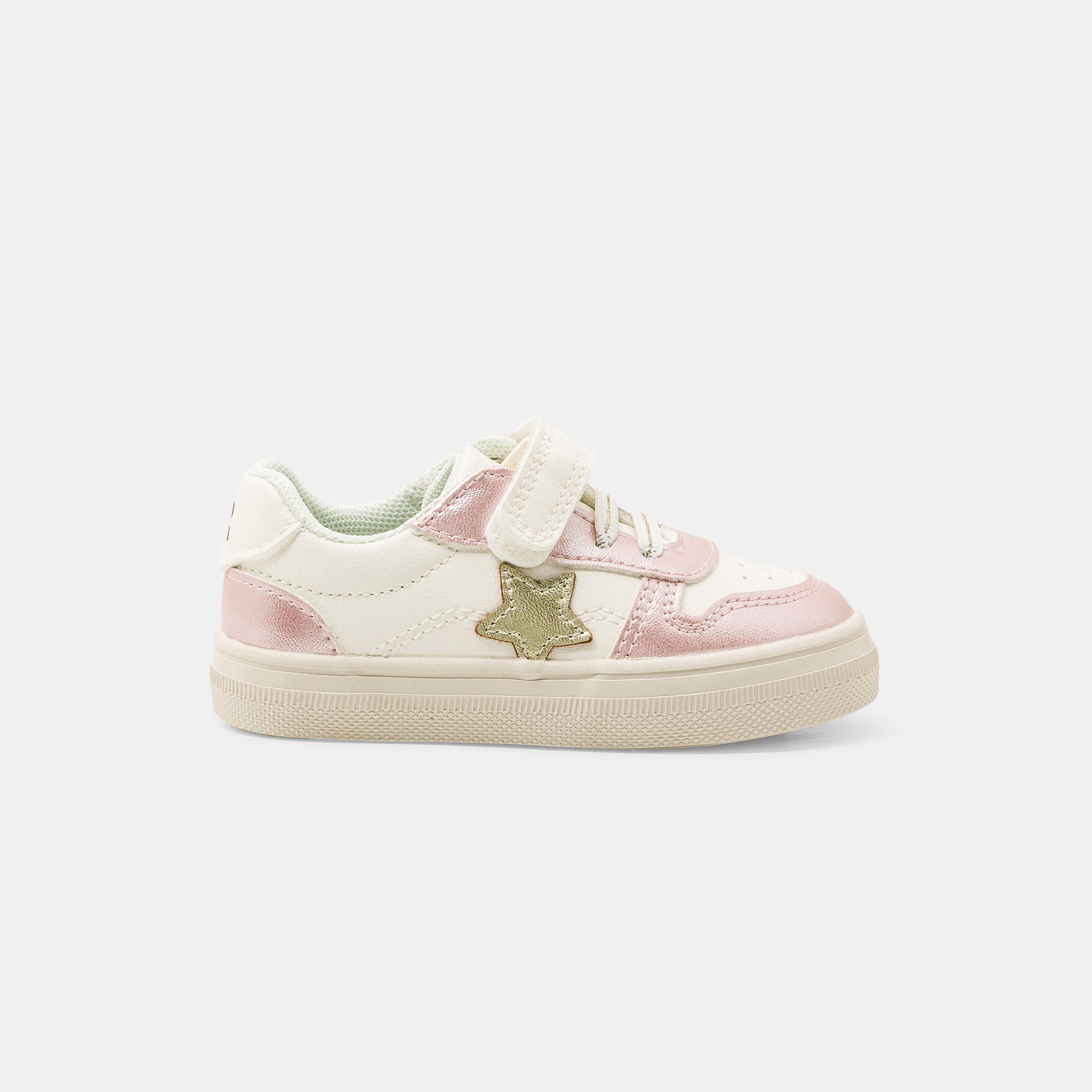 Тези розови маратонки съчетават стил и комфорт с преливащи се детайли. Удобното закопчаване с велкро ги прави лесни за обуване. Гъвкавата подметка е идеална за ежедневно носене. Златна звезда отстрани добавя забавен щрих. Идеални за игриви излизания, те предлагат перфектна опора за активните малки крачета.Състав