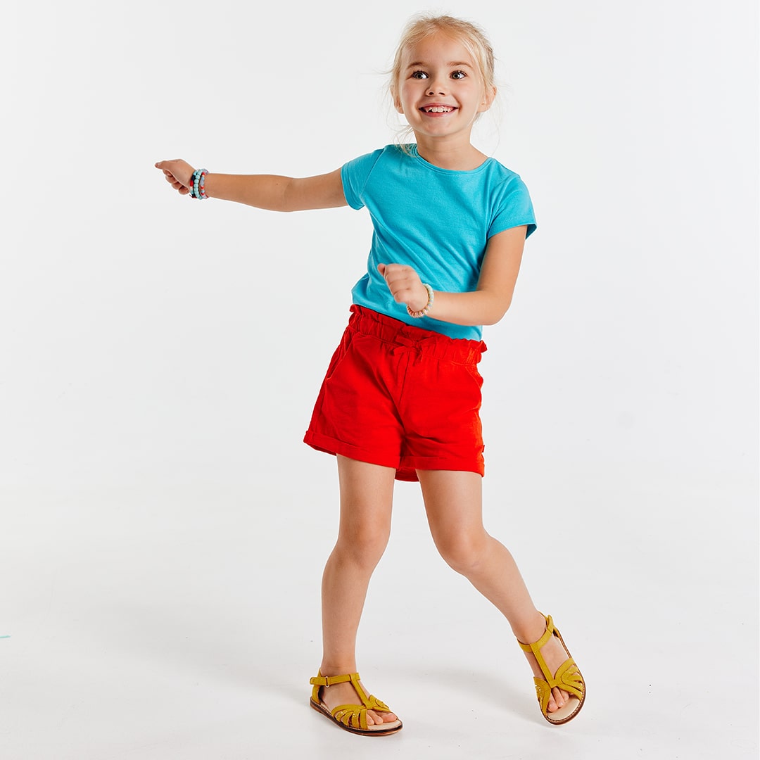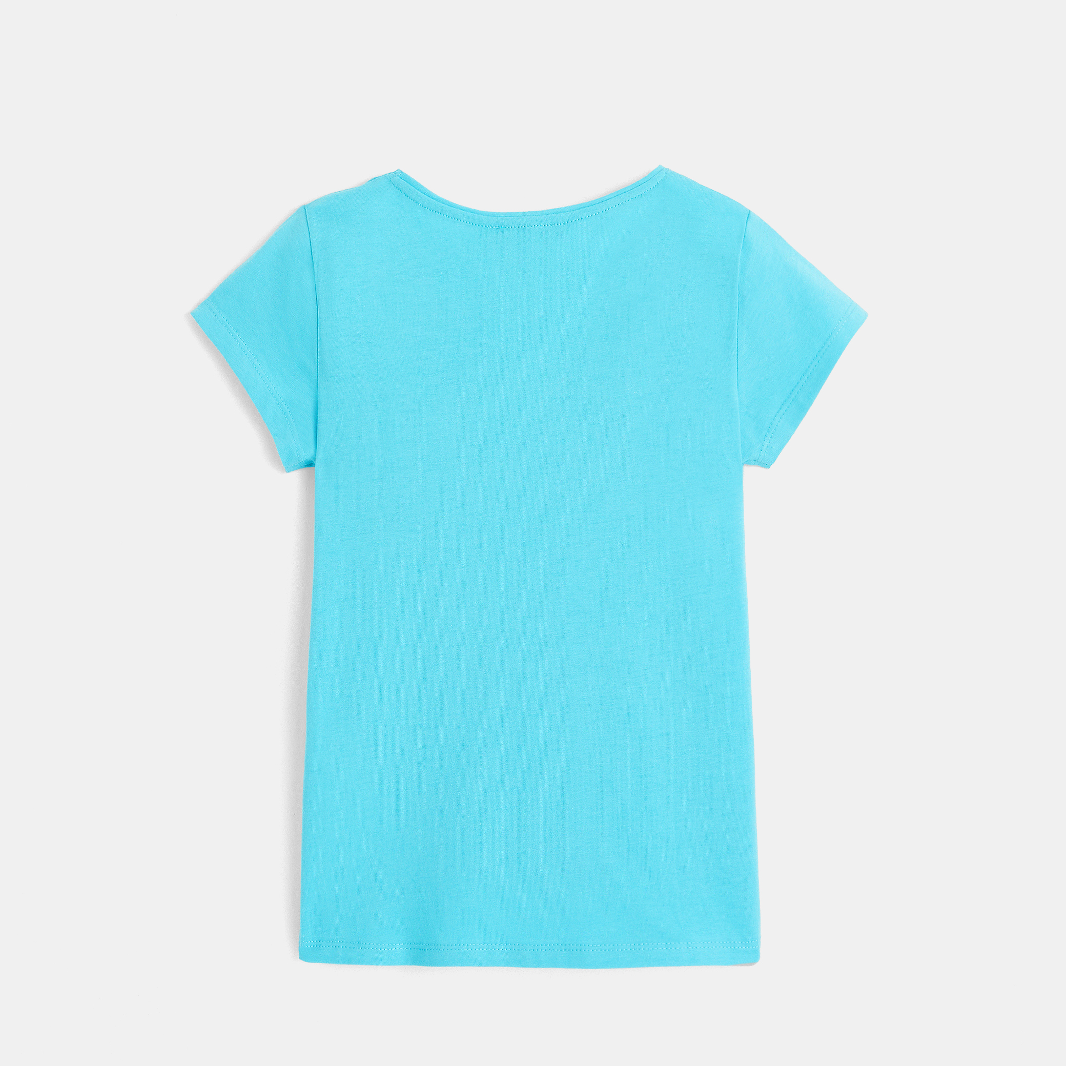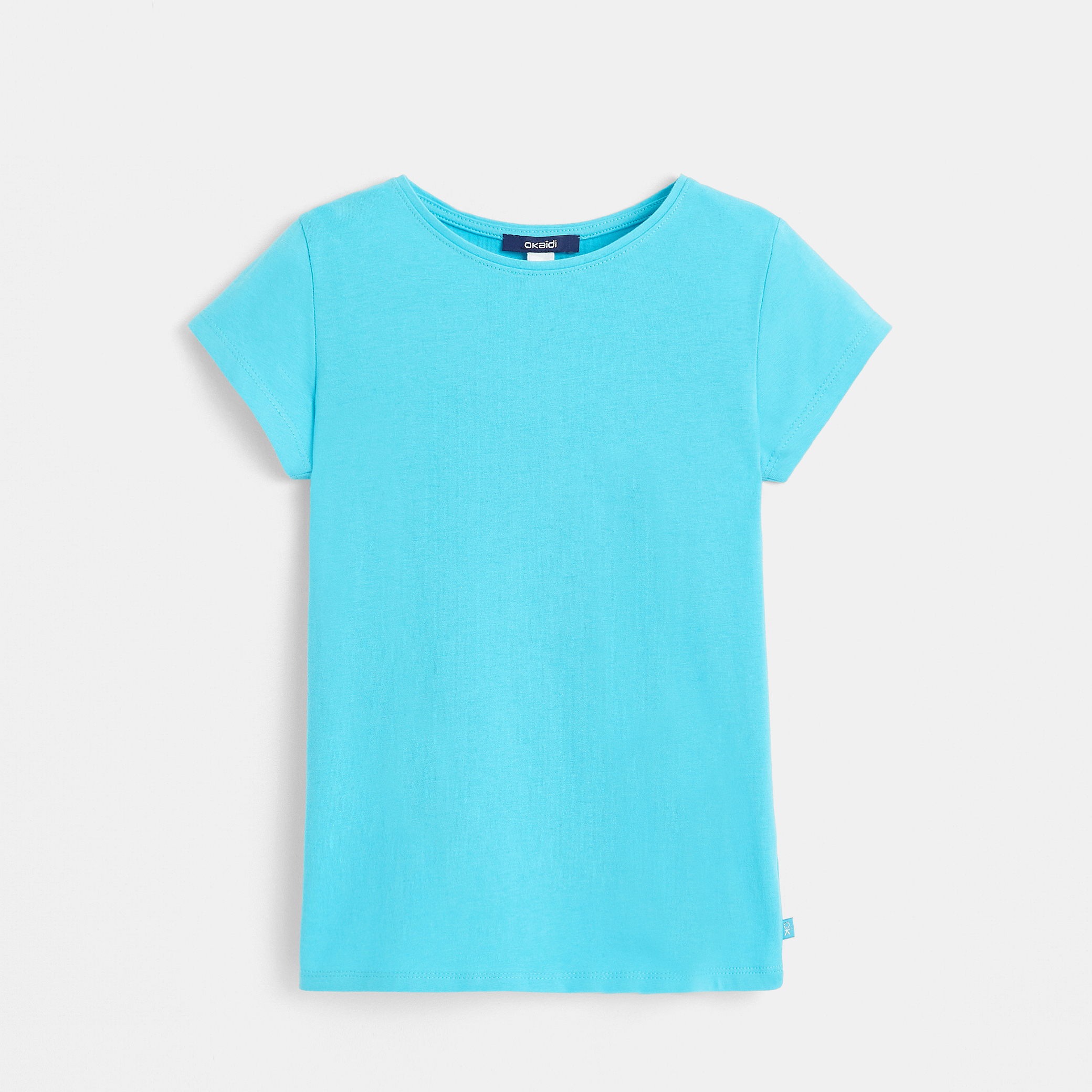 Триколка за момичета. Меко и леко разтегливо памучно трико. Изправена кройка. Кръгло деколте, малък оребрен кант, лесно обличане. Околовръстен кант от вътрешната страна на яката. Къси ръкави. Леко заоблен подгъв. Завършек с горен шев. Малък етикет Okaïdi.